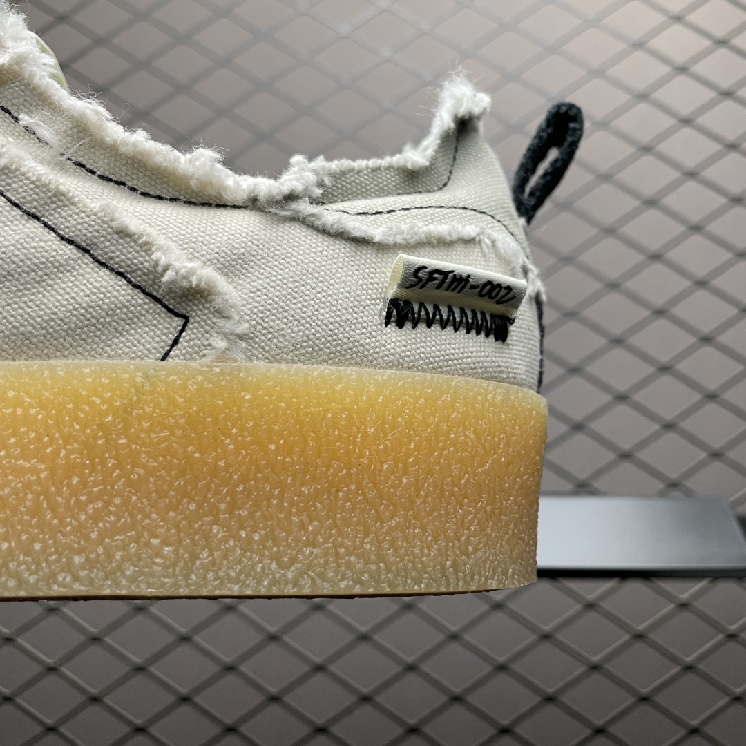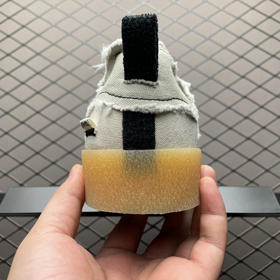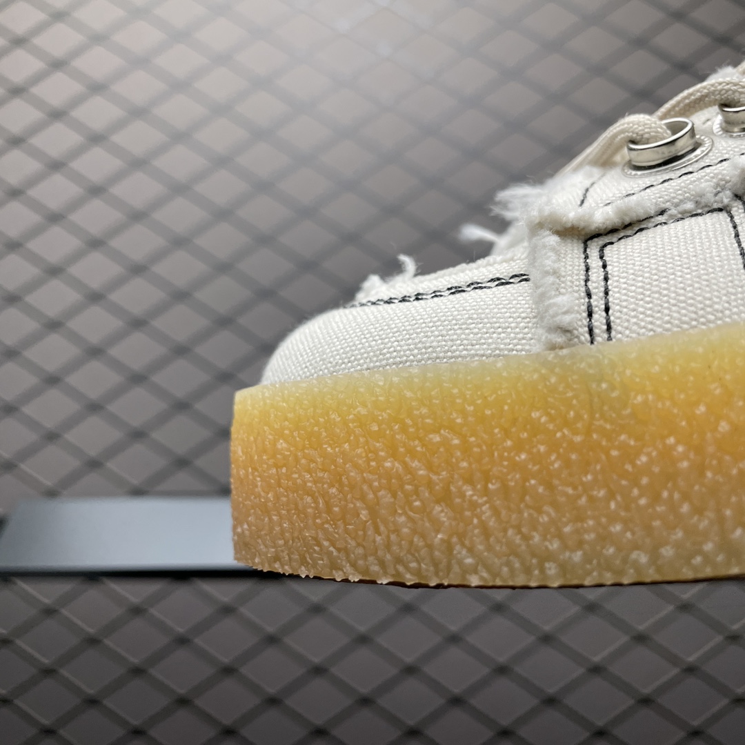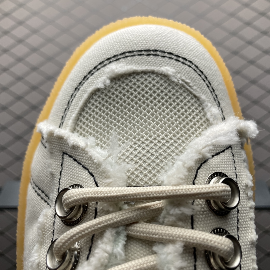 La tige de la chaussure est confectionnée en suède de haute qualité, offrant une texture douce et un aspect luxueux. La couleur principale, un blanc cassé subtilement nuancé, confère une élégance discrète et polyvalente, idéale pour diverses occasions. Les détails distinctifs incluent des coutures apparentes et des finitions brutes, caractéristiques du style avant-gardiste de Song for the Mute.