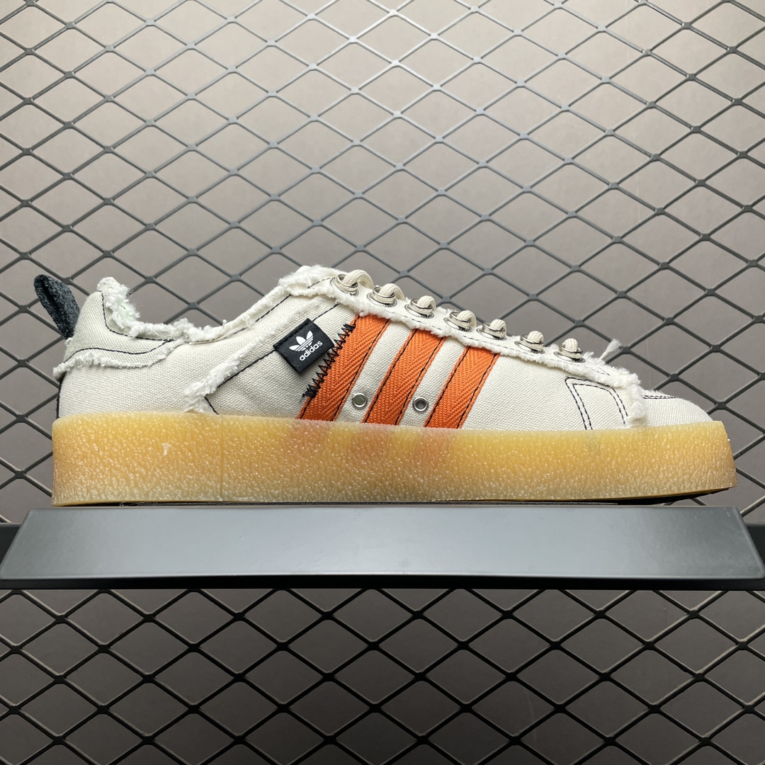 Les trois bandes emblématiques d’adidas sont présentes sur les côtés, mais dans une version ton sur ton qui s’intègre harmonieusement au design global. Le logo de la collaboration est discrètement apposé sur la languette et le talon, ajoutant une touche de distinction sans compromettre l’esthétique minimaliste.