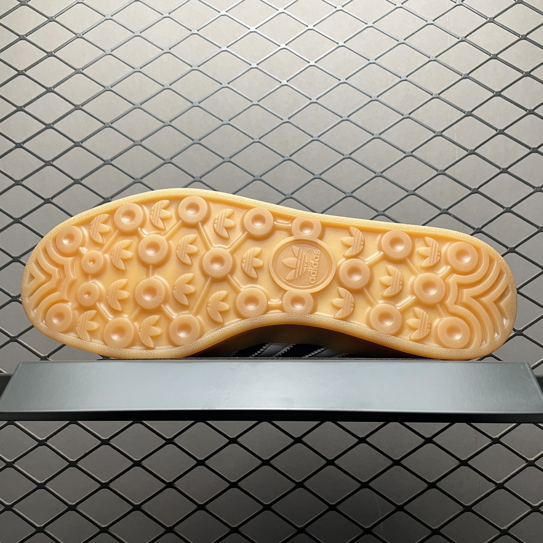 Les trois bandes emblématiques d’Adidas sur les côtés sont présentées en blanc, contrastant harmonieusement avec le noir de la tige, ajoutant une touche distinctive et reconnaissable à la chaussure. La languette et le talon arborent également le logo Adidas, renforçant l’identité de la marque.