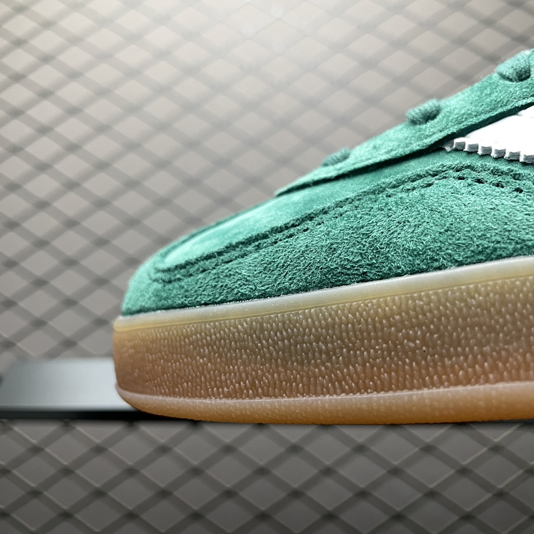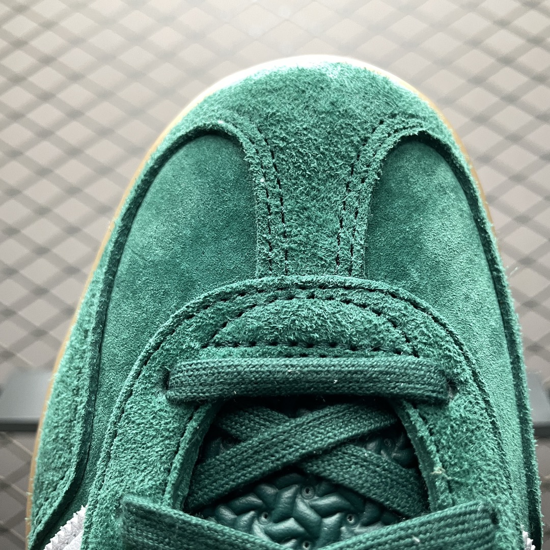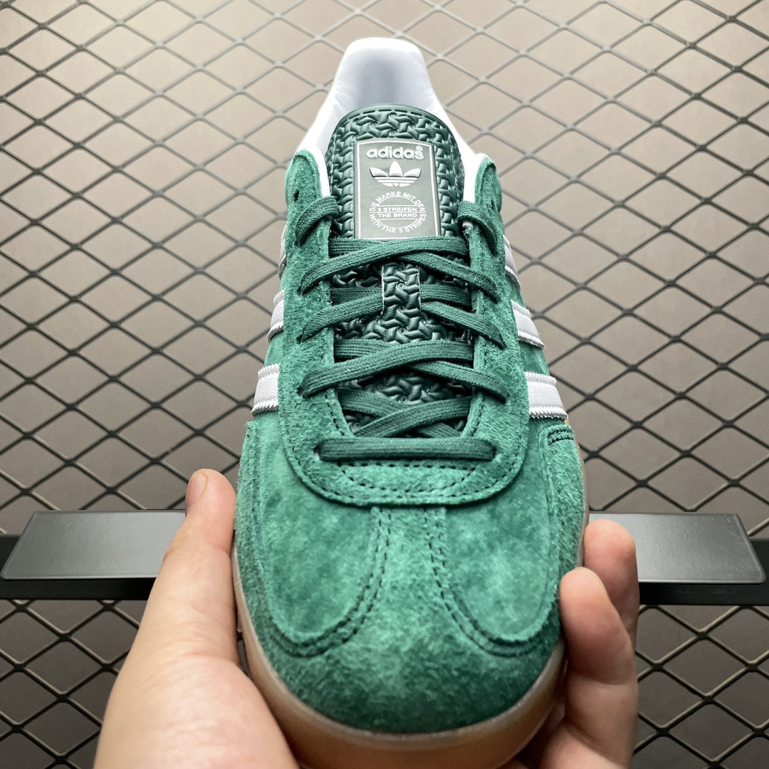 La chaussure adidas Gazelle Indoor Collegiate Green Gum IG1596 est un modèle de sneakers bas qui combine style rétro et confort moderne. La tige est fabriquée en suède de couleur verte « Collegiate Green », offrant une texture douce et un look vintage. Les trois bandes emblématiques d’adidas sur les côtés sont en cuir, contrastant élégamment avec la tige en suède.
