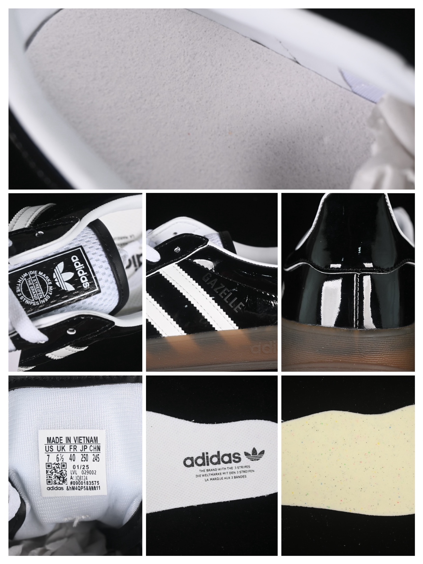 La tige est fabriquée en cuir verni noir de haute qualité, offrant une finition brillante et luxueuse qui attire le regard. Ce matériau confère non seulement une esthétique raffinée, mais assure également une durabilité accrue, idéale pour un usage quotidien. Les détails emblématiques des Gazelle, tels que les trois bandes latérales et le logo trèfle, sont subtilement intégrés, ajoutant une touche de tradition à ce modèle contemporain.