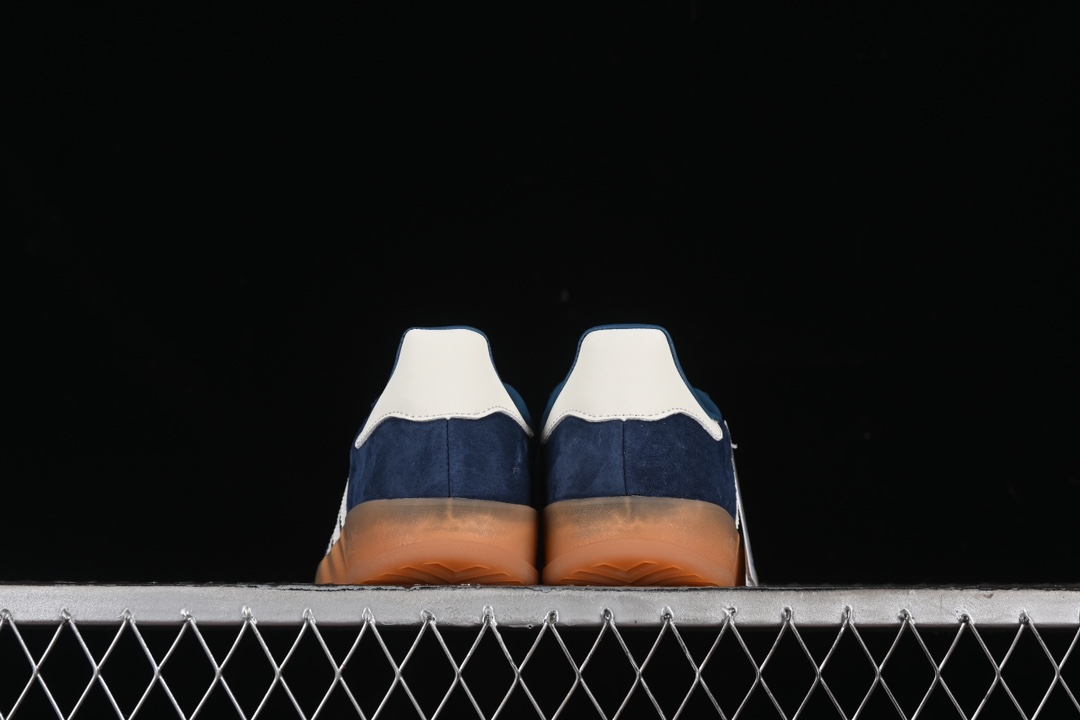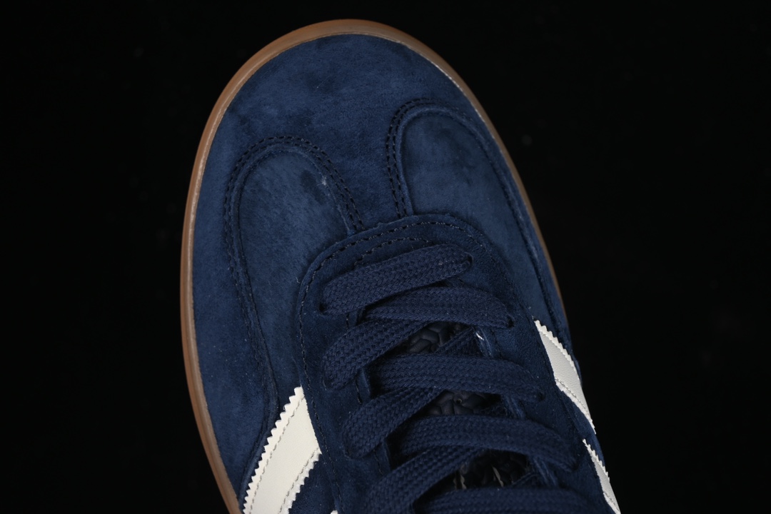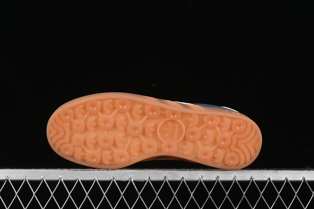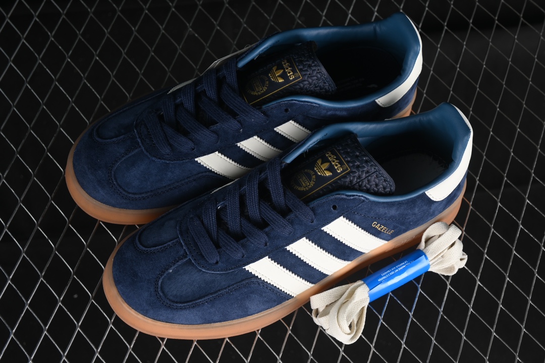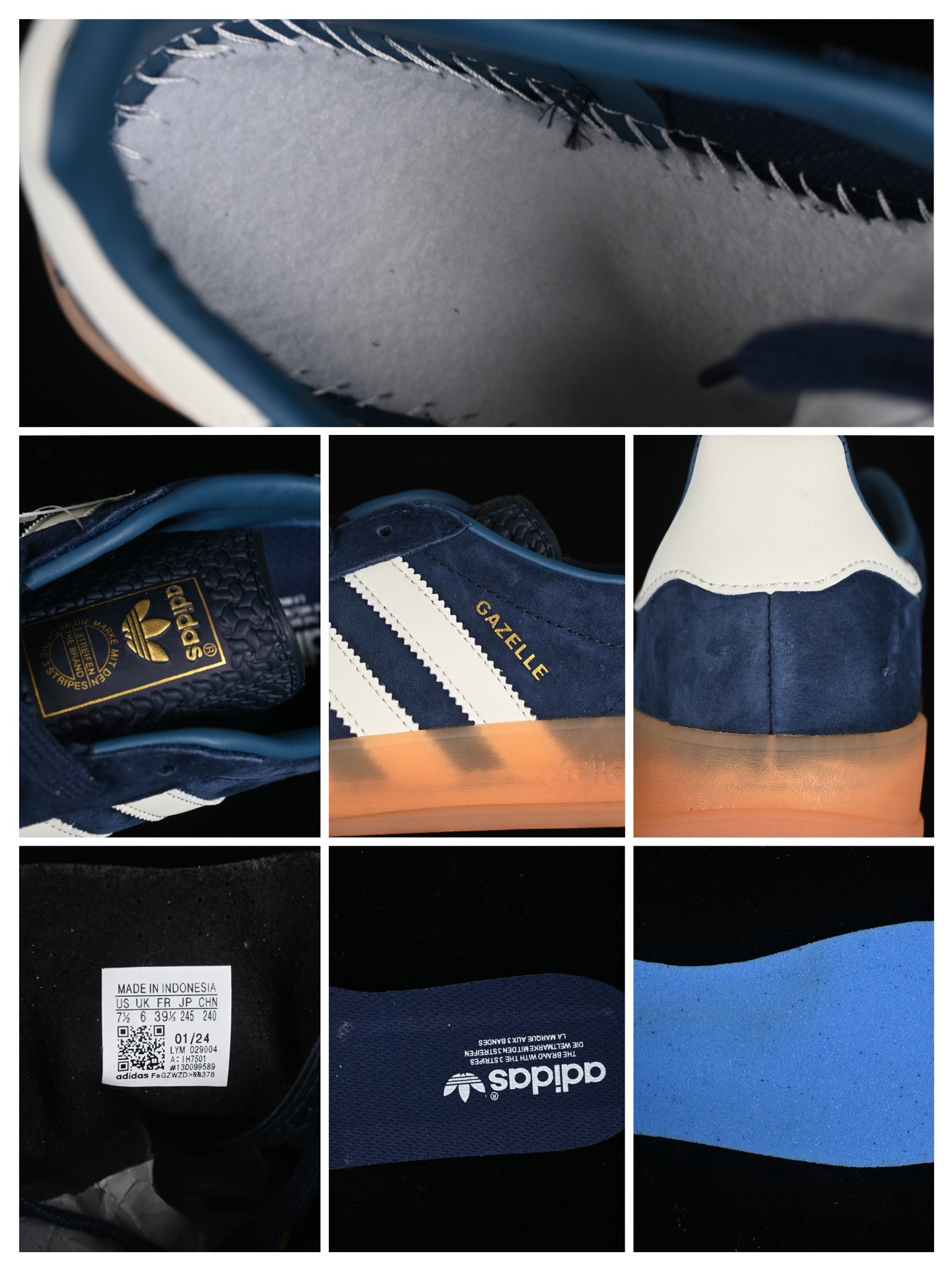 La tige des Gazelle Indoor est réalisée en suède de couleur Legend Ink, un bleu marine profond qui confère une allure sophistiquée et polyvalente. Ce matériau assure non seulement une durabilité exceptionnelle, mais aussi une sensation de douceur au toucher. Les détails en Wonder Beige, notamment les trois bandes emblématiques d’adidas sur les côtés et le talon, ajoutent un contraste subtil et raffiné, rehaussant l’apparence générale de la chaussure.