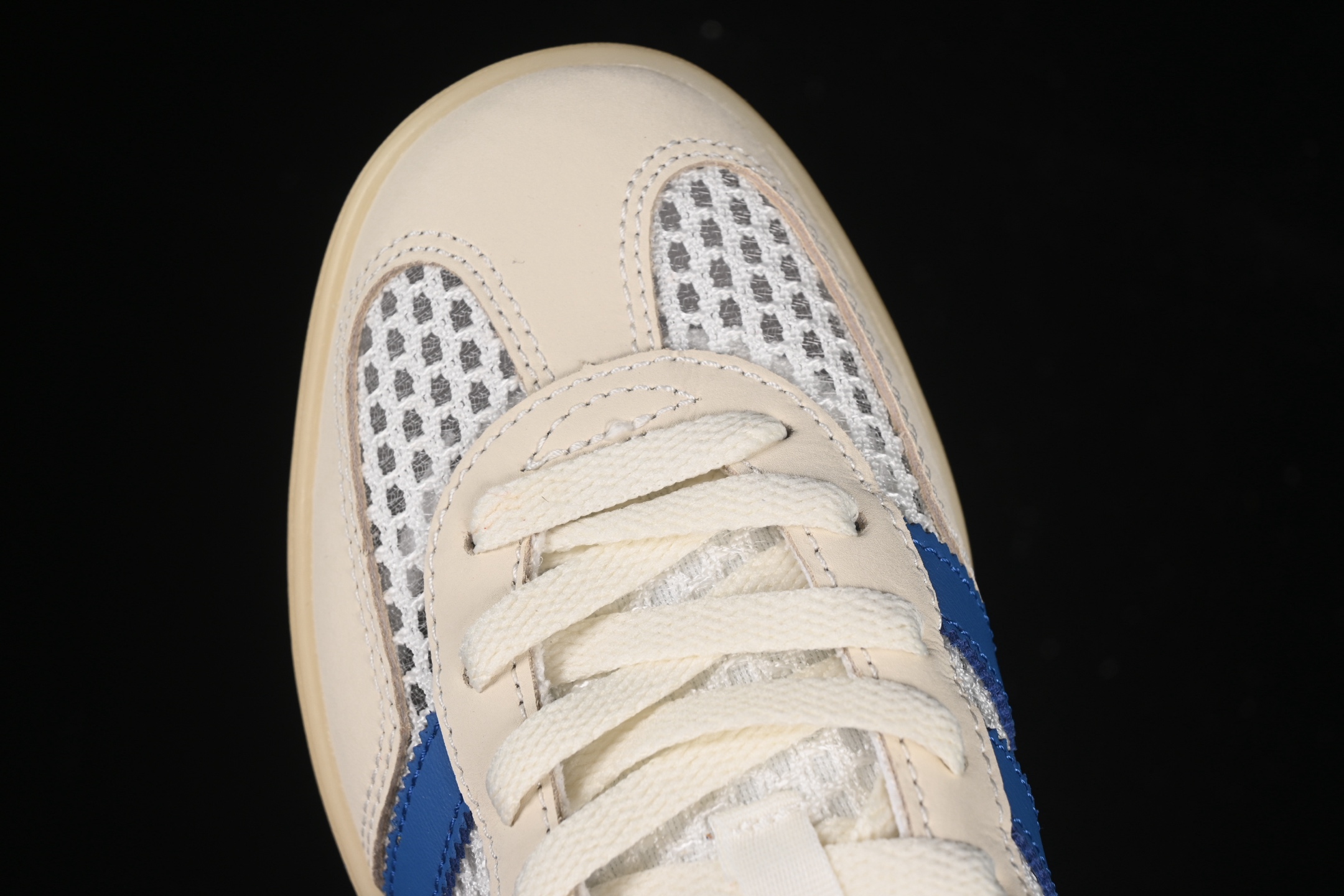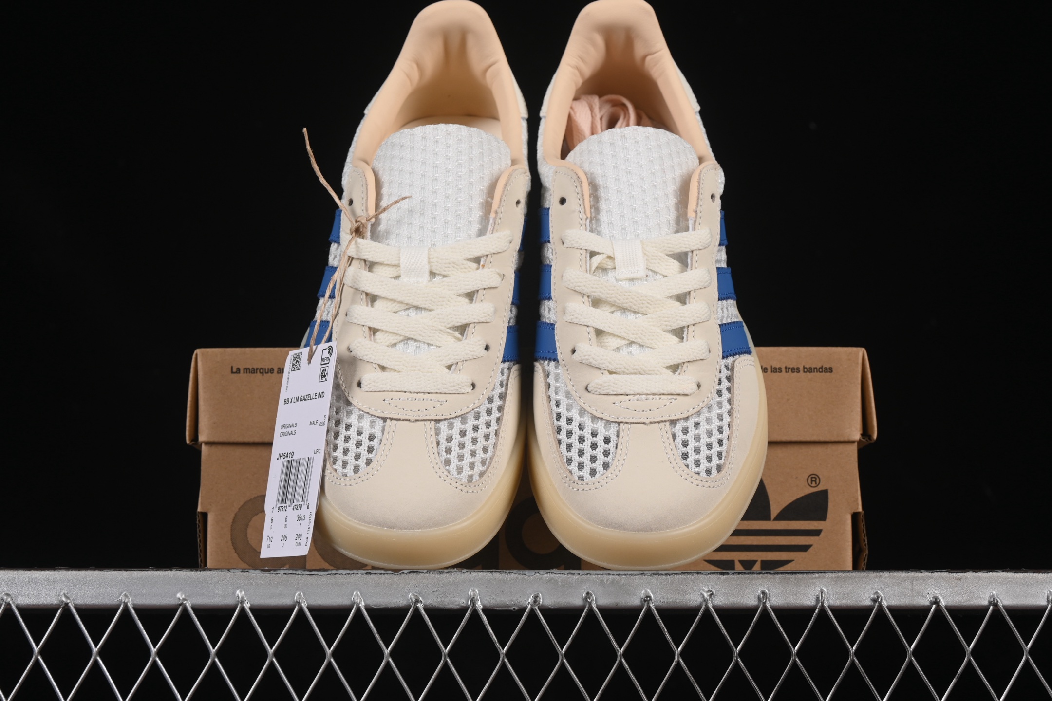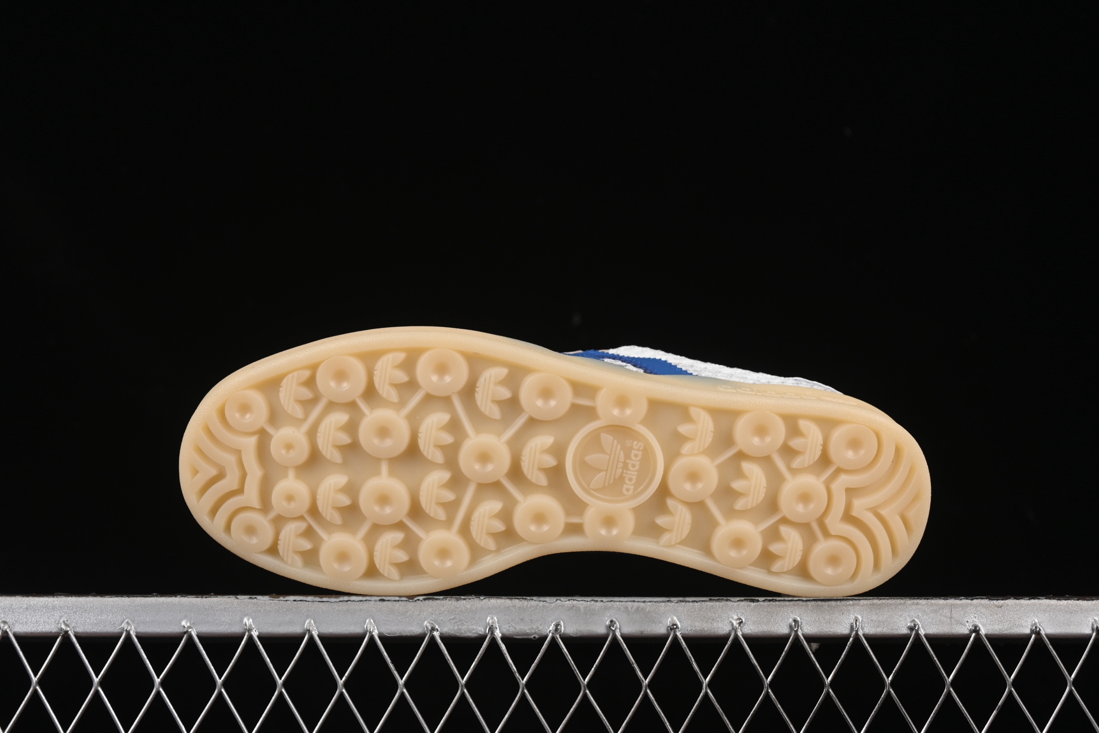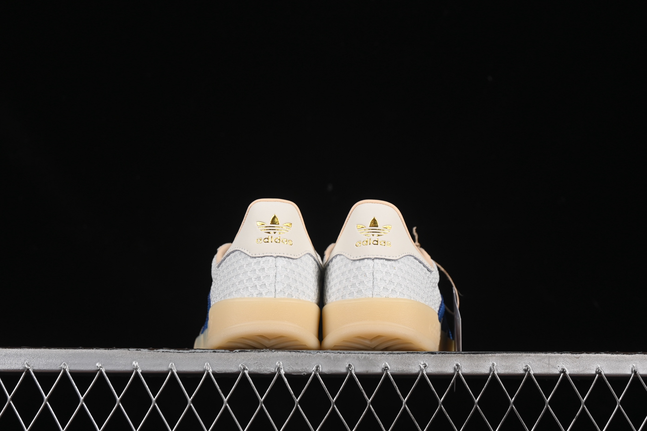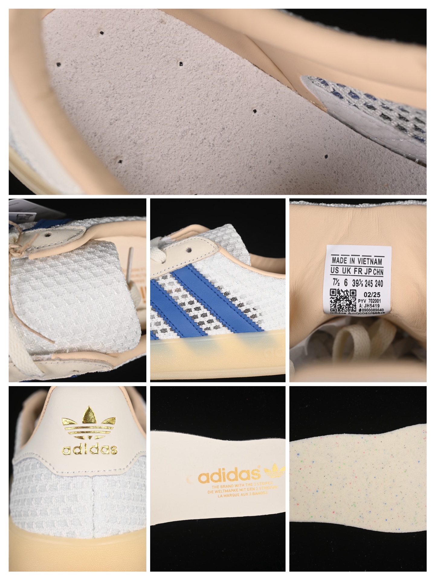 La tige de la chaussure est confectionnée en daim de haute qualité, offrant une texture douce et un aspect luxueux. La couleur « Off White » confère à la sneaker une allure sobre et polyvalente, idéale pour s’associer avec une variété de tenues. Les détails en « Focus Blue » ajoutent une touche de couleur vive et contrastée, notamment sur les trois bandes emblématiques d’Adidas et le talon, apportant une dimension dynamique au design.