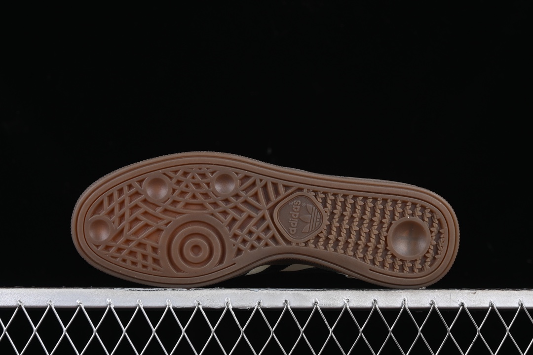 La partie supérieure de la chaussure est fabriquée en suède de haute qualité, offrant durabilité et confort. La couleur principale est le blanc (Wonder White), accompagnée de détails noirs, notamment les trois bandes emblématiques d’adidas sur les côtés, ce qui crée un contraste élégant et une reconnaissance immédiate de la marque.