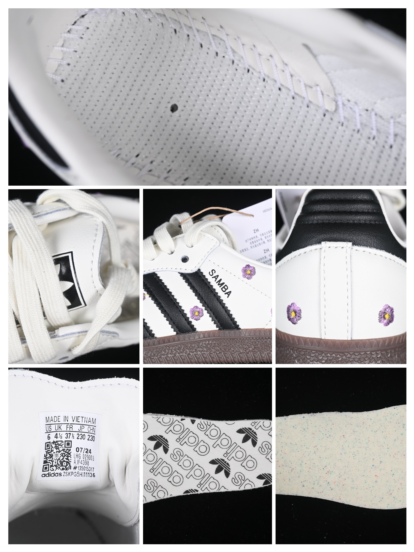 La semelle extérieure est généralement en caoutchouc gomme, ce qui est caractéristique des modèles Samba, offrant une bonne adhérence et durabilité. La semelle intermédiaire pourrait être équipée de la technologie de confort adidas, comme une semelle de propreté légèrement rembourrée, pour un soutien accru et un confort tout au long de la journée.