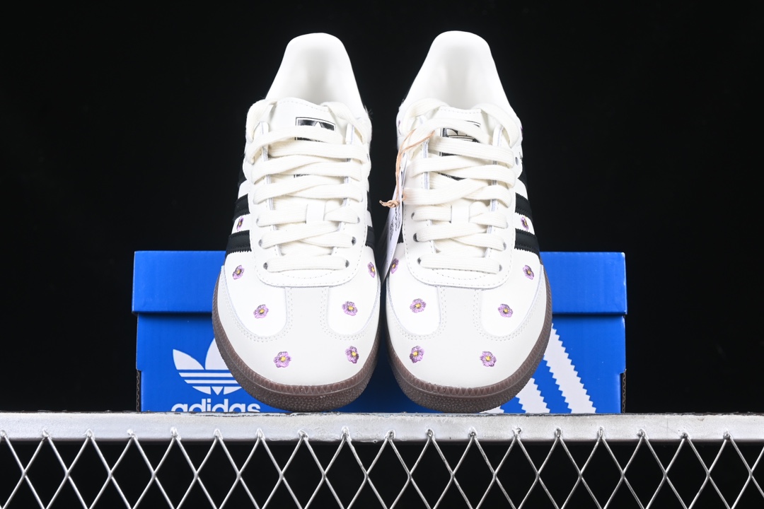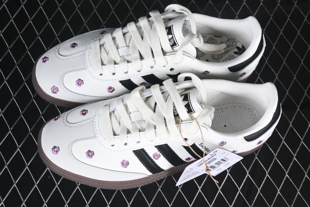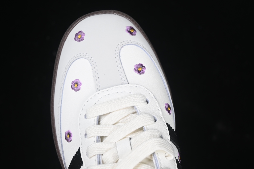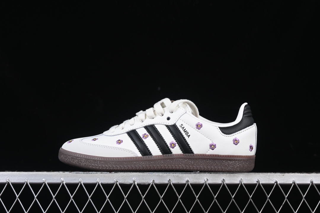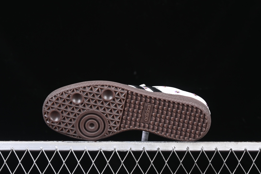La chaussure présente une tige en cuir de couleur violet clair, ornée de motifs floraux qui lui confèrent une touche féminine et printanière. Les trois bandes emblématiques d’adidas sur les côtés sont discrètement intégrées et se fondent harmonieusement avec le design floral. La languette et le talon peuvent afficher un logo adidas en relief, ajoutant une touche de branding subtile mais reconnaissable.