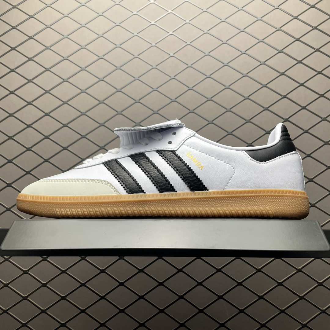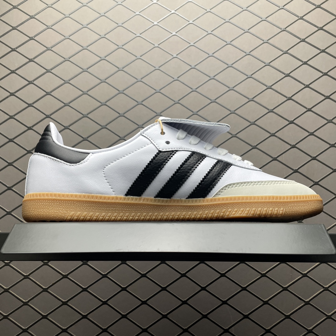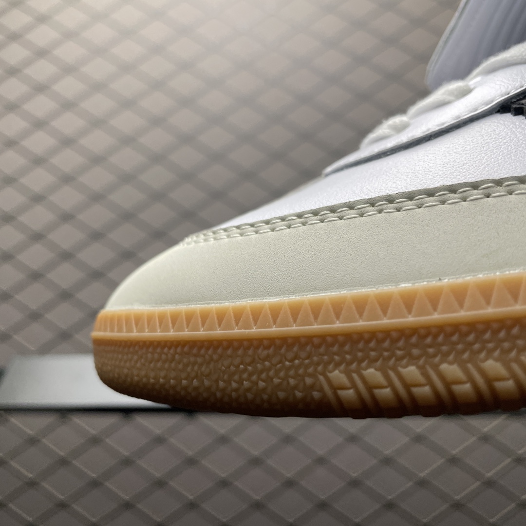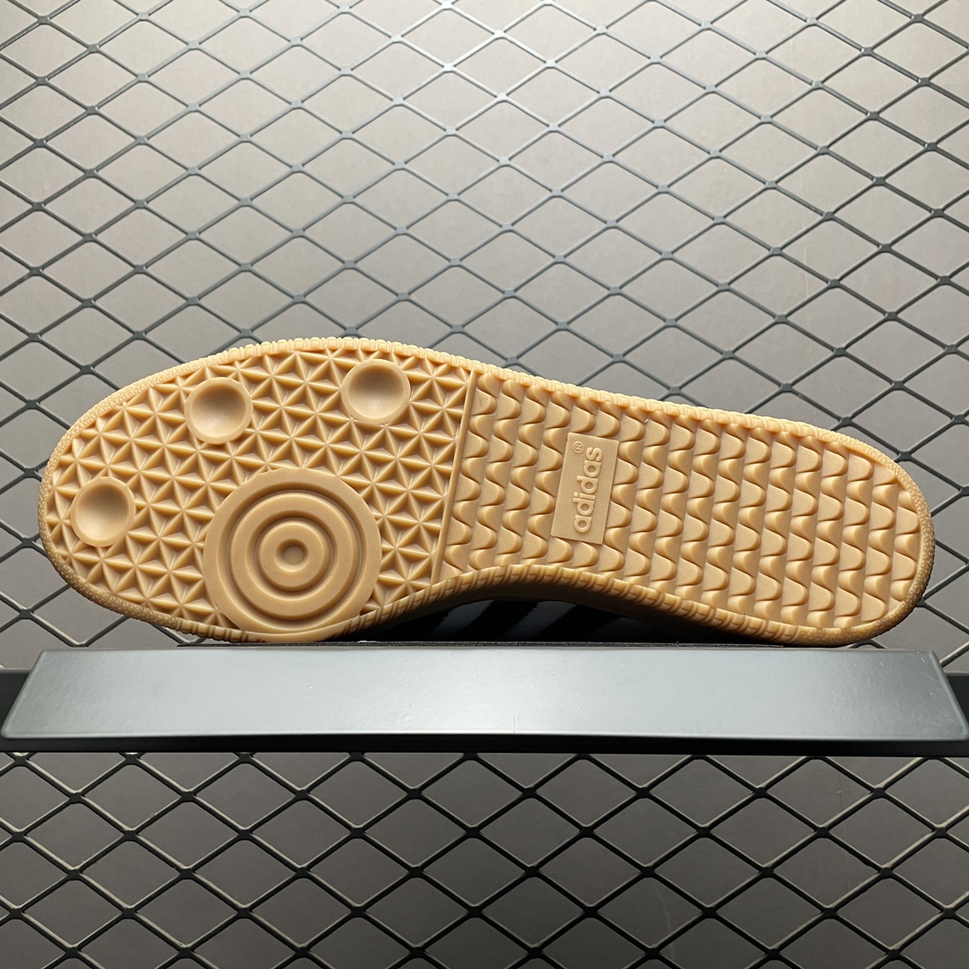 Le design inclut également une languette classique avec le logo adidas, et le nom « Samba » en doré sur le côté, ajoutant une touche d’élégance et d’authenticité. La semelle intermédiaire légèrement surélevée offre un soutien supplémentaire et une meilleure absorption des chocs, ce qui rend cette chaussure adaptée à la fois pour le sport et pour le port quotidien en milieu urbain. Le choix des matériaux et la finition soignée garantissent une expérience confortable tout au long de la journée.