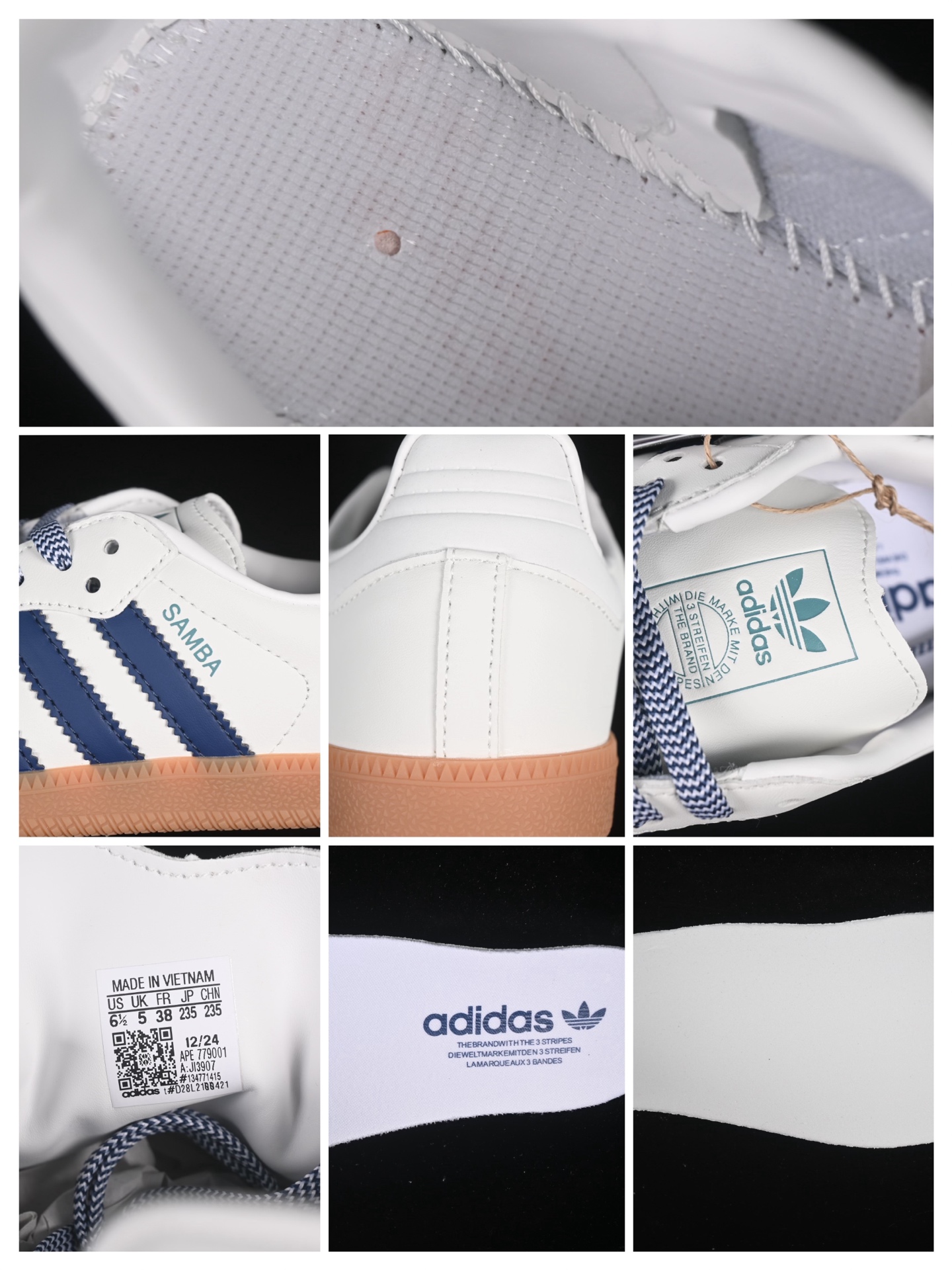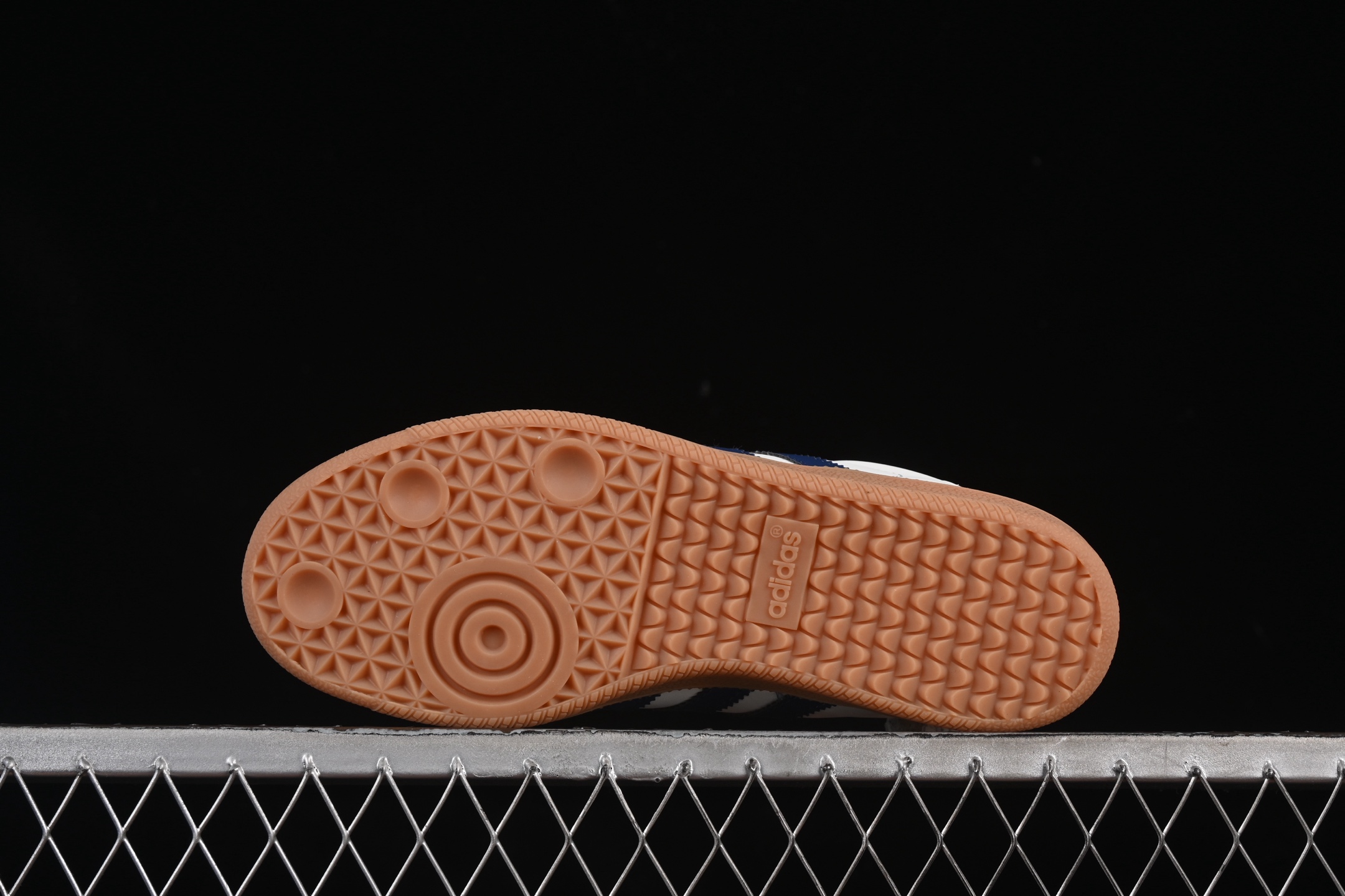Les adidas Samba Off White Dark Blue JI3907 sont une réinterprétation moderne et élégante de l’emblématique modèle Samba, initialement conçu pour le football en salle. Cette version se distingue par son esthétique raffinée et ses détails soignés. La tige est confectionnée en cuir de haute qualité, offrant une teinte blanc cassé qui confère une allure sobre et sophistiquée. Les empiècements en daim ajoutent une texture contrastante et renforcent la durabilité de la chaussure.