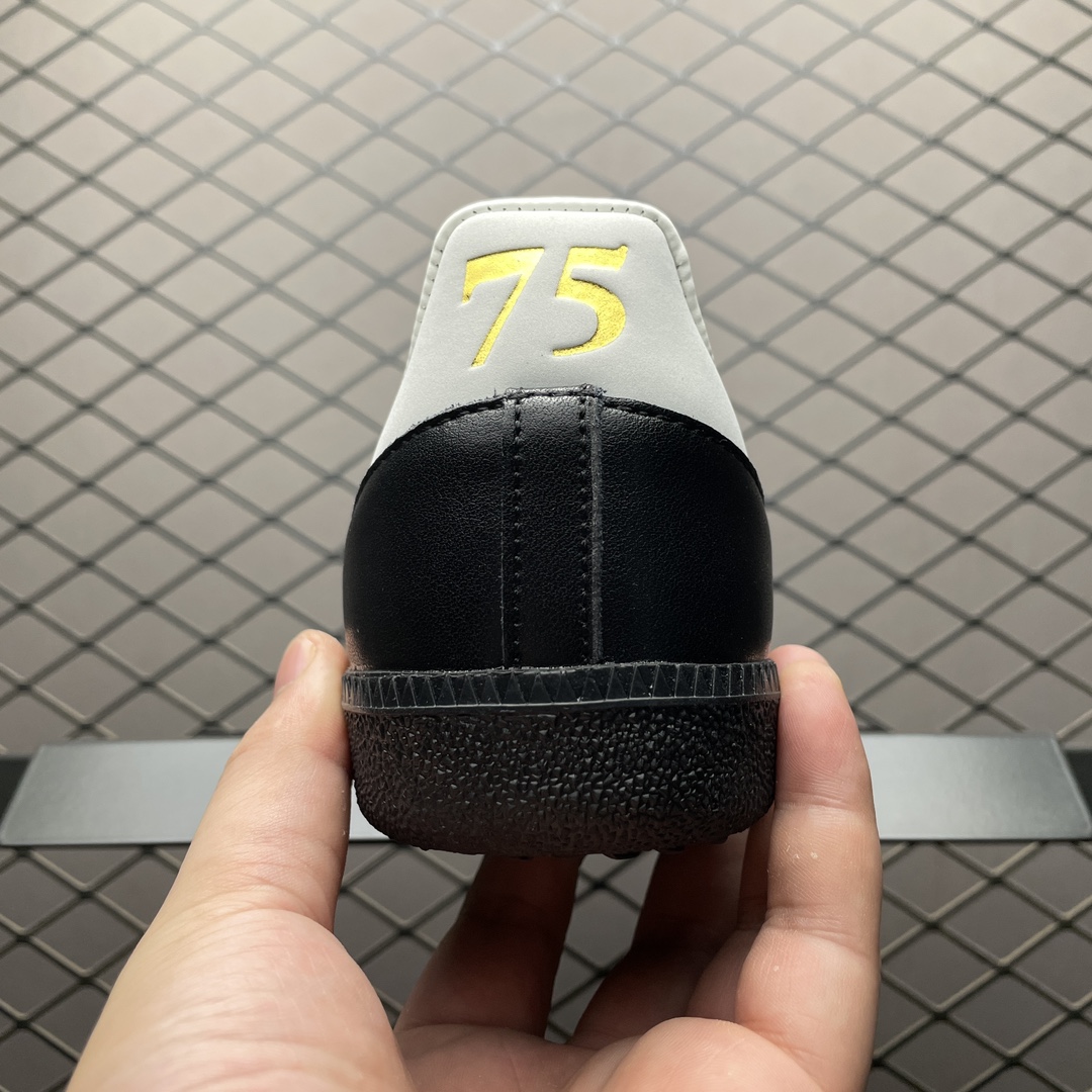 Le bout de la chaussure est renforcé, une caractéristique signature des Samba, conçu pour augmenter la résistance dans une zone souvent exposée à l’usure. La languette, également en cuir, porte le logo adidas Originals doré, tandis que le côté de la chaussure affiche le nom « Samba » en lettres dorées, soulignant l’aspect exclusif de cette édition anniversaire.