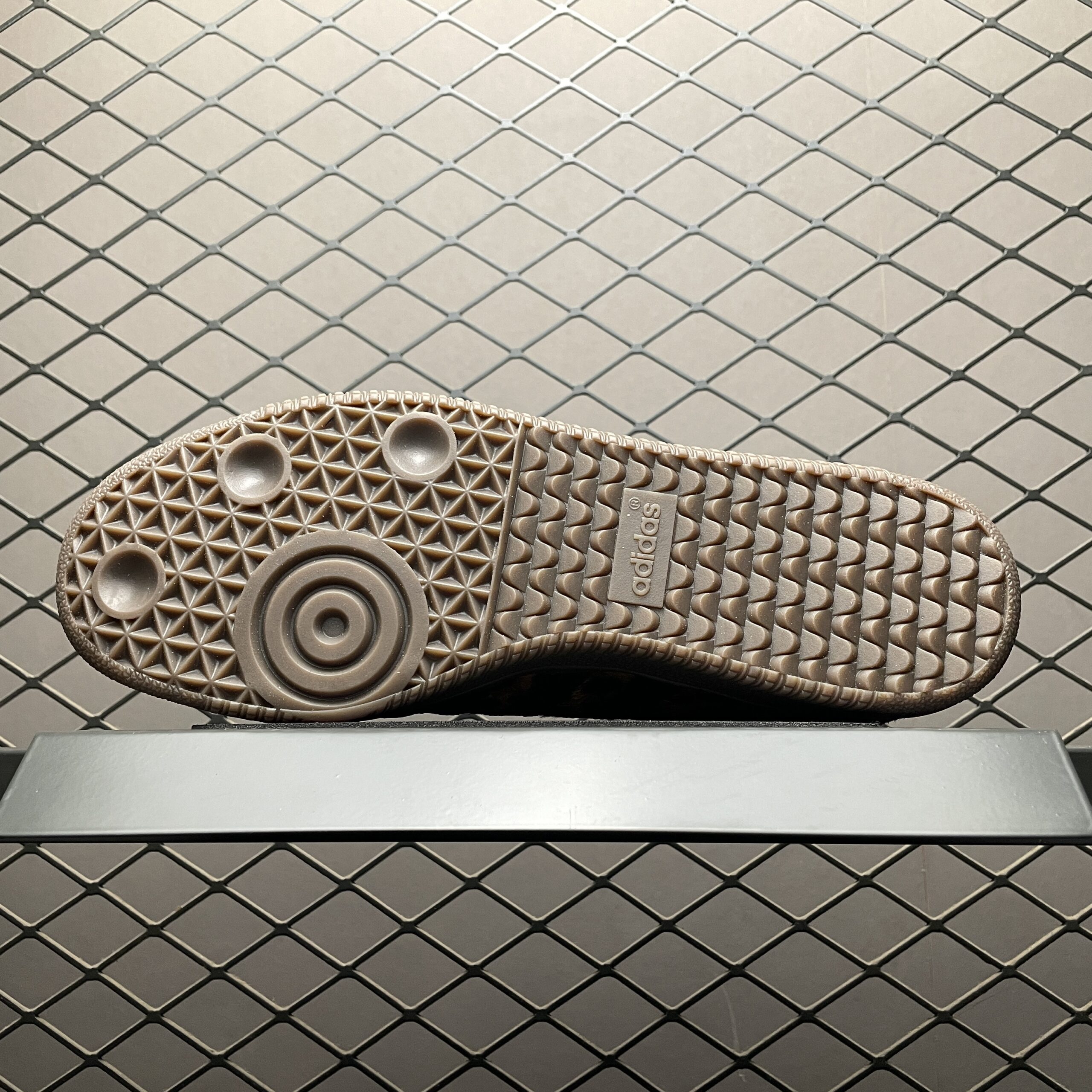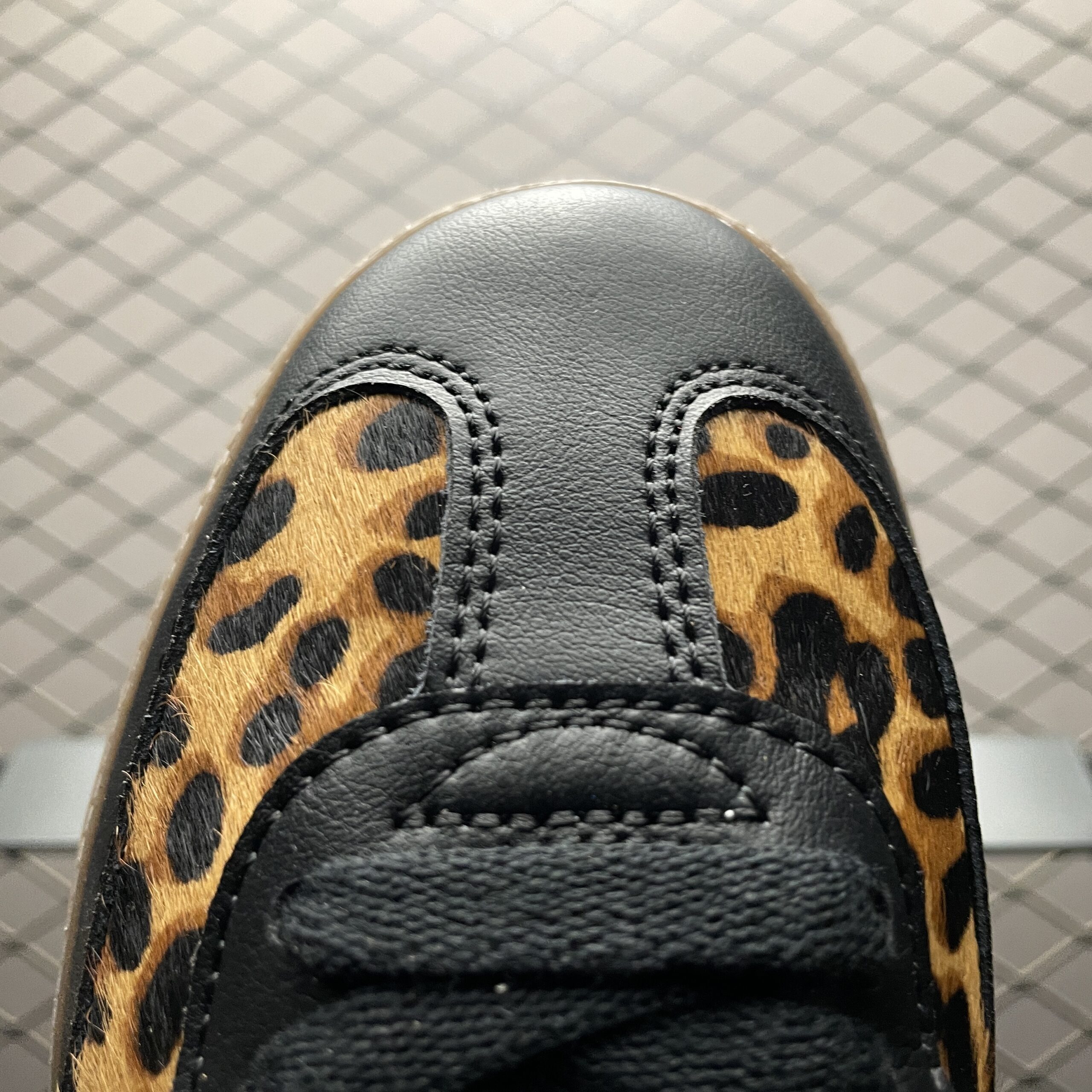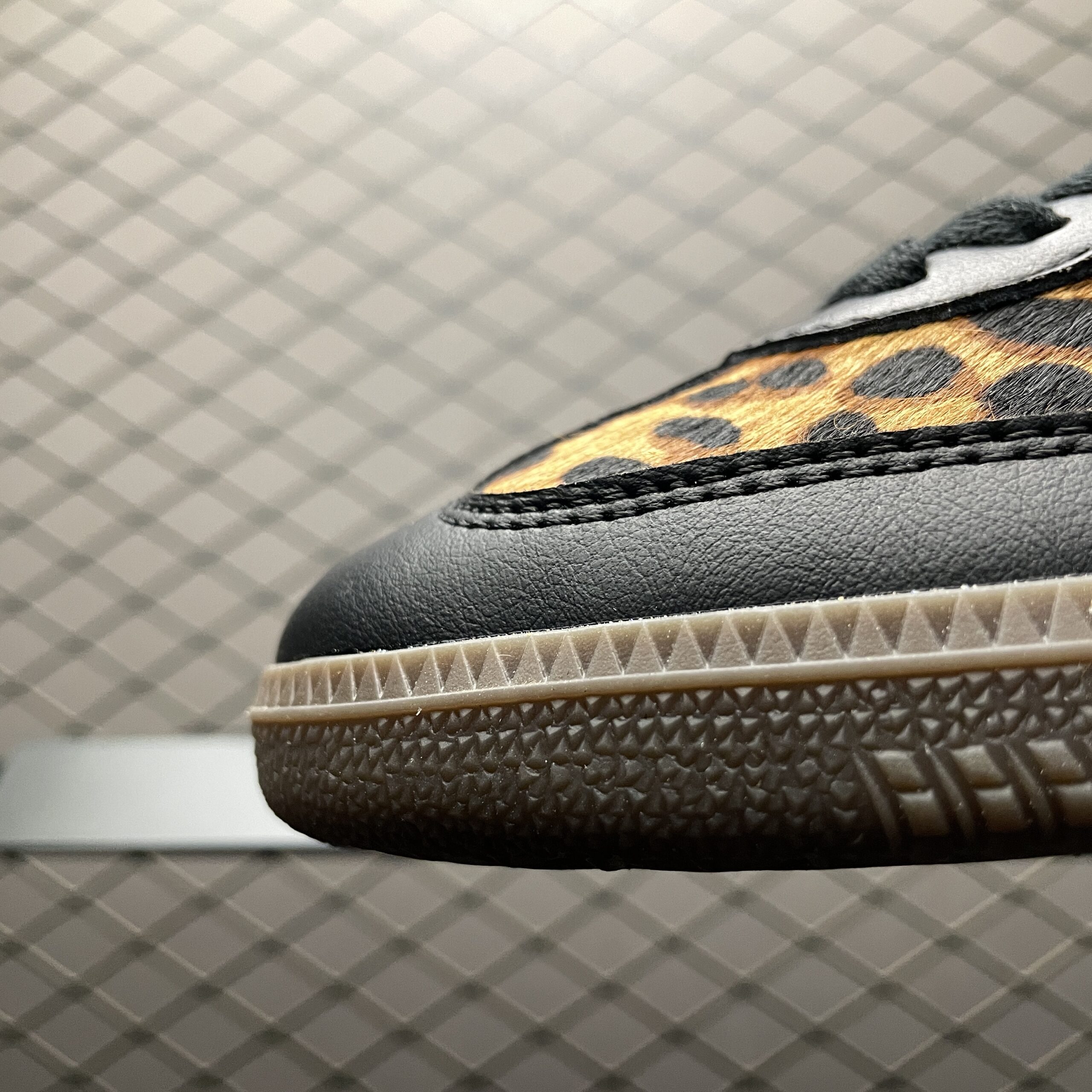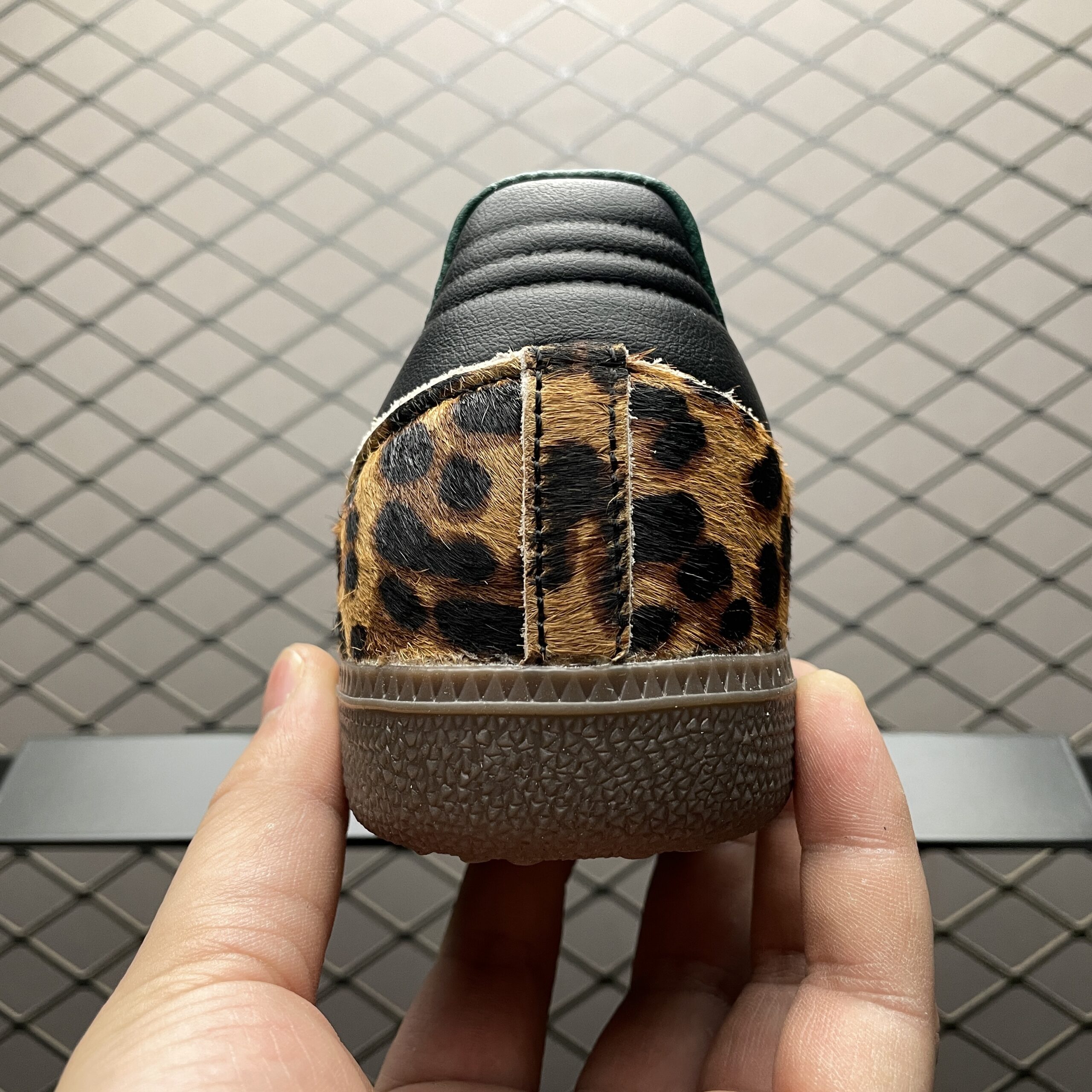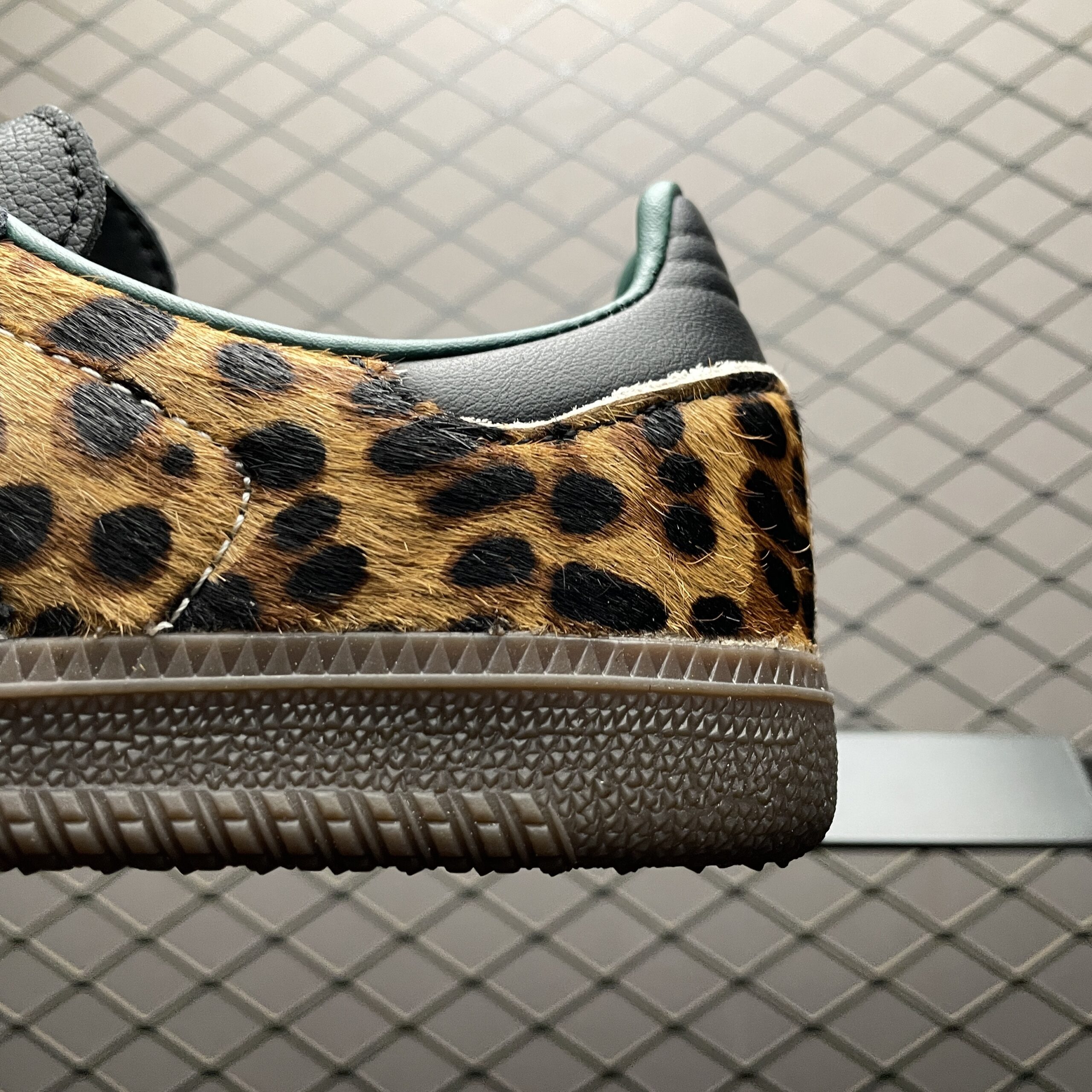L’élément le plus distinctif de cette chaussure est l’imprimé léopard qui orne certaines parties de la tige, apportant une dimension sauvage et tendance au modèle. Ce motif animalier est subtilement intégré, créant un équilibre parfait entre audace et sophistication. La semelle en caoutchouc gomme, fidèle au design original de la Samba, assure une adhérence optimale et un confort tout au long de la journée.