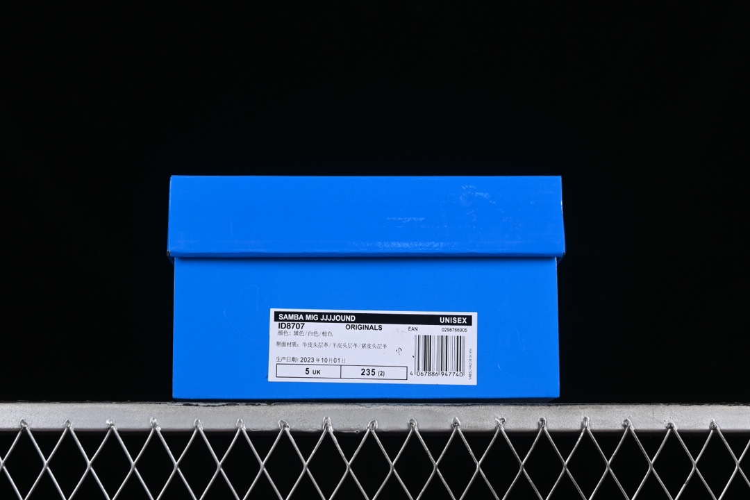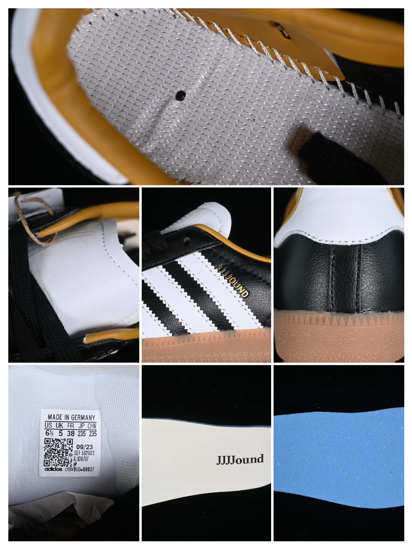 La chaussure présente une tige en cuir pleine fleur de couleur noire, offrant une apparence à la fois élégante et durable. Les trois bandes emblématiques d’adidas sur les côtés sont également noires, créant un look monochrome très moderne. Le logo de JJJJound est discrètement embossé sur le côté externe de la chaussure, affirmant la collaboration sans rompre avec le style épuré de la chaussure.