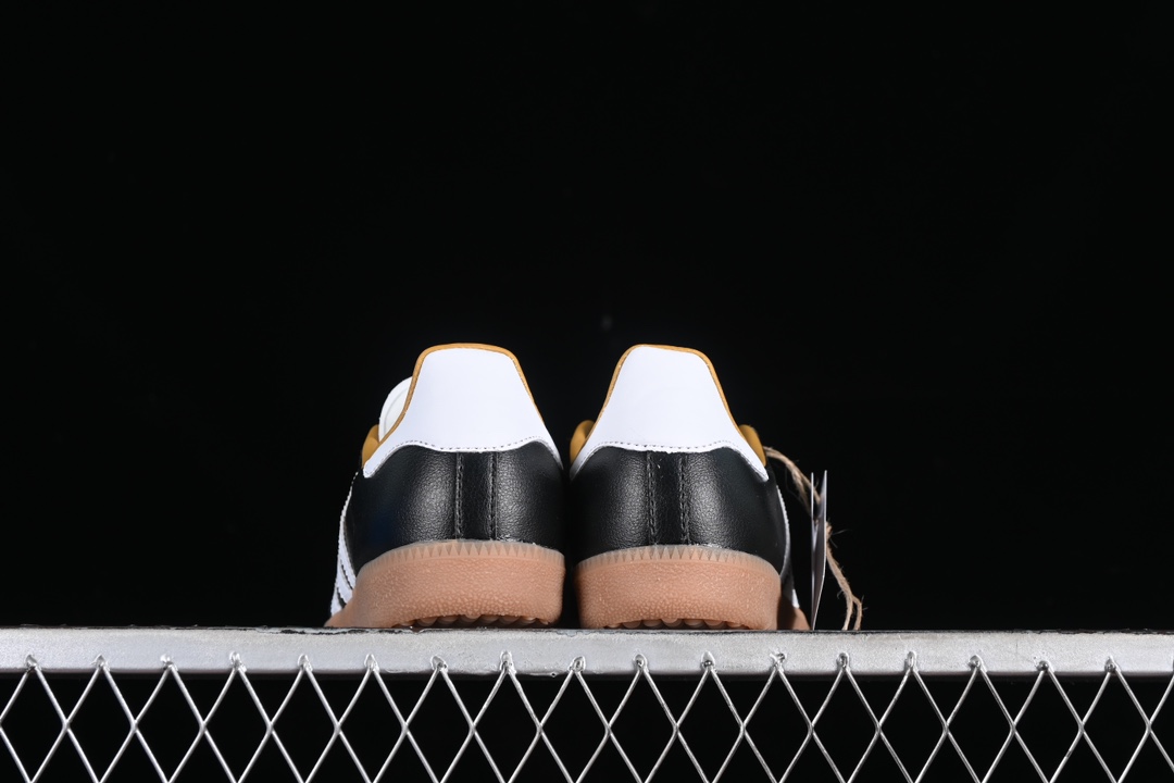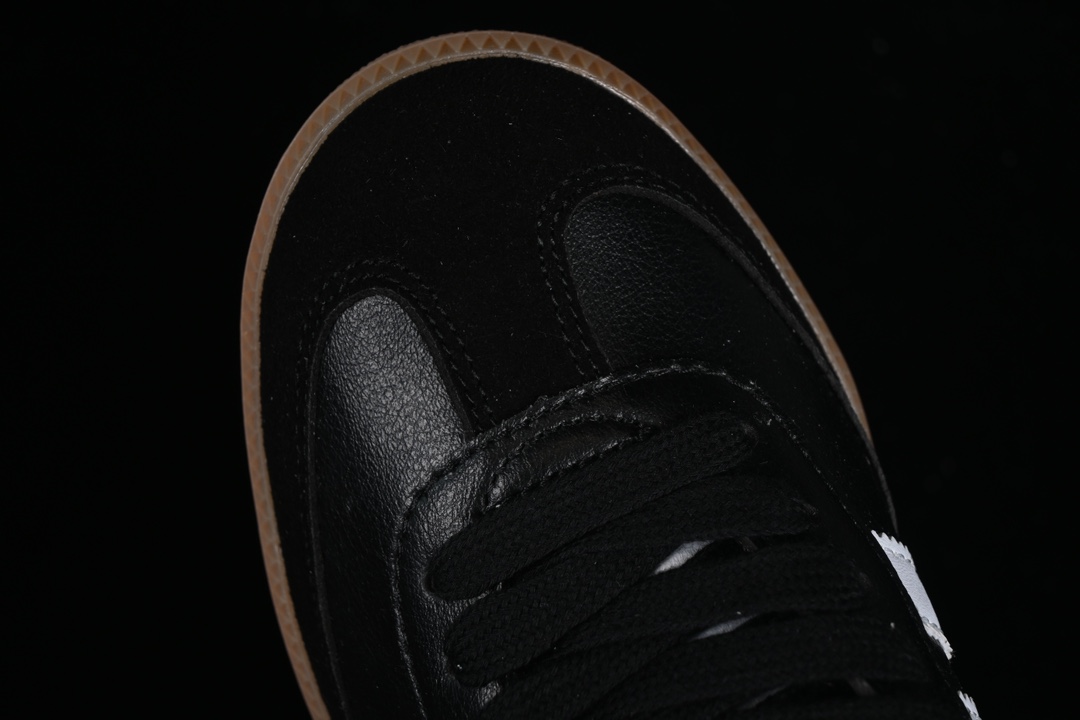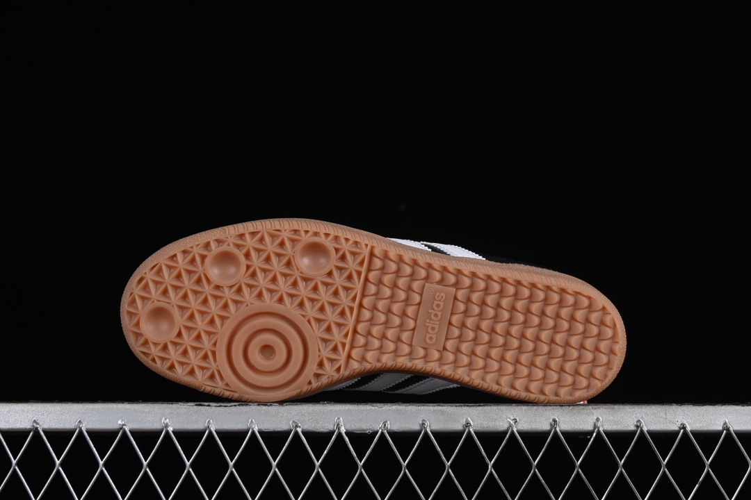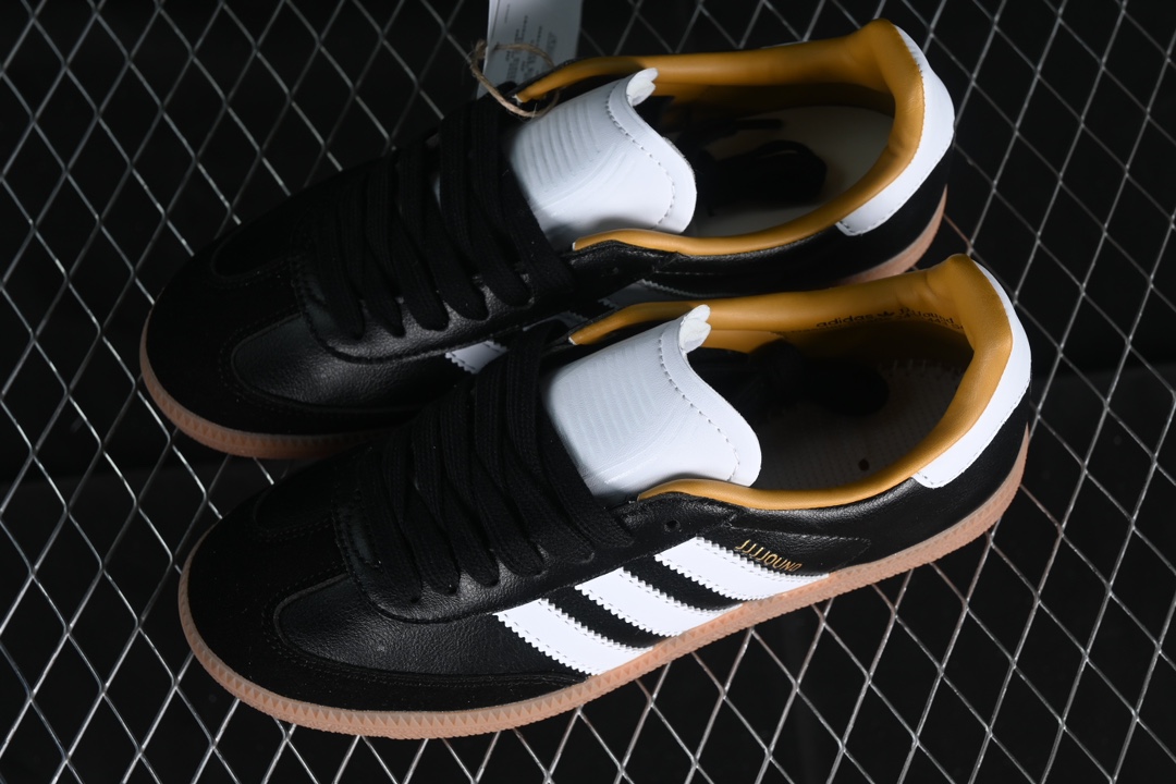 La languette arbore le logo classique de Samba en doré, ajoutant une touche de luxe et contrastant subtilement avec le noir dominant. La semelle extérieure est en caoutchouc gomme, fidèle à l’esthétique vintage de la Samba originale, et offre une bonne adhérence ainsi qu’une durabilité accrue.