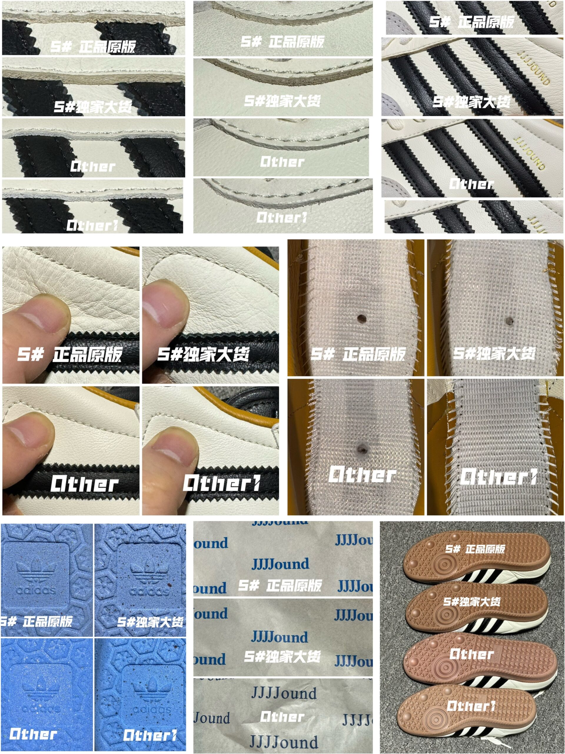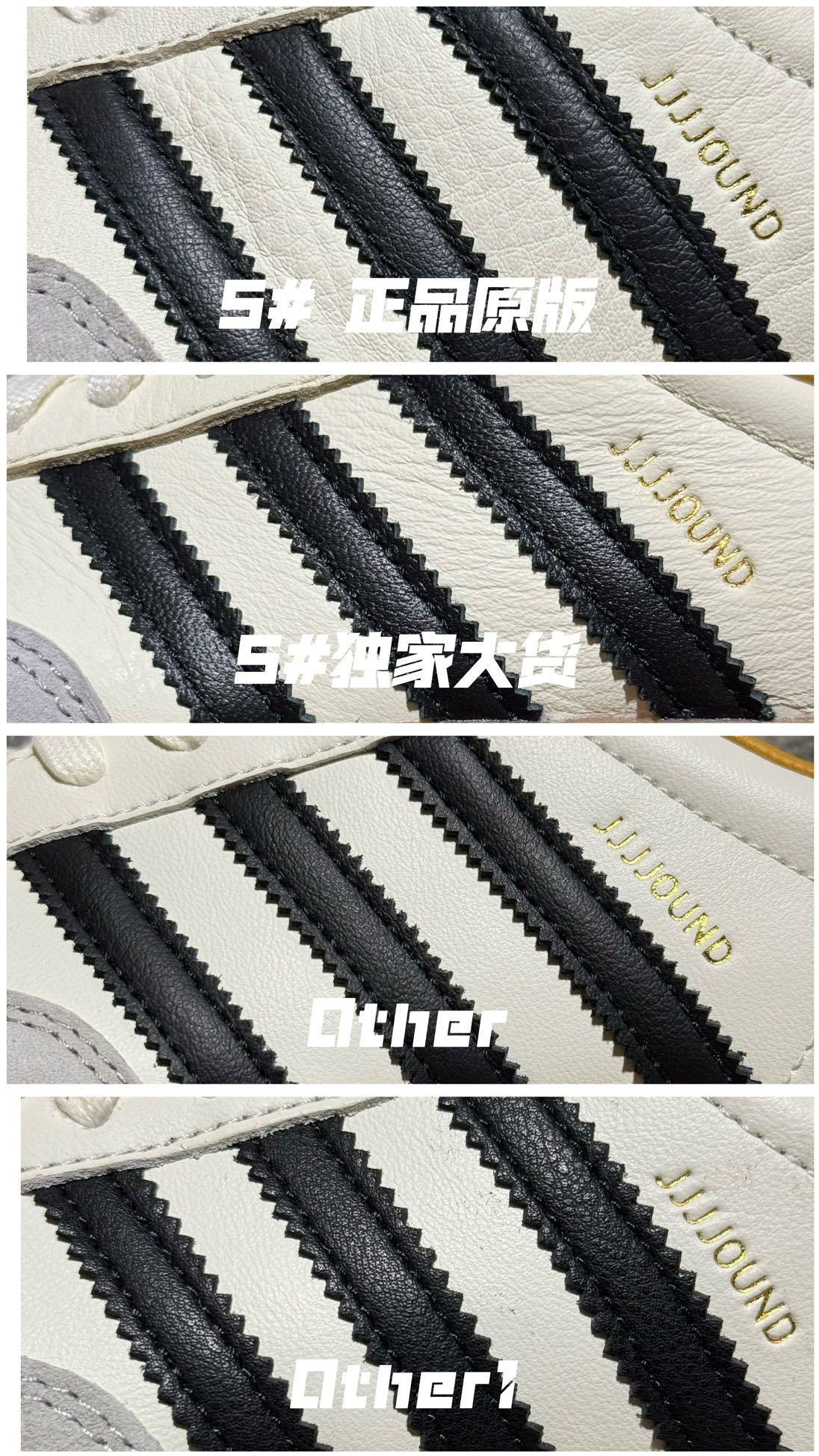 La chaussure présente une tige en cuir pleine fleur de couleur blanche, offrant une apparence à la fois luxueuse et sobre. Les trois bandes emblématiques d’Adidas sur les côtés sont également en cuir blanc, se fondant harmonieusement avec le reste de la chaussure pour un look monochrome. Le logo de JJJJound est discrètement embossé sur le côté externe près du talon, ajoutant une touche de branding exclusive sans perturber l’esthétique minimaliste.