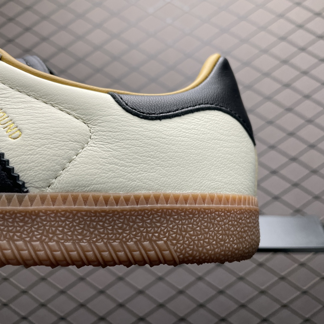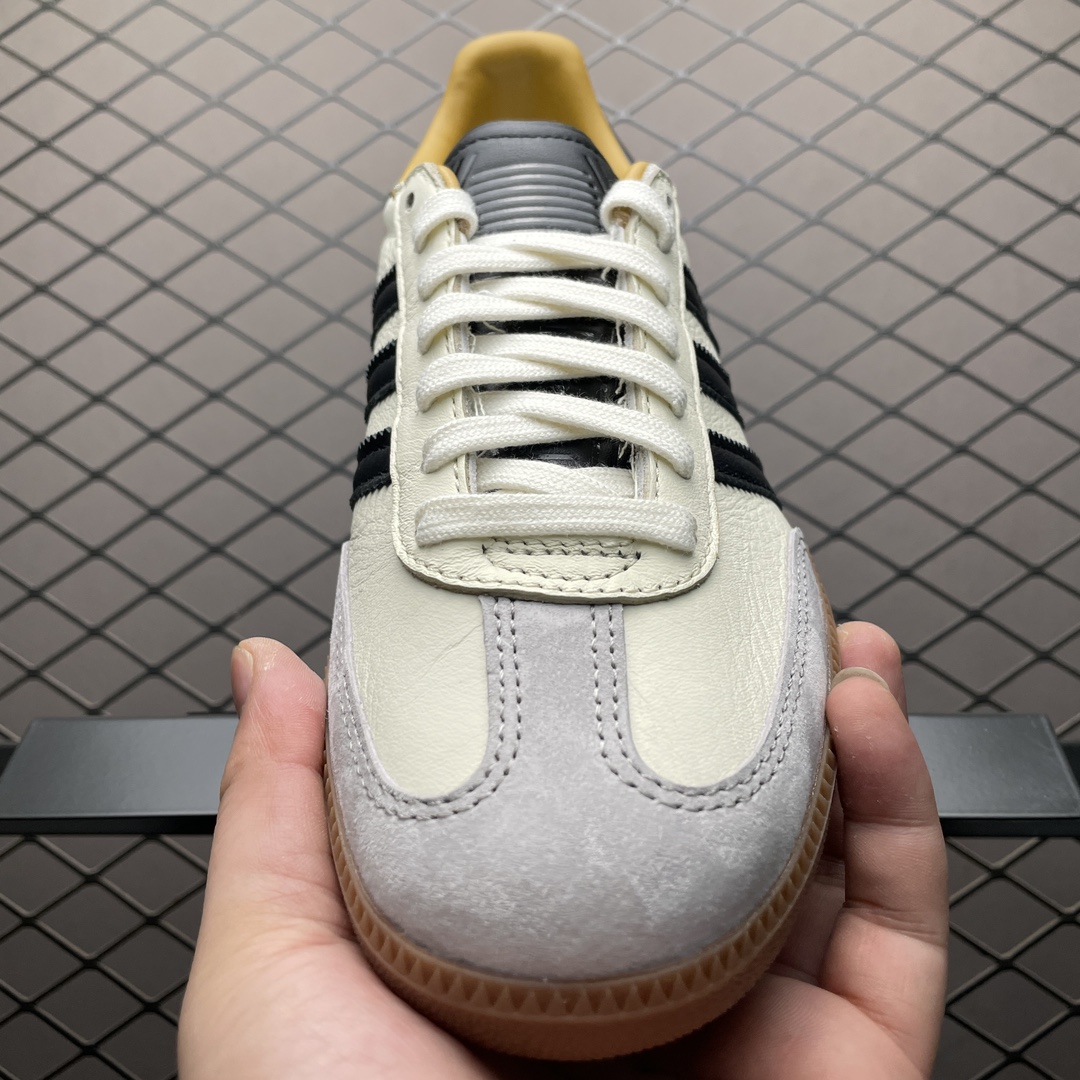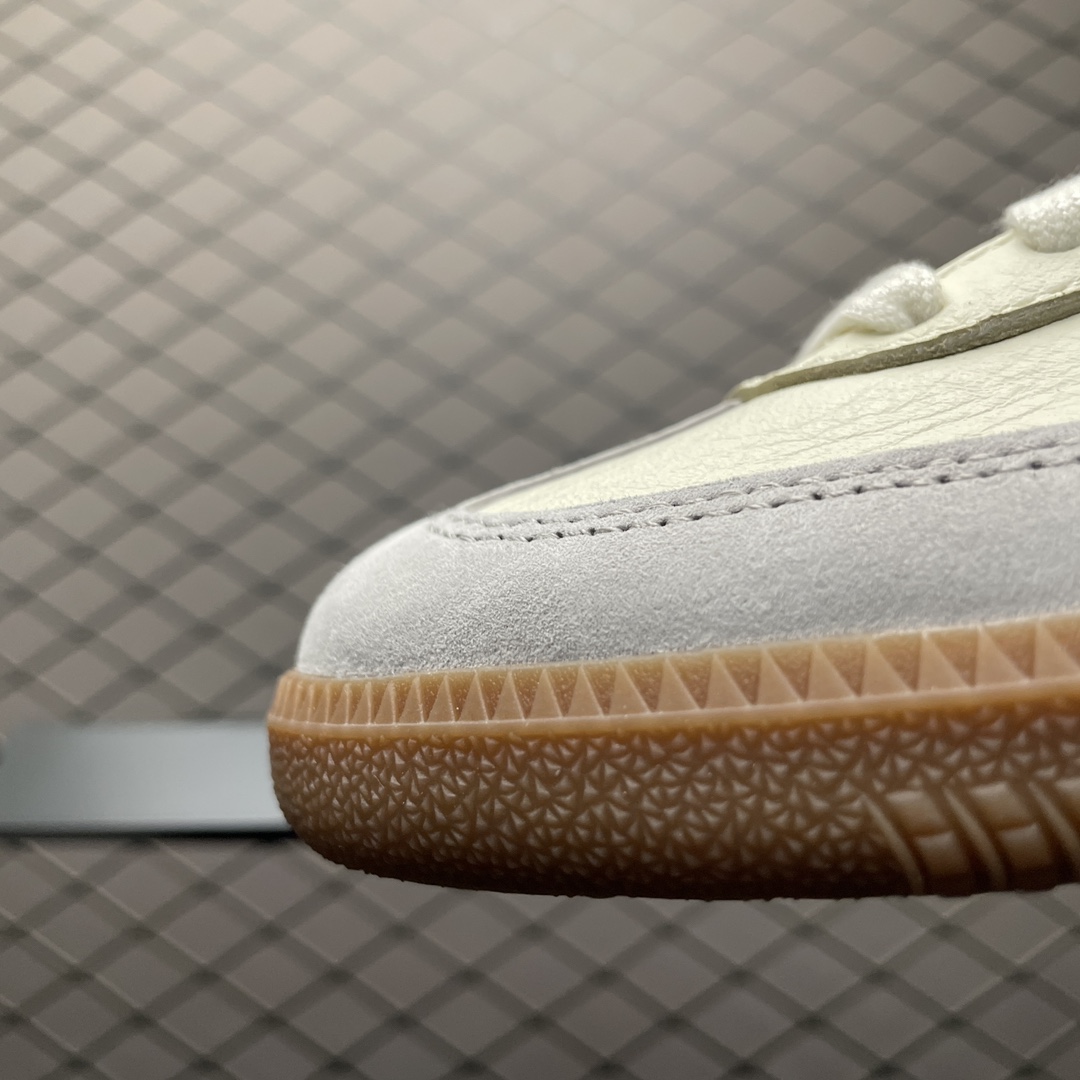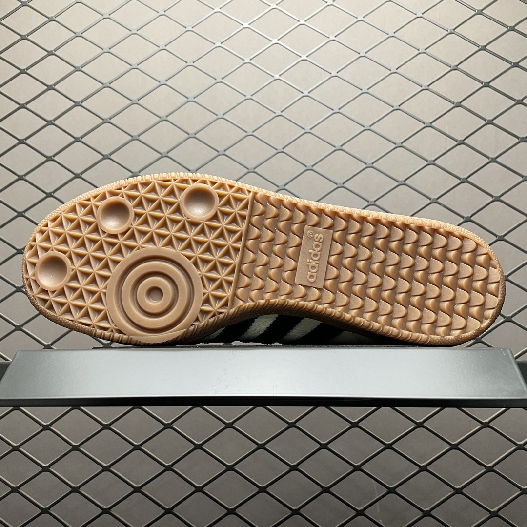 La languette et le talon comportent des détails en suède gris clair, apportant une légère variation de texture et de couleur qui enrichit subtilement le design. La semelle extérieure est en caoutchouc gomme, fidèle à l’esthétique vintage de la Samba originale, et offre une bonne adhérence ainsi qu’une durabilité accrue.