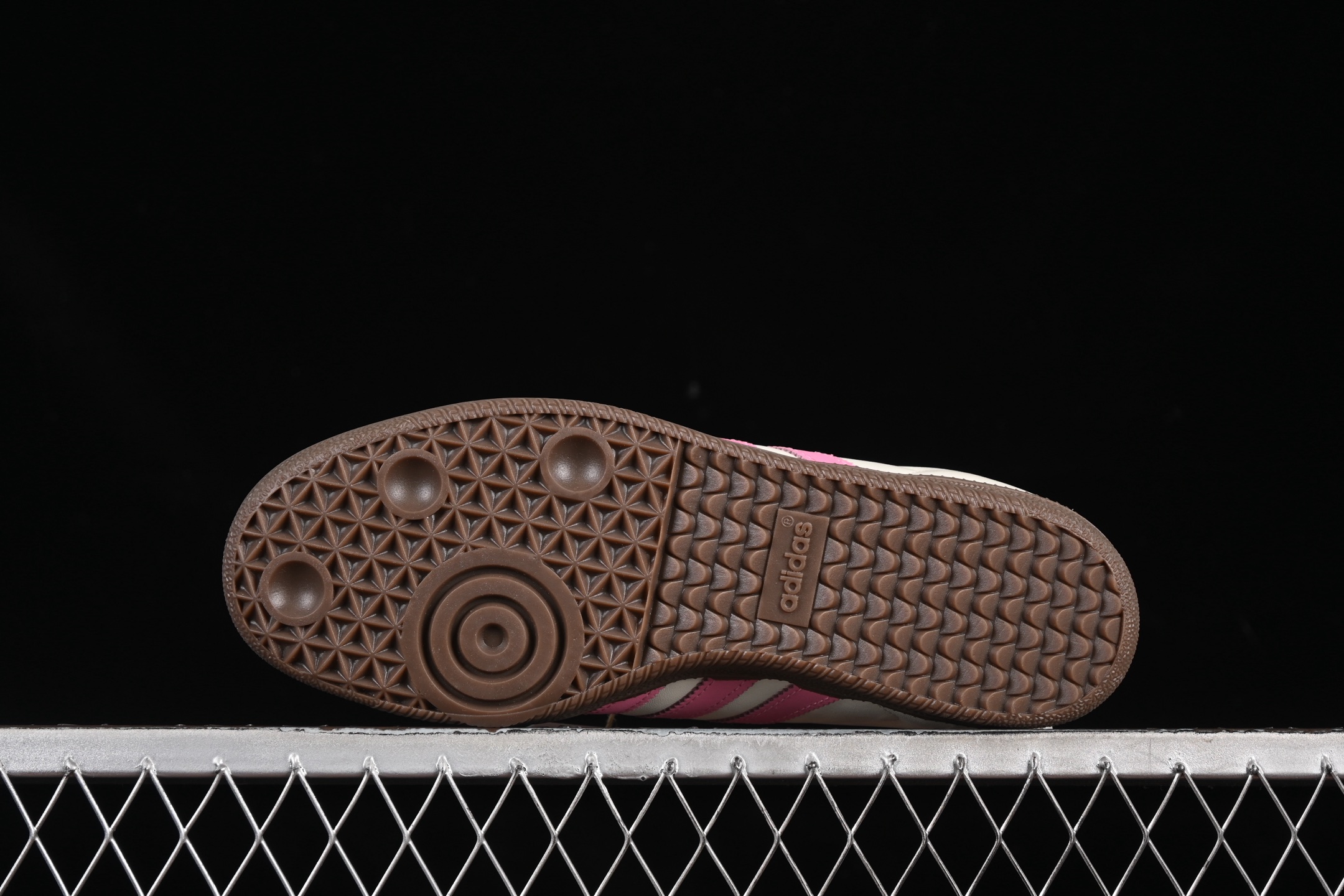 La semelle extérieure en caoutchouc gomme, signature de la ligne Samba, garantit une adhérence optimale et une résistance à l’usure, idéale pour un usage quotidien. À l’intérieur, la doublure textile procure un confort supplémentaire, rendant ces sneakers parfaites pour un port prolongé. Les trois bandes emblématiques d’Adidas, ici en blanc, se détachent nettement sur le fond rose, renforçant l’identité visuelle de la marque.