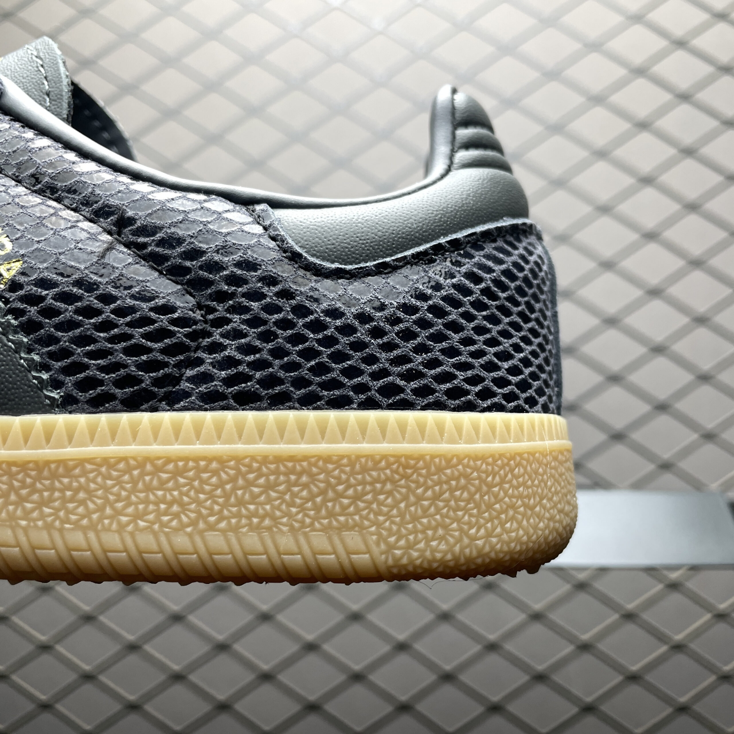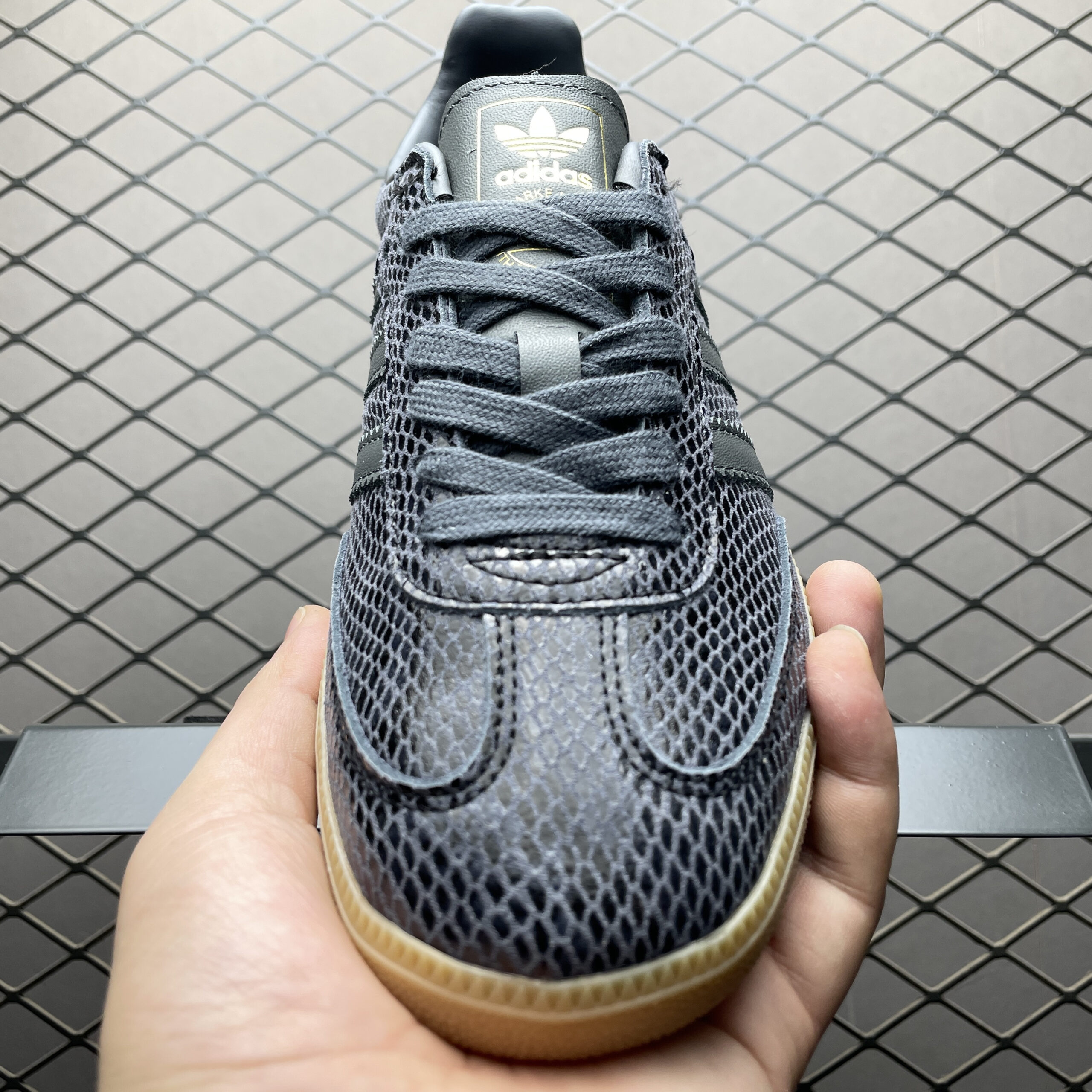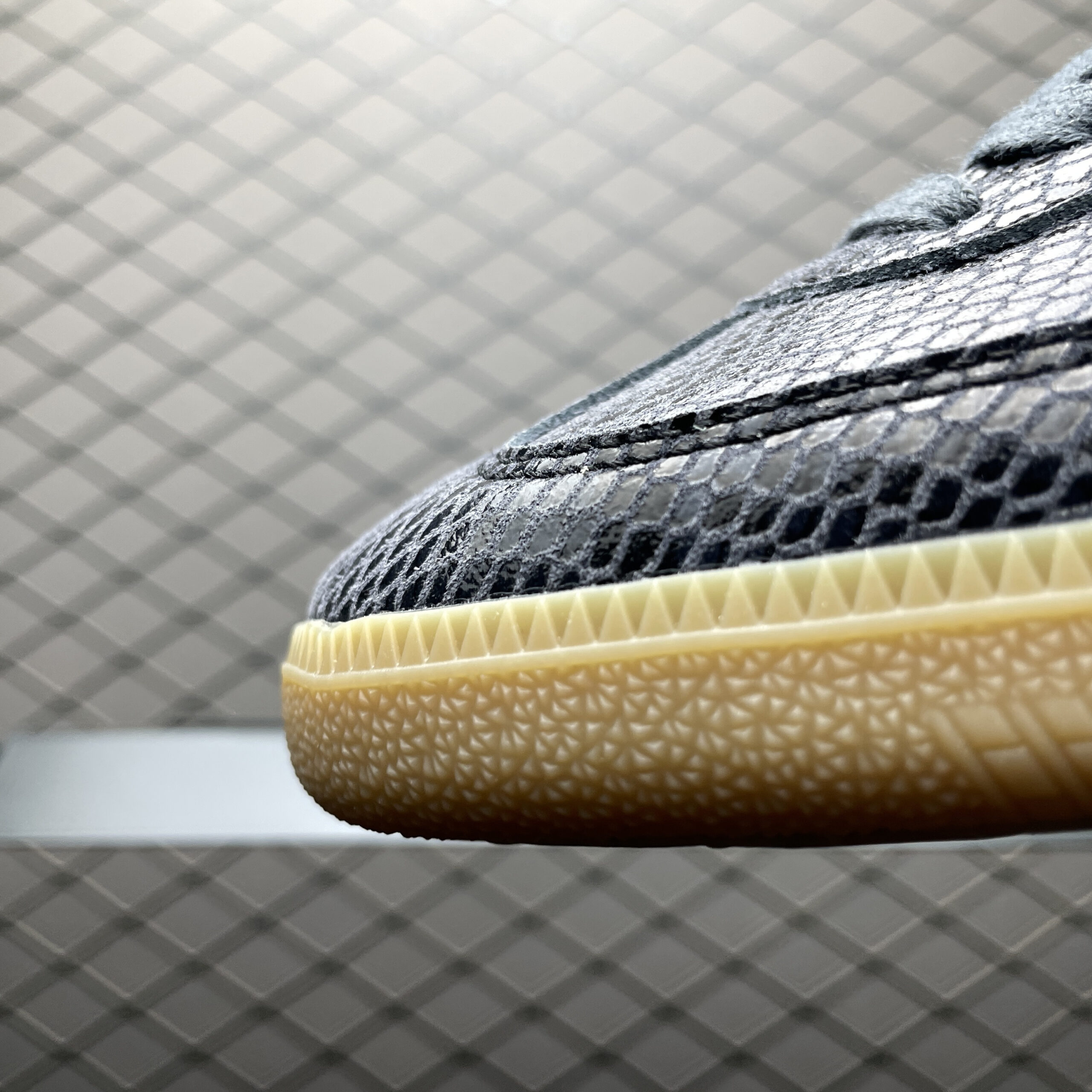 Cette édition spéciale présente une élégante empeigne en cuir noir, accentuée par une texture serpent sophistiquée qui donne une allure sauvage et audacieuse à la chaussure. Les trois bandes emblématiques d’adidas en blanc contrastent parfaitement avec le noir, créant une silhouette unique qui se démarque.