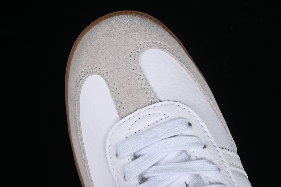 La semelle extérieure est en gomme, fidèle au style Samba original, connue pour sa résistance et son adhérence. La couleur gum naturelle de la semelle offre un contraste attrayant avec le blanc du cuir, tout en rappelant les racines vintage du modèle.