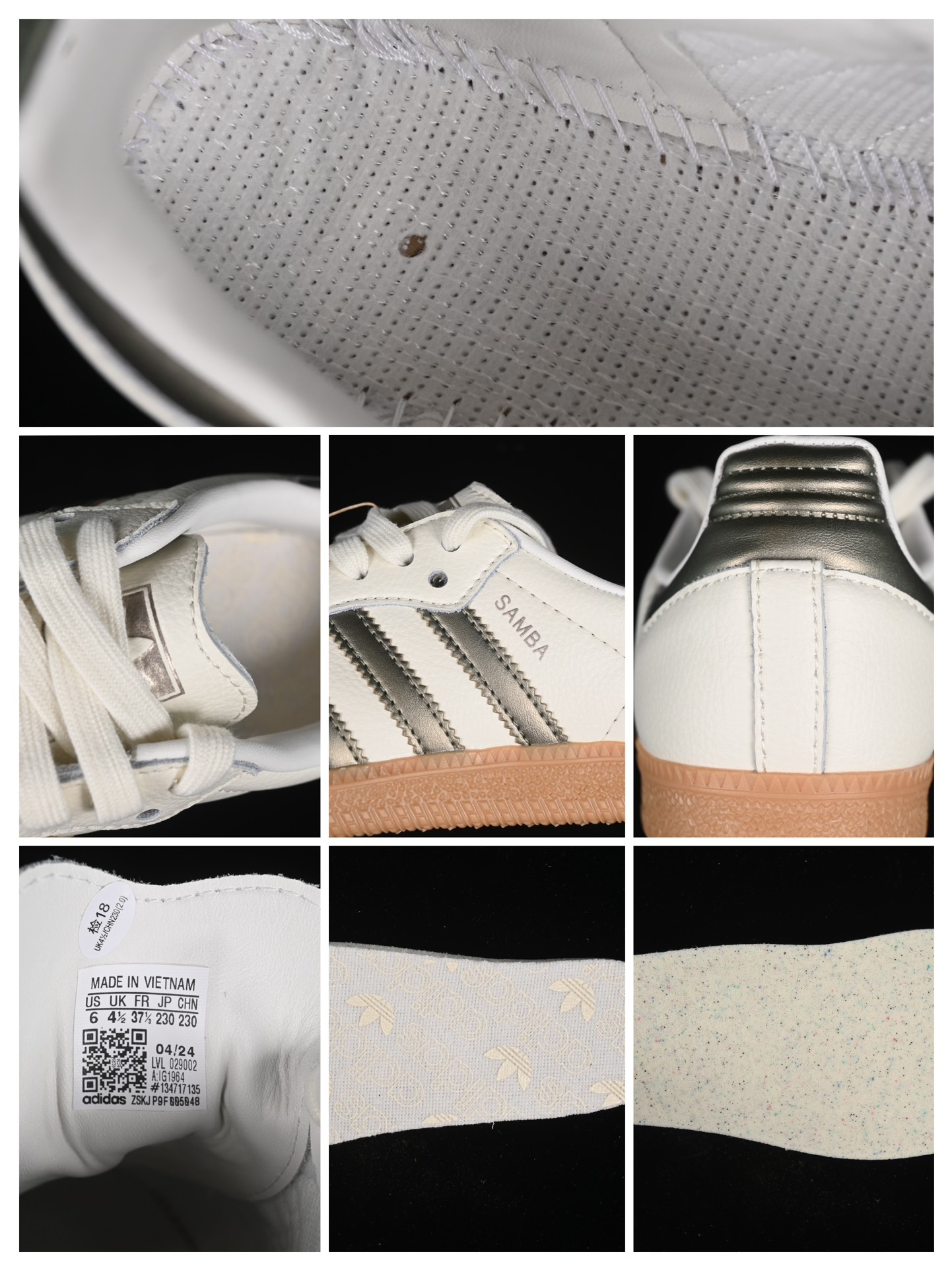 La chaussure présente une tige en cuir pleine fleur, offrant durabilité et confort. La couleur principale de la tige est un blanc éclatant, contrasté par des détails Wonder Gold Metallic, notamment les trois bandes emblématiques d’adidas et le renfort de talon. Ces éléments métalliques ajoutent une touche de luxe et d’originalité au design classique.