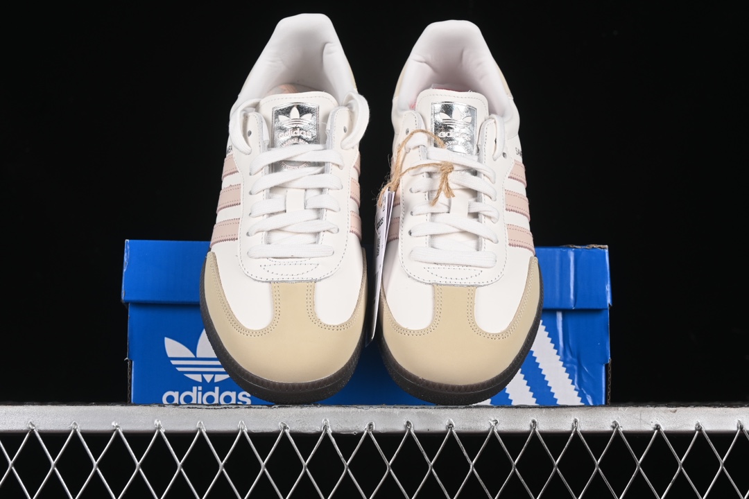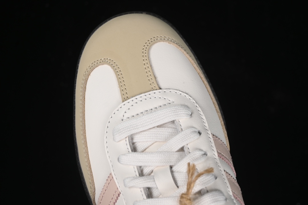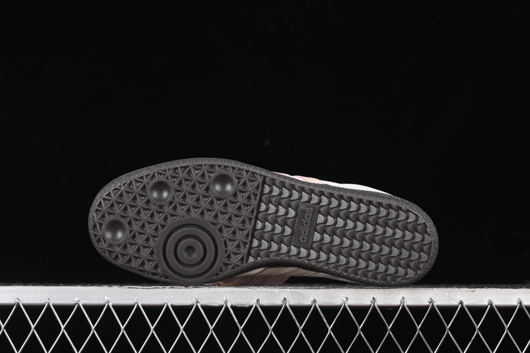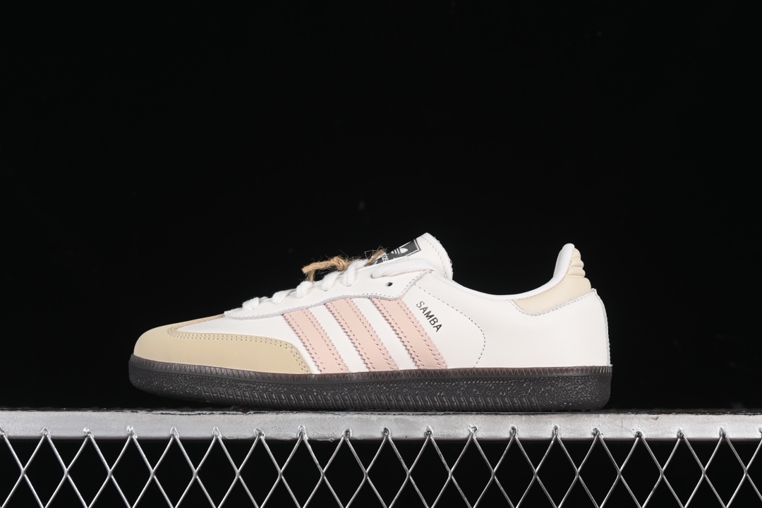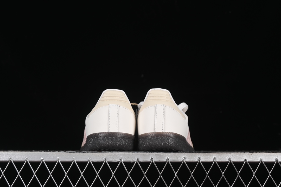 La tige est fabriquée en cuir pleine fleur, offrant une durabilité et un confort exceptionnels. La couleur principale de la chaussure est un ton neutre, agrémenté de détails en quartz rose qui lui confèrent une touche d’élégance et de féminité. Les trois bandes emblématiques d’adidas sur les côtés sont également présentes, soulignant l’identité de la marque.