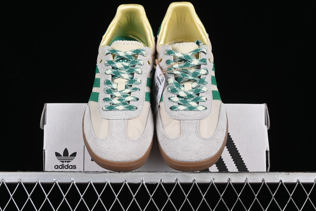 La chaussure Adidas Samba Wales Bonner Cream Green GY4344 est un modèle de chaussure de sport de la marque Adidas. Elle a été conçue en collaboration avec la créatrice de mode britannique Wales Bonner. La couleur principale de la chaussure est le vert crème, avec des accents de couleur verte.