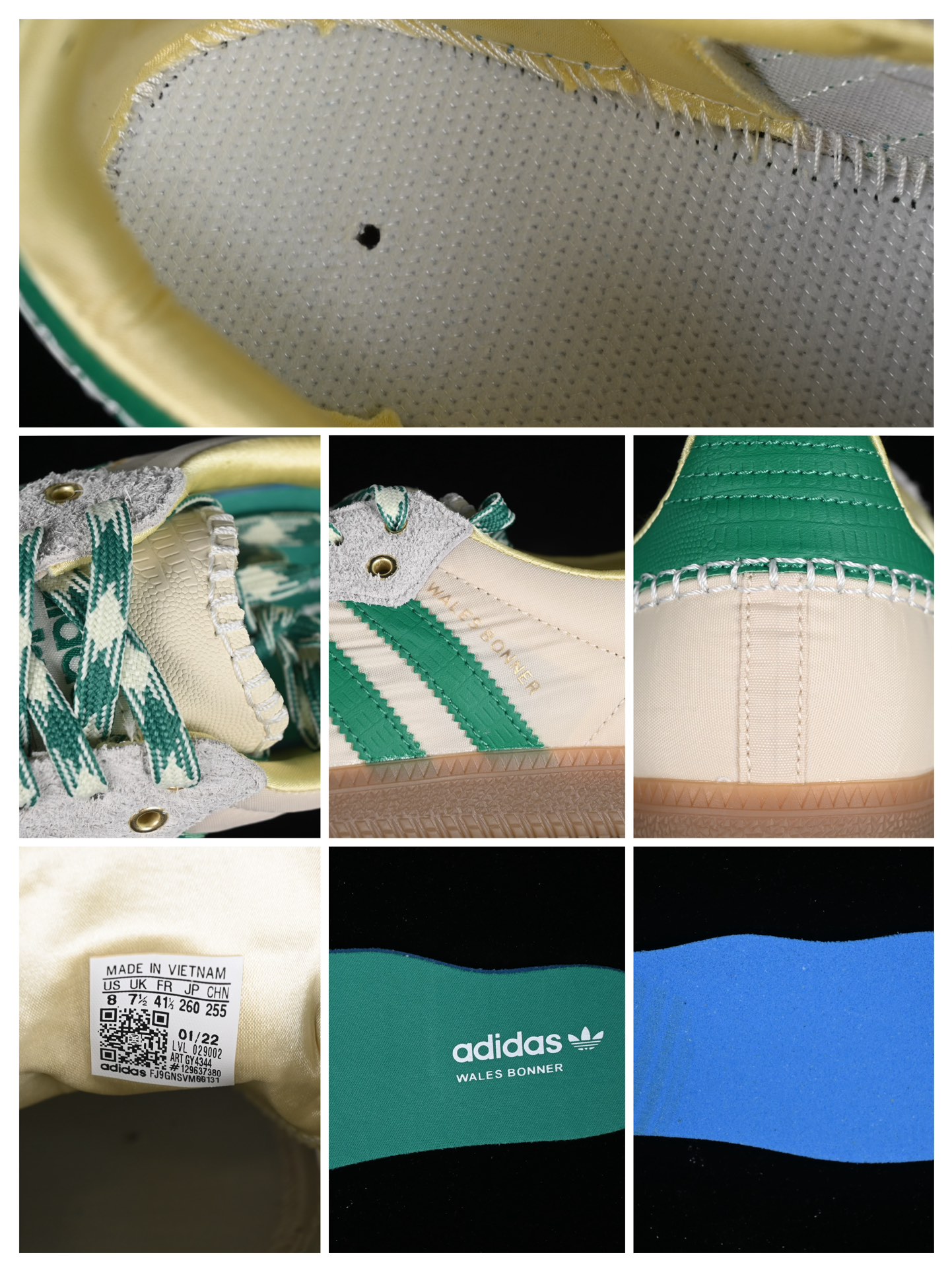 Le design de la chaussure est inspiré des modèles classiques de la gamme Adidas Samba, avec une touche moderne apportée par Wales Bonner. On retrouve ainsi les célèbres trois bandes Adidas sur les côtés de la chaussure, ainsi que le logo Adidas sur la languette.