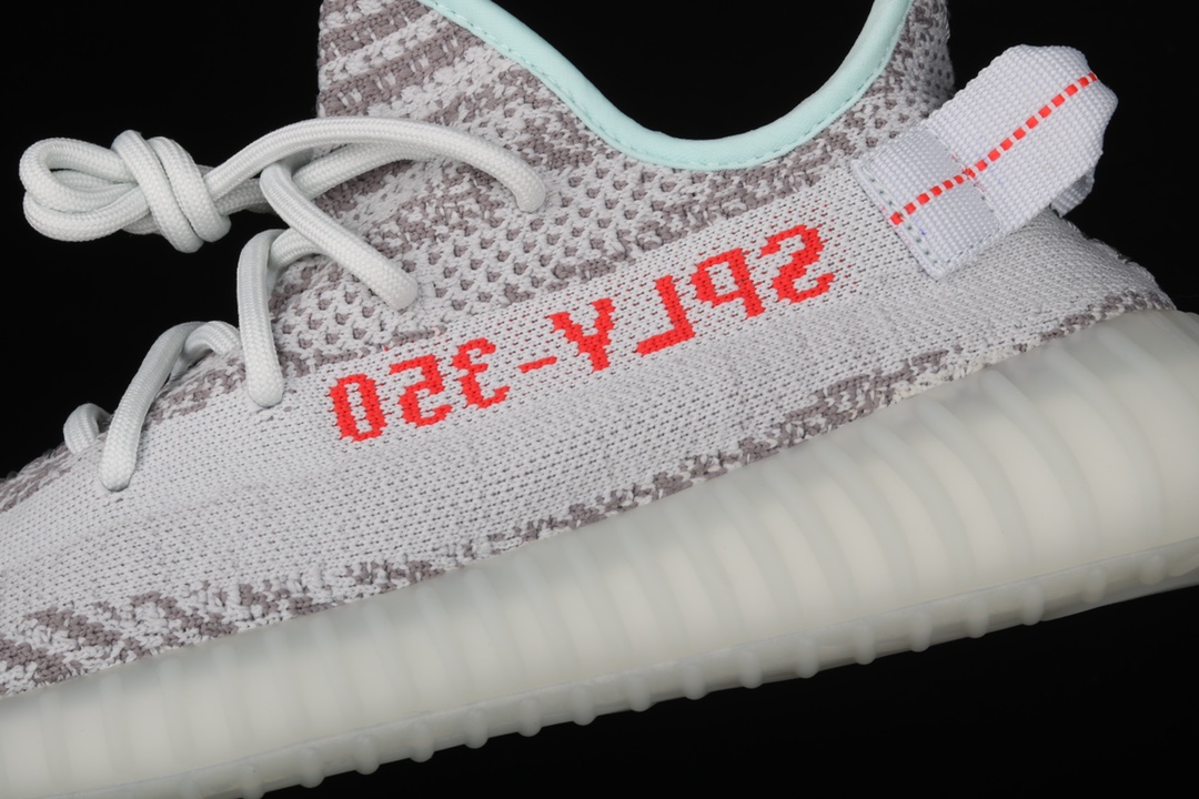 La « Blue Tint » se distingue par son motif unique et ses couleurs subtiles. Le dessus de la chaussure est fabriqué en Primeknit, un matériau textile avancé d’adidas qui offre à la fois légèreté, flexibilité et durabilité. La couleur principale est un bleu très pâle, presque gris, avec des accents de motifs en zébrure qui combinent le gris clair et le rouge vif. Ces motifs sont intégrés de manière irrégulière, ce qui donne à chaque paire un aspect légèrement différent.