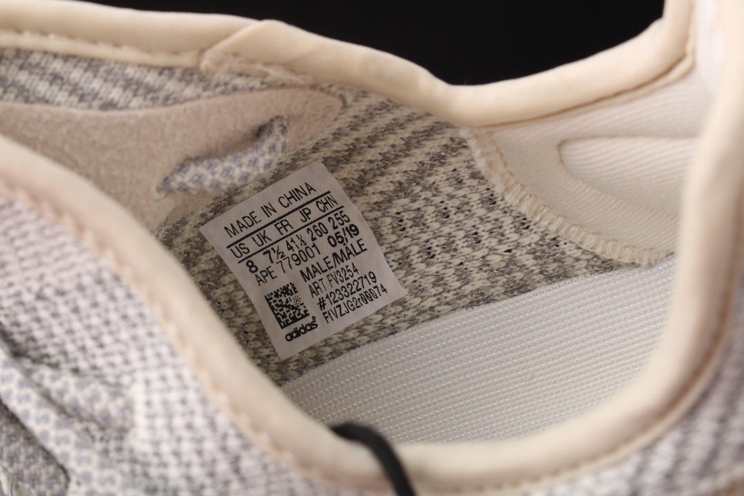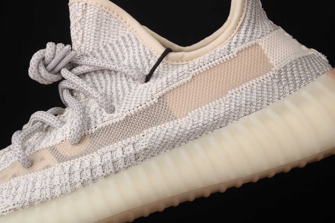 La chaussure présente une tige Primeknit, une technologie Adidas qui offre à la fois légèreté, souplesse et confort, tout en s’adaptant parfaitement à la forme du pied. Le motif de la tige combine différentes nuances de gris et de blanc, créant un design subtil mais complexe. La bande latérale translucide, caractéristique des modèles Yeezy Boost 350 V2, s’intègre harmonieusement au reste de la chaussure.