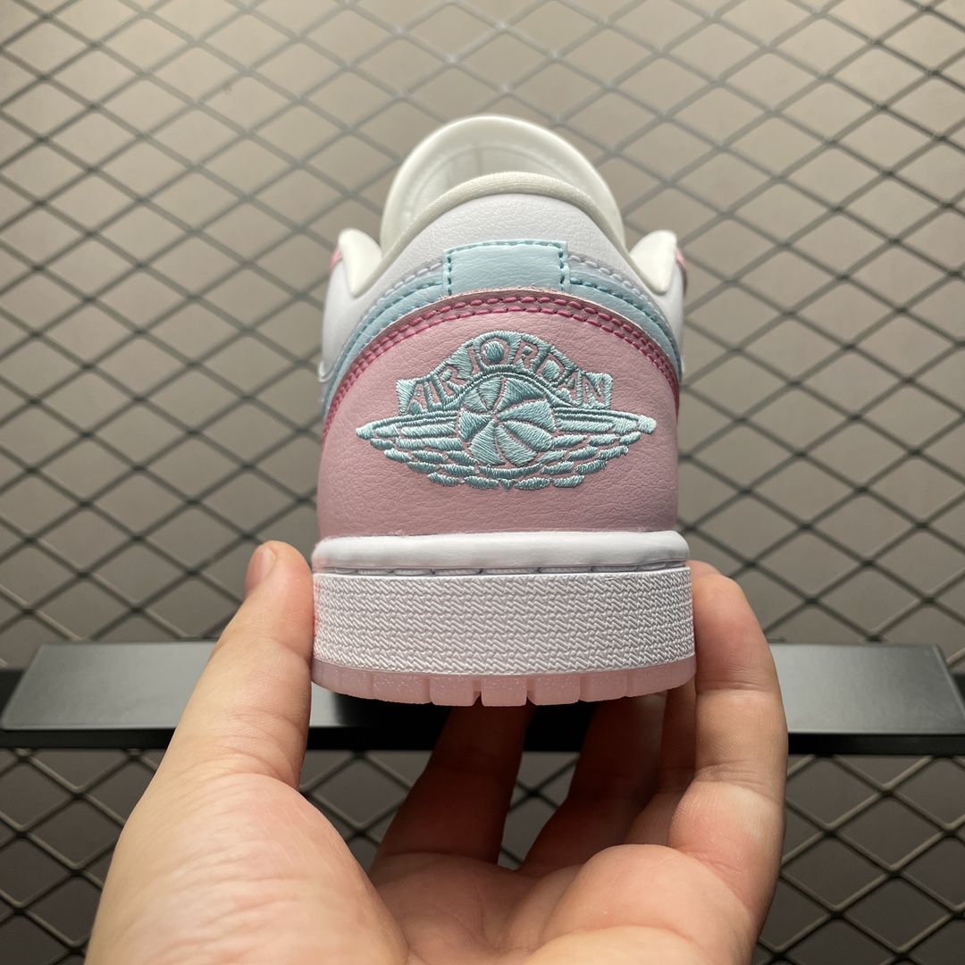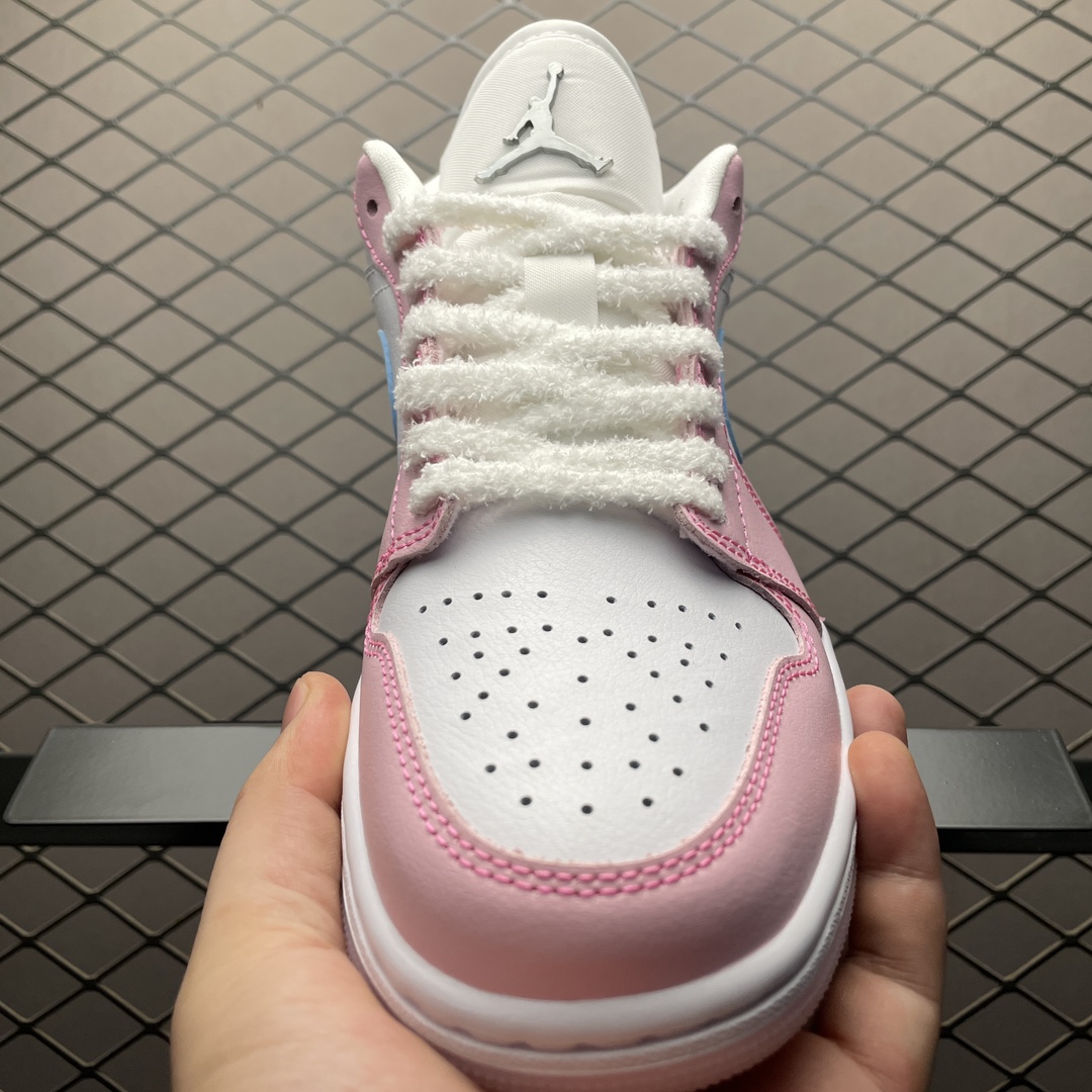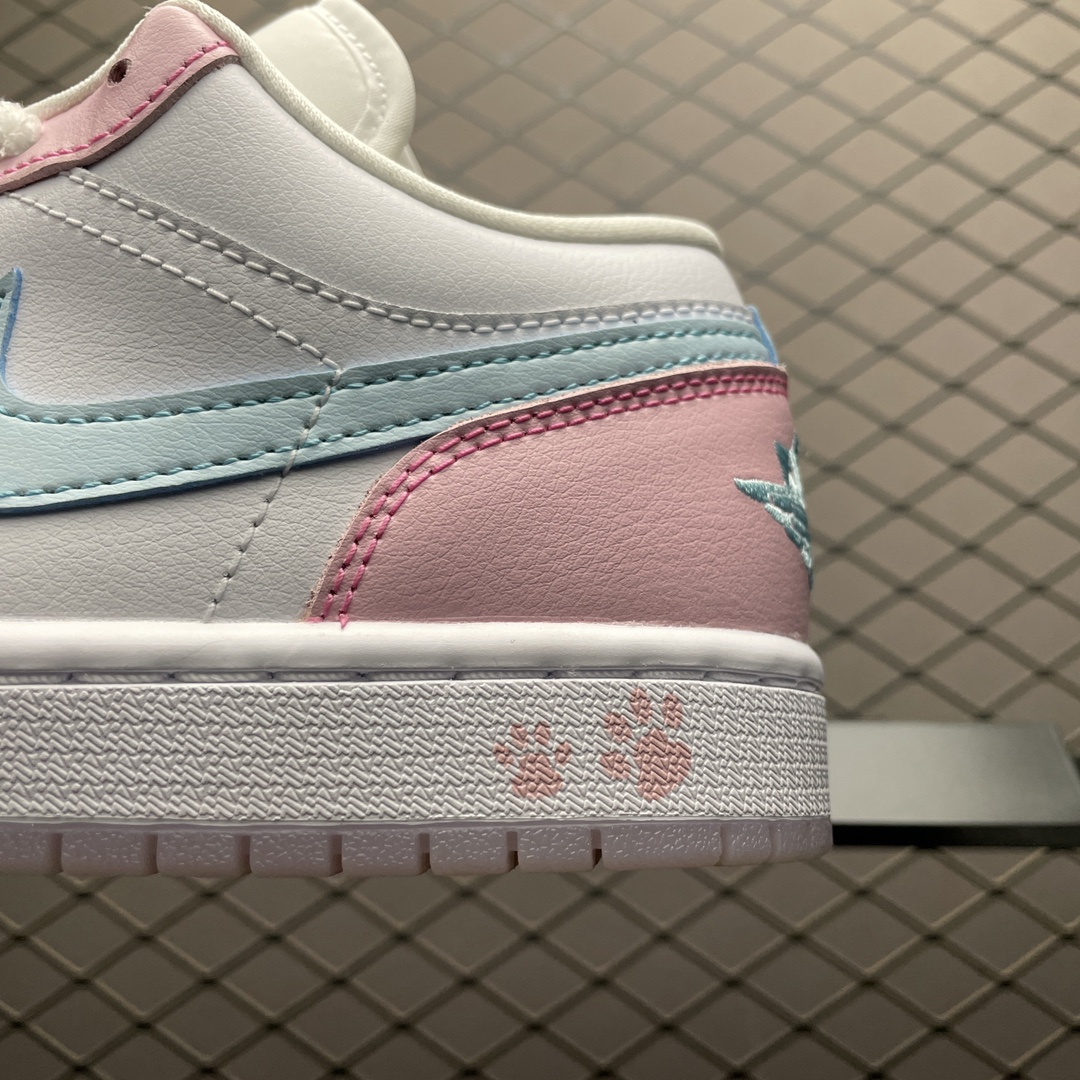 L’Air Jordan 1 Low Paw Print HM3706-141 est une sneaker basse qui présente un design unique inspiré par les empreintes d’animaux. Le modèle combine des matériaux de haute qualité avec une esthétique audacieuse et ludique. La chaussure est principalement habillée de blanc, avec des touches de bleu clair et de rose, créant un contraste visuel attrayant.