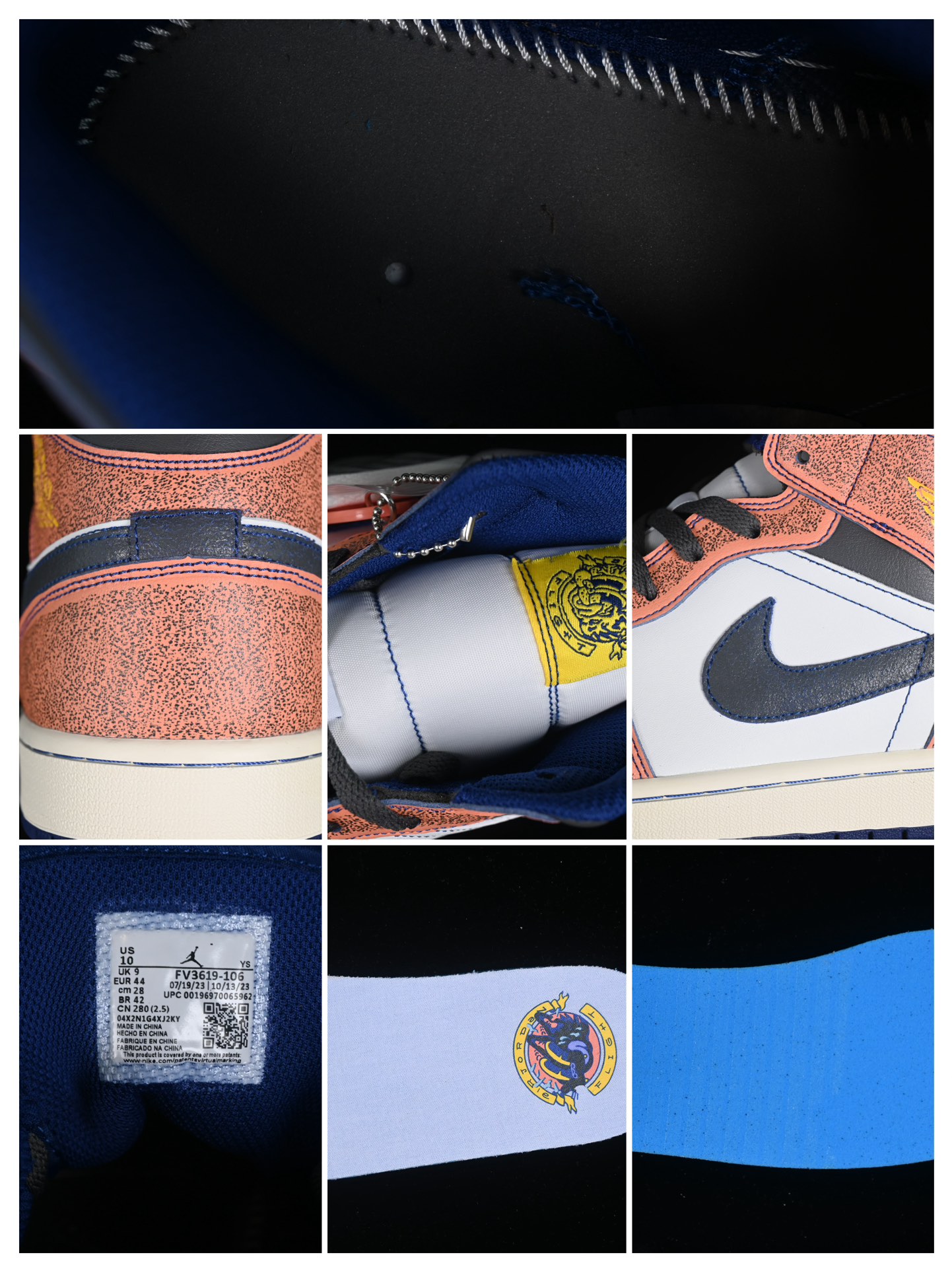 Les détails supplémentaires incluent des lacets noirs, une languette rembourrée pour plus de confort, et une étiquette de languette avec le logo Jumpman. Le design intègre également des éléments vintage, comme le vieillissement artificiel sur certaines parties du cuir, donnant à la chaussure un aspect usé et rétro.