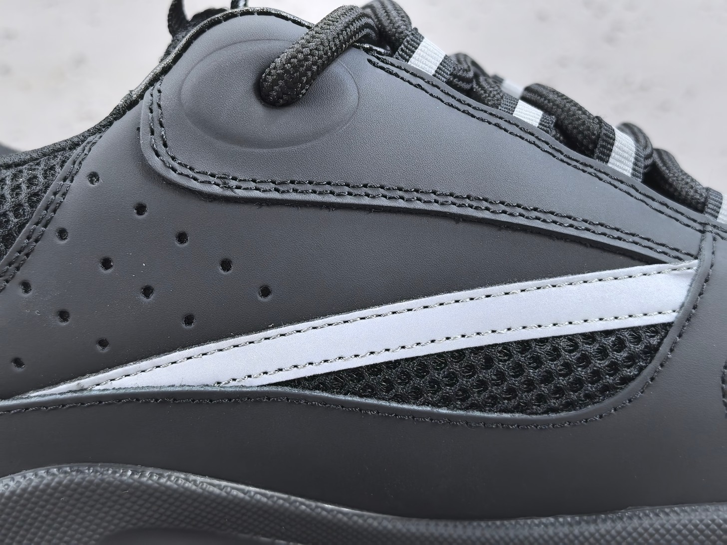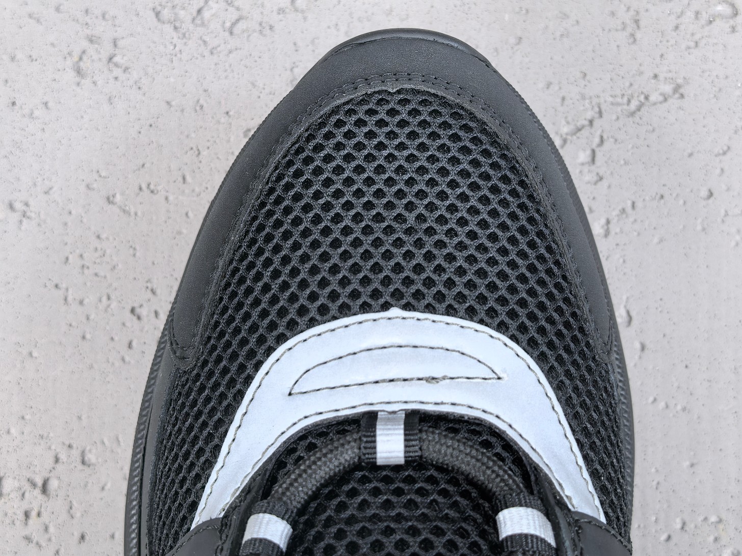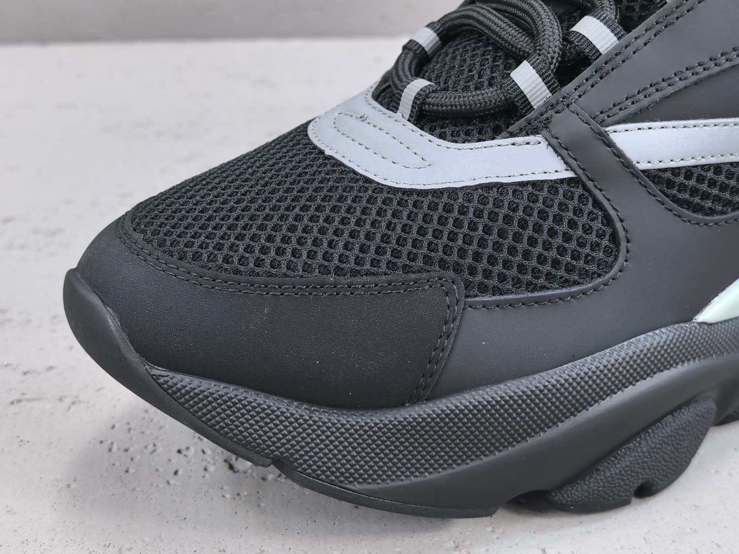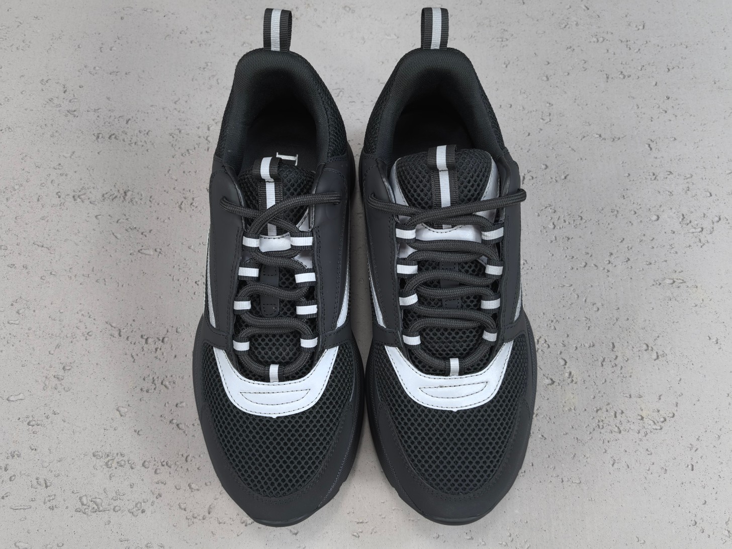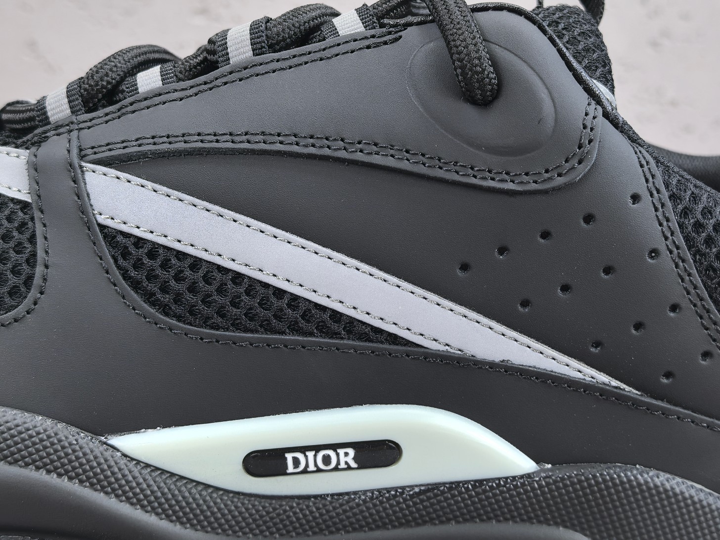 Les lacets sont larges et le branding Dior apparaît subtilement sur la languette, le côté et la semelle de la chaussure, affirmant discrètement l’identité de la marque.