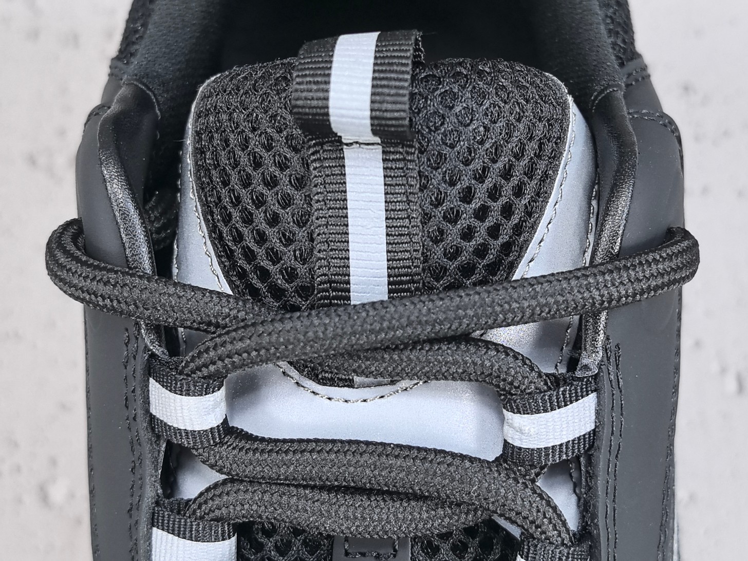La partie supérieure de la chaussure est fabriquée à partir d’un mélange de matériaux techniques et de cuir, offrant à la fois durabilité et confort. La couleur dominante est le noir, accompagnée de détails en gris et blanc qui ajoutent du contraste et de la profondeur au design.