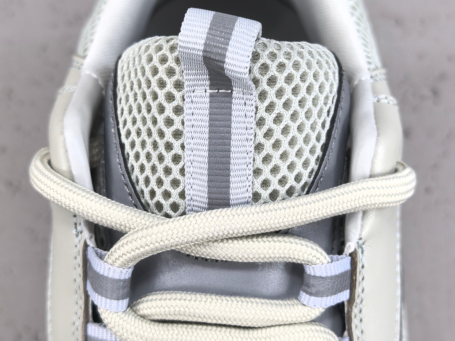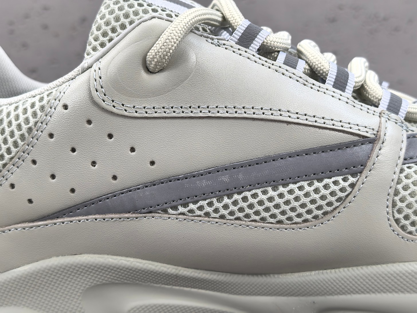 La B22 Triple Grey est principalement conçue en cuir et en maille technique, offrant ainsi un mélange de textures qui non seulement ajoute à l’esthétique du produit, mais assure également confort et respirabilité. La palette de couleurs est dominée par différentes nuances de gris, ce qui confère à la chaussure une versatilité pouvant s’adapter à divers styles vestimentaires, tout en maintenant une certaine subtilité.
