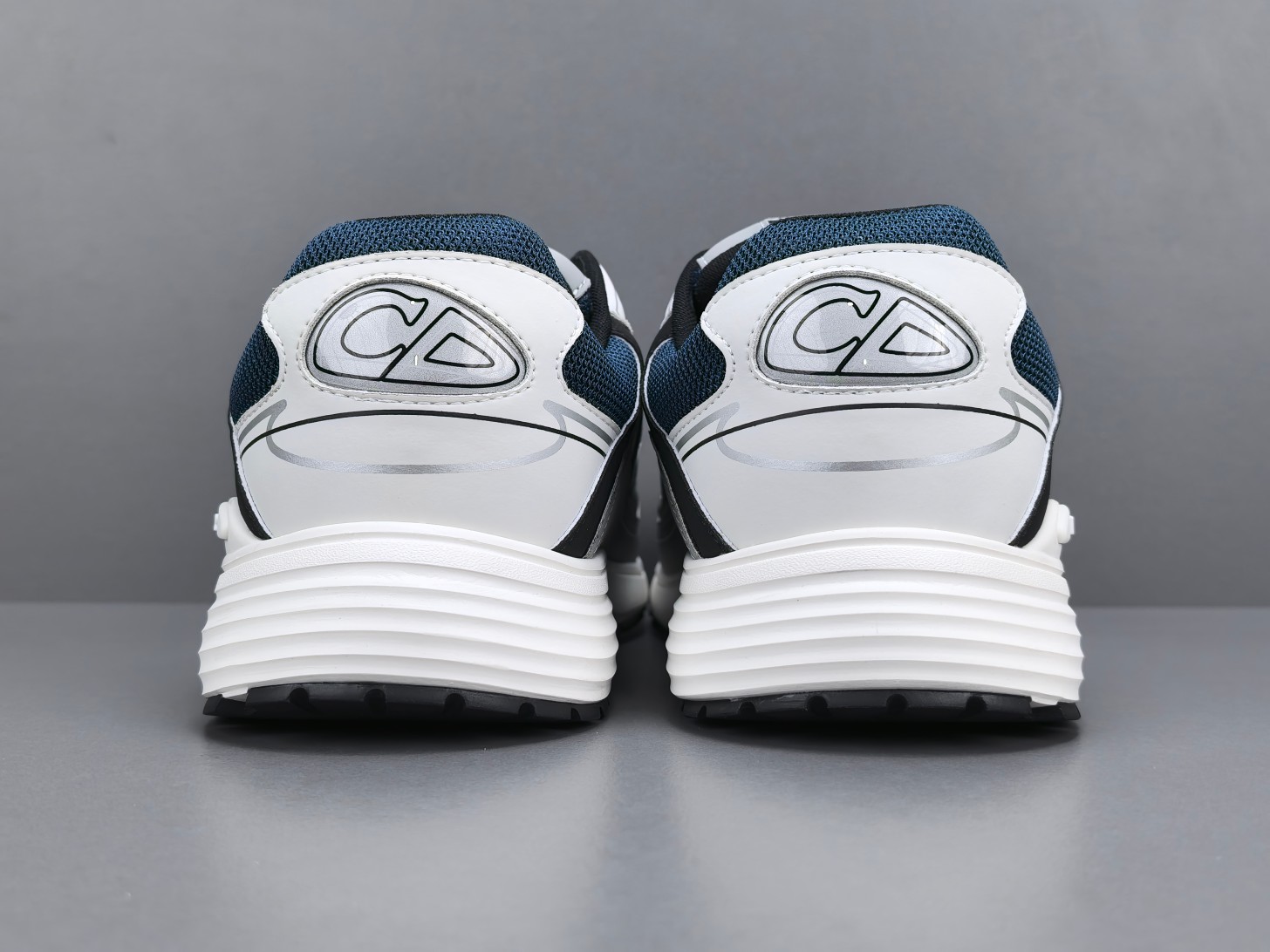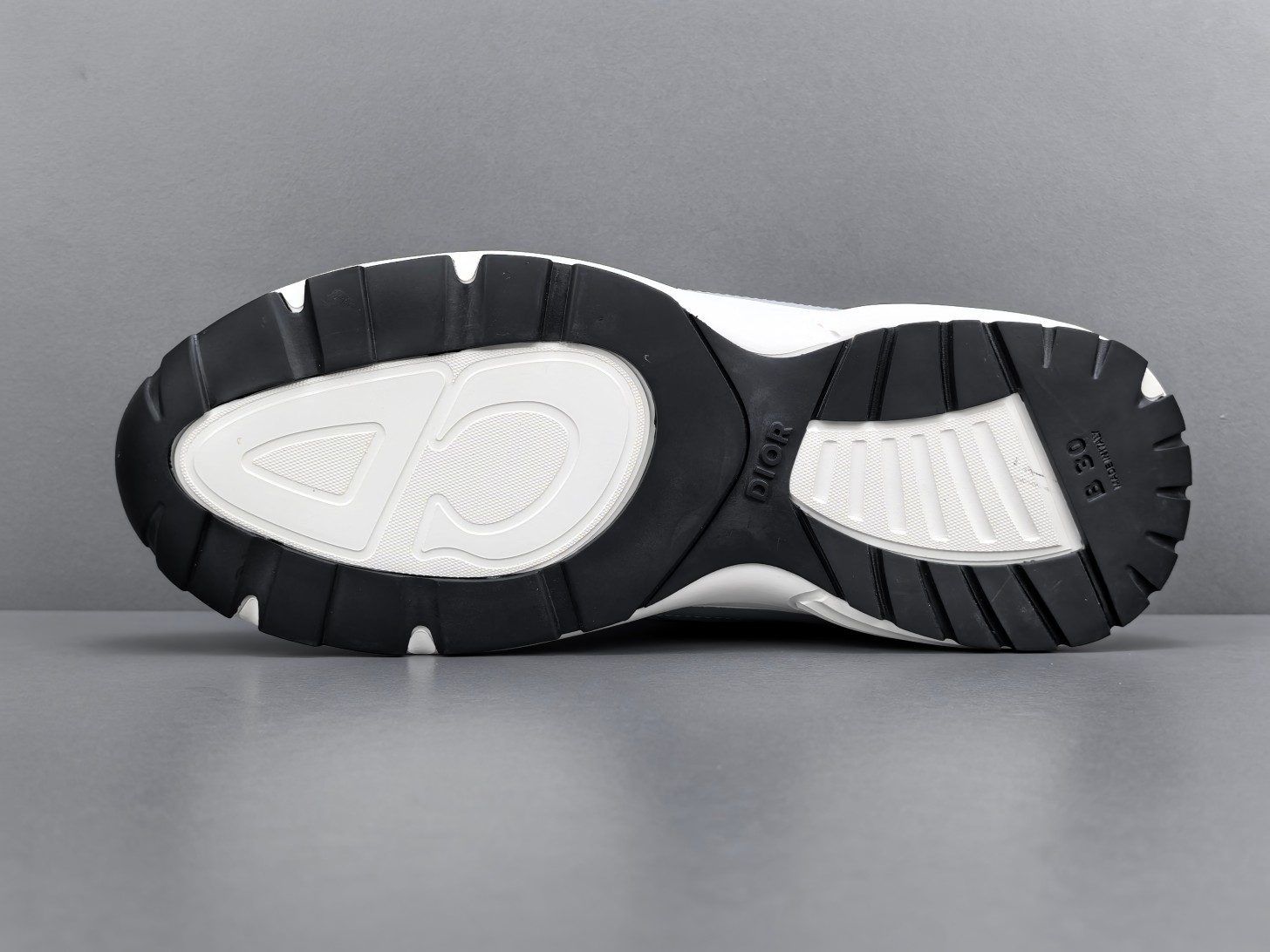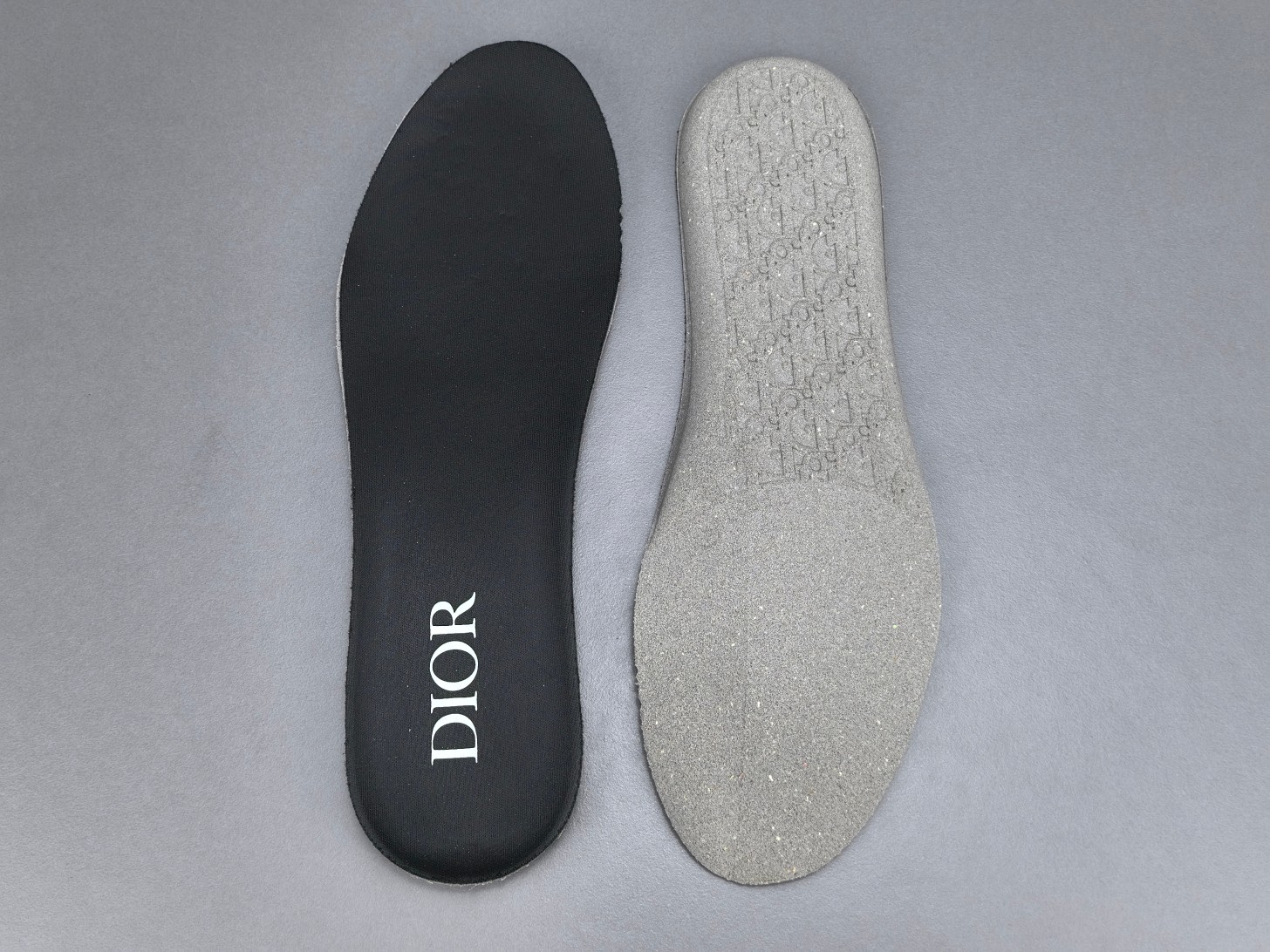 Le logo « DIOR » est discrètement intégré sur le côté de la sneaker, affirmant l’identité de la marque tout en restant minimaliste. La semelle extérieure est en caoutchouc, conçue pour offrir une bonne adhérence et une résistance à l’usure prolongée. Elle est également ornée d’un motif évoquant les emblématiques cannages Dior, ajoutant une dimension texturale et un lien avec l’héritage de la maison.