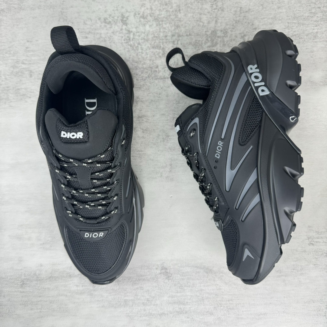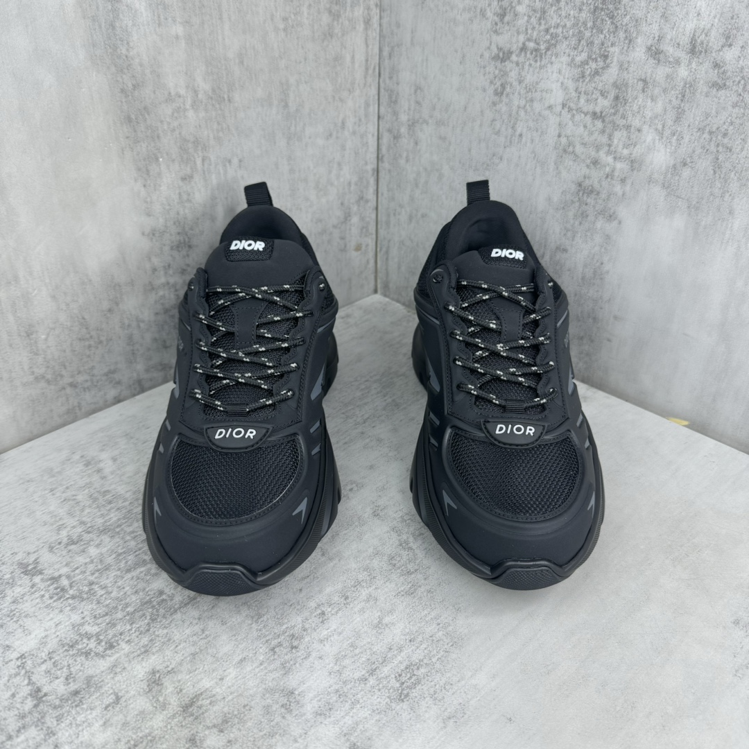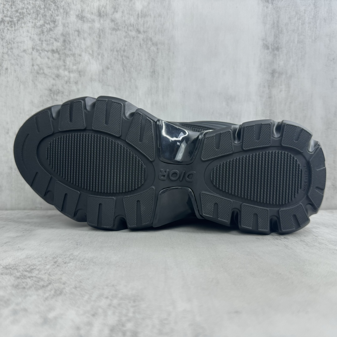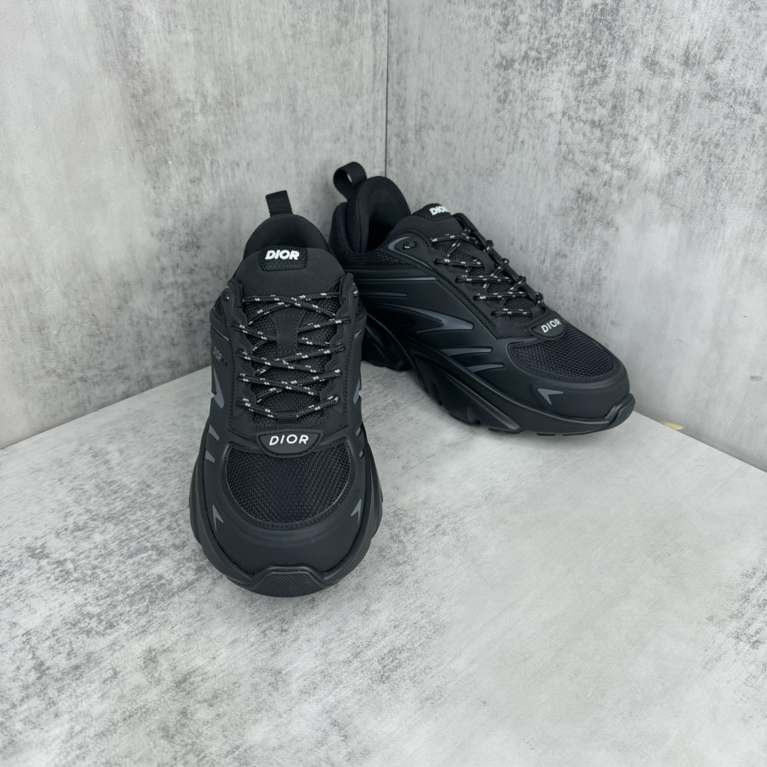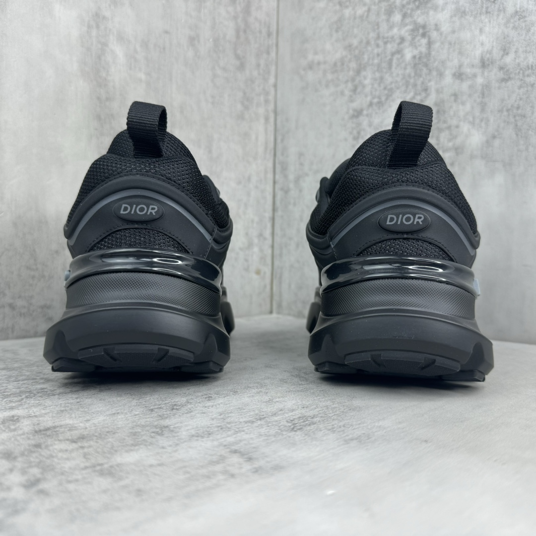 La tige de la sneaker est réalisée en cuir noir de première qualité, offrant une texture lisse et un aspect raffiné. Les détails en mesh ajoutent une touche de modernité et assurent une respirabilité optimale, tandis que les finitions soignées témoignent de l’attention portée aux détails par les artisans de Dior.