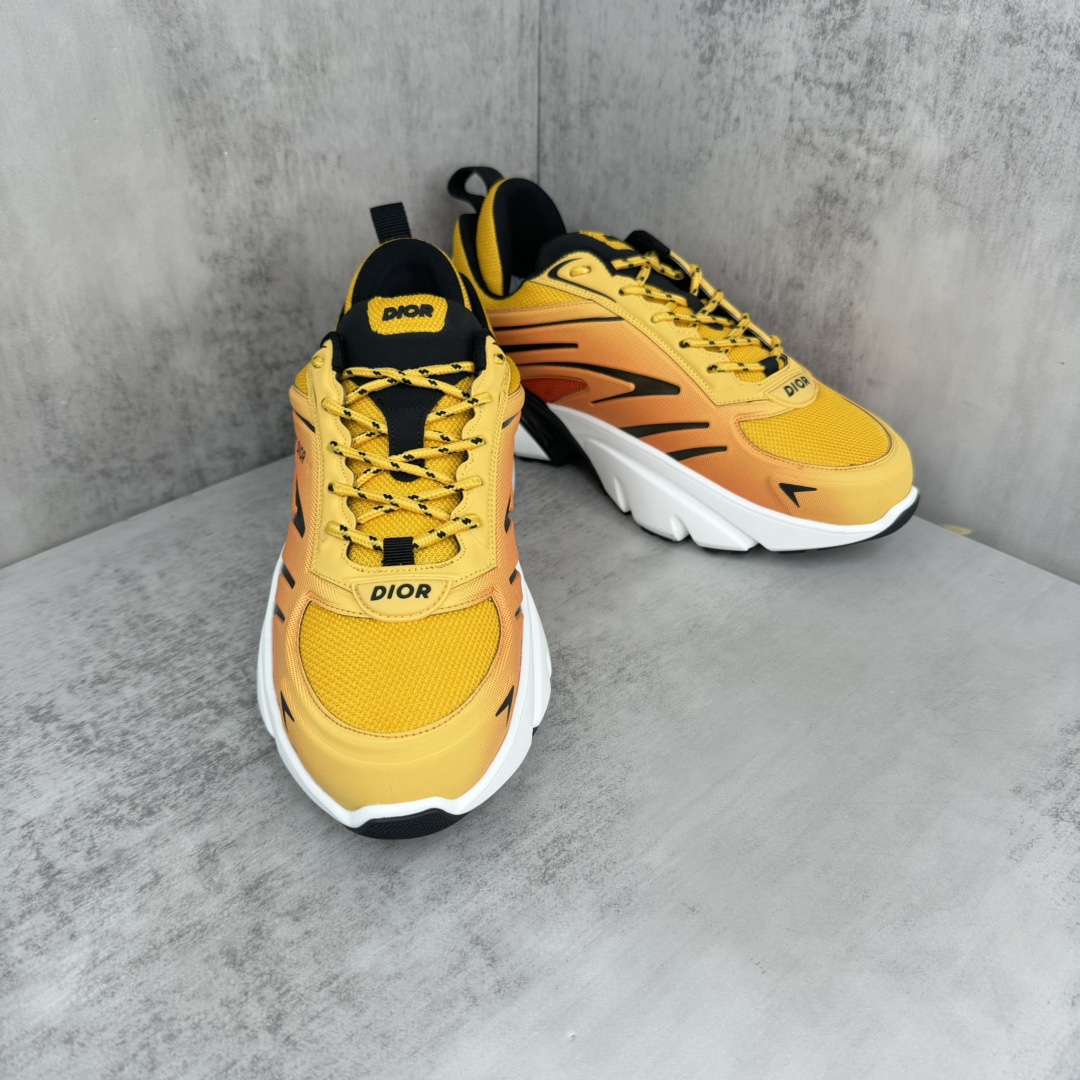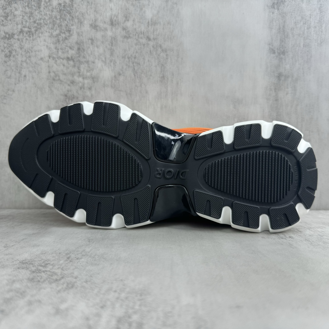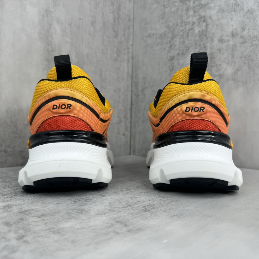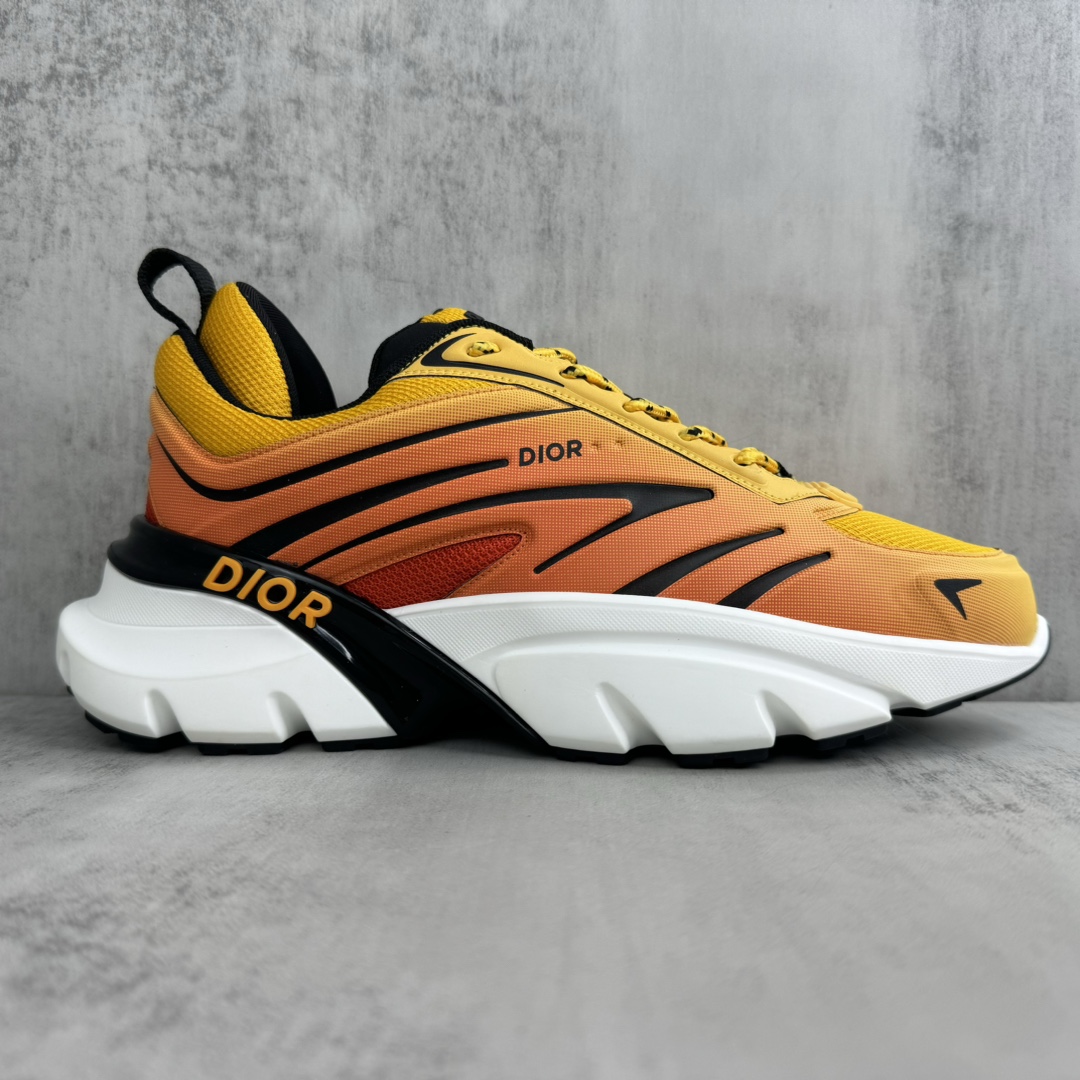 La tige de la chaussure est fabriquée à partir de matériaux de haute qualité, assurant à la fois confort et durabilité. Le dégradé orange est subtilement intégré, créant un effet visuel dynamique qui évoque la vitesse et l’énergie, en parfaite harmonie avec l’esprit de la course automobile. Les détails de finition sont soignés, avec des coutures précises et des éléments de design qui reflètent le savoir-faire artisanal de Dior.