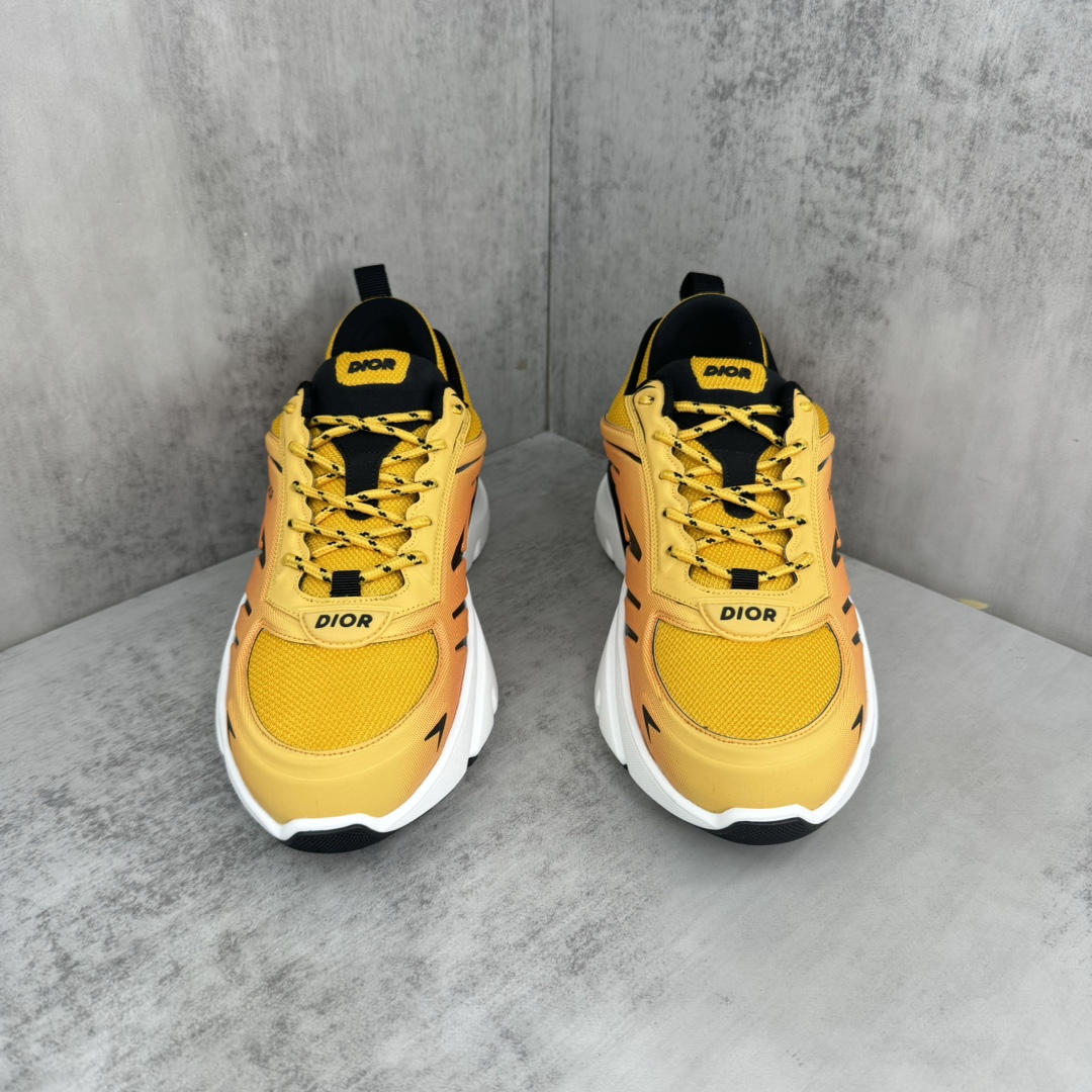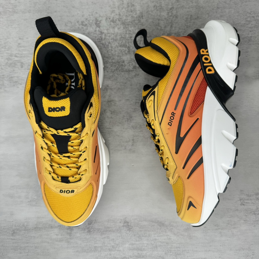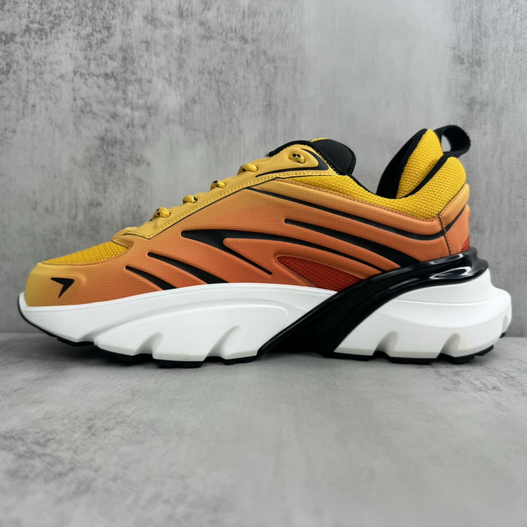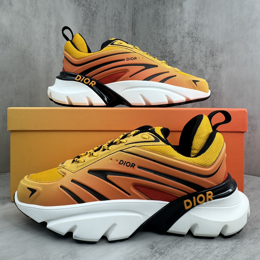 La tige de la chaussure est fabriquée à partir de matériaux de haute qualité, assurant à la fois confort et durabilité. Le dégradé orange est subtilement intégré, créant un effet visuel dynamique qui évoque la vitesse et l’énergie, en parfaite harmonie avec l’esprit de la course automobile. Les détails de finition sont soignés, avec des coutures précises et des éléments de design qui reflètent le savoir-faire artisanal de Dior.