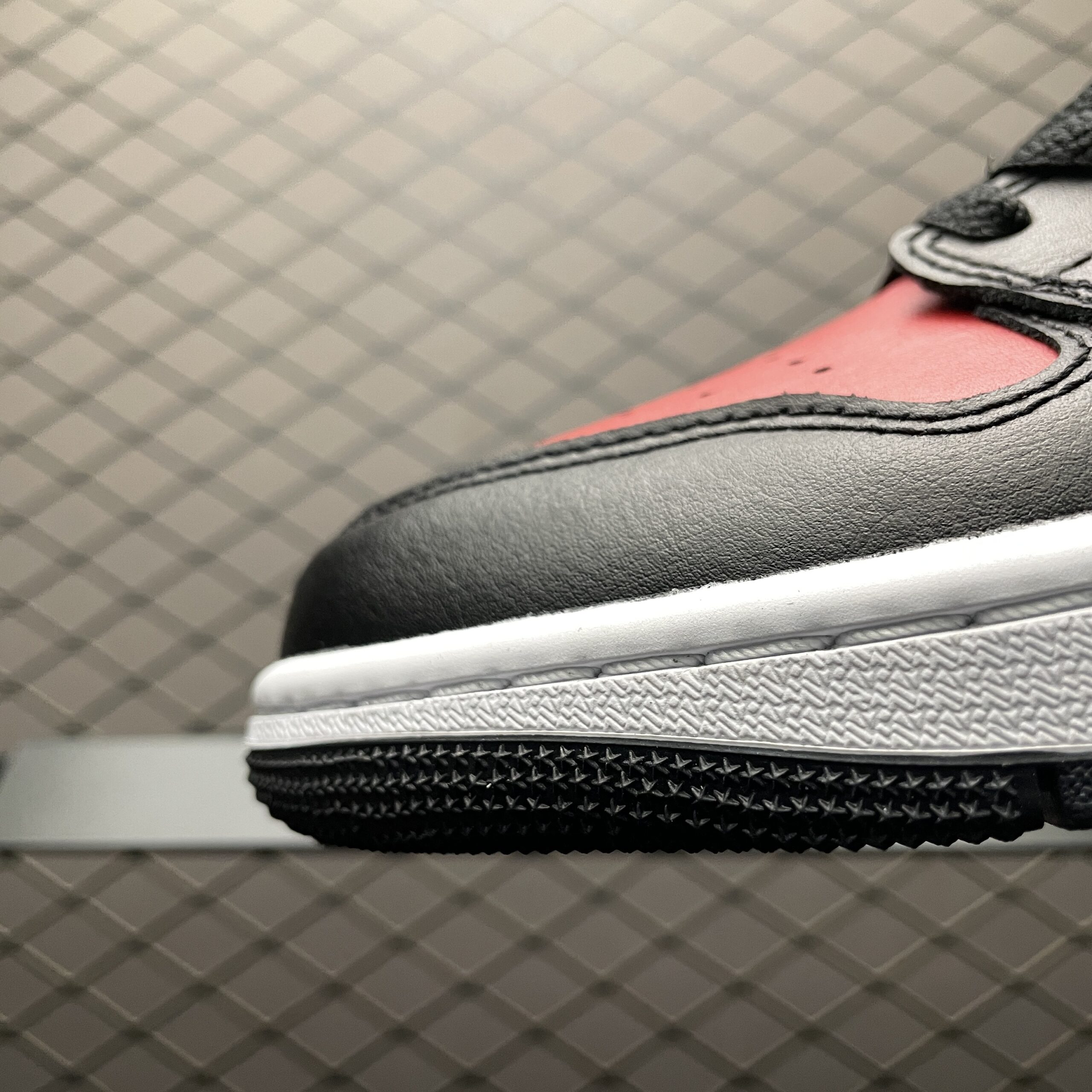 La tige de la Jordan 1 Low Bred Twist est confectionnée en cuir de haute qualité, offrant à la fois durabilité et confort. Le coloris se compose principalement de noir, avec des accents rouges audacieux qui soulignent les contours de la chaussure, créant un contraste saisissant. Le logo emblématique de la marque, le Swoosh de Nike, est présent sur les côtés, tandis que le logo Wings est discrètement apposé à l’arrière, ajoutant une touche de sophistication.