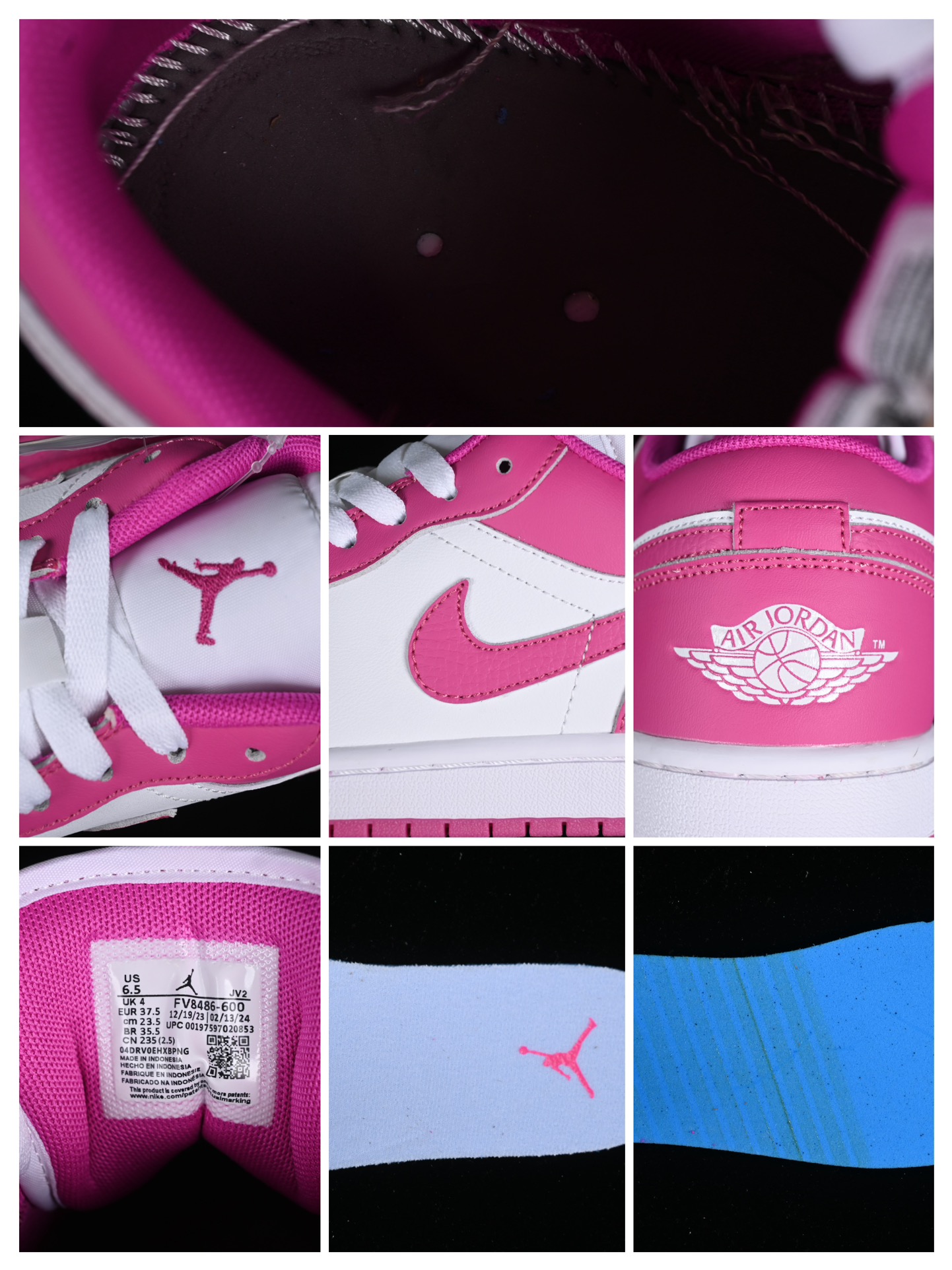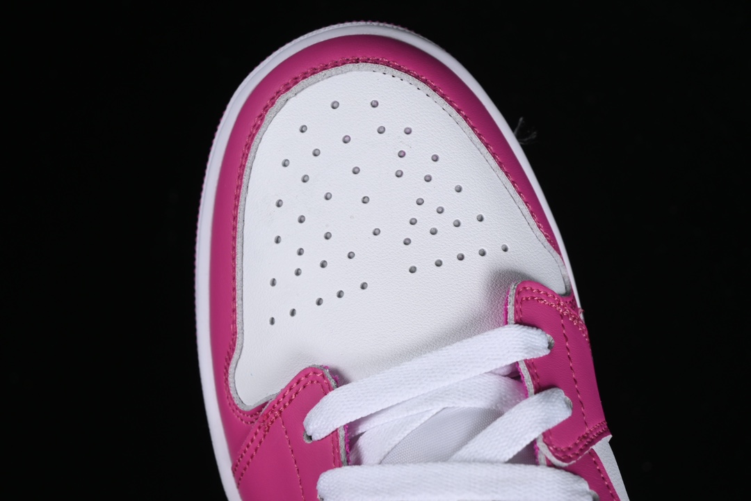 La tige de la chaussure est principalement fabriquée en cuir de haute qualité, garantissant à la fois durabilité et confort. Le rose vif, nommé « Fire Pink », domine la majorité de la chaussure, contrasté par des empiècements en cuir noir sur le bout (toe box), le swoosh (logo Nike latéral), et autour de la cheville. Des touches de blanc sur les panneaux latéraux et la languette offrent un contraste supplémentaire, tandis que le logo de Jordan, représenté par le célèbre « Jumpman », est brodé sur la languette en noir.