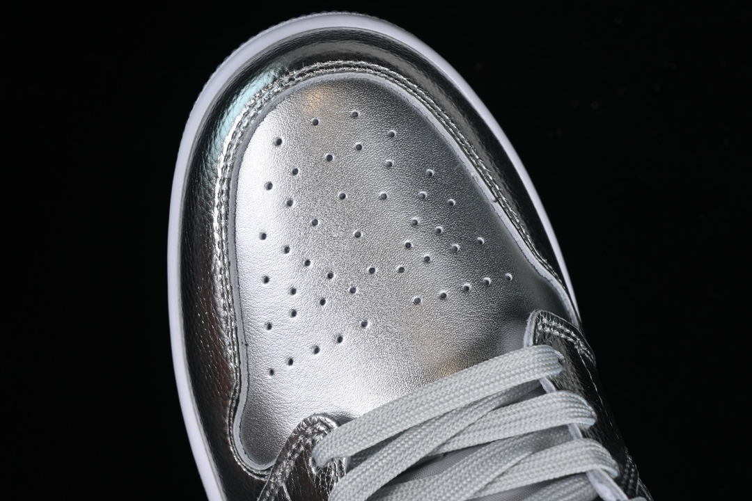 Les détails supplémentaires incluent le logo Air Jordan Wings sur le talon, également en finition métallique argentée, et des lacets noirs qui complètent le design épuré de la chaussure. La Jordan 1 Low SE Metallic Silver FN5030-001 est une sneaker polyvalente qui peut être portée aussi bien pour le sport que dans un contexte casual, alliant style emblématique et confort moderne.