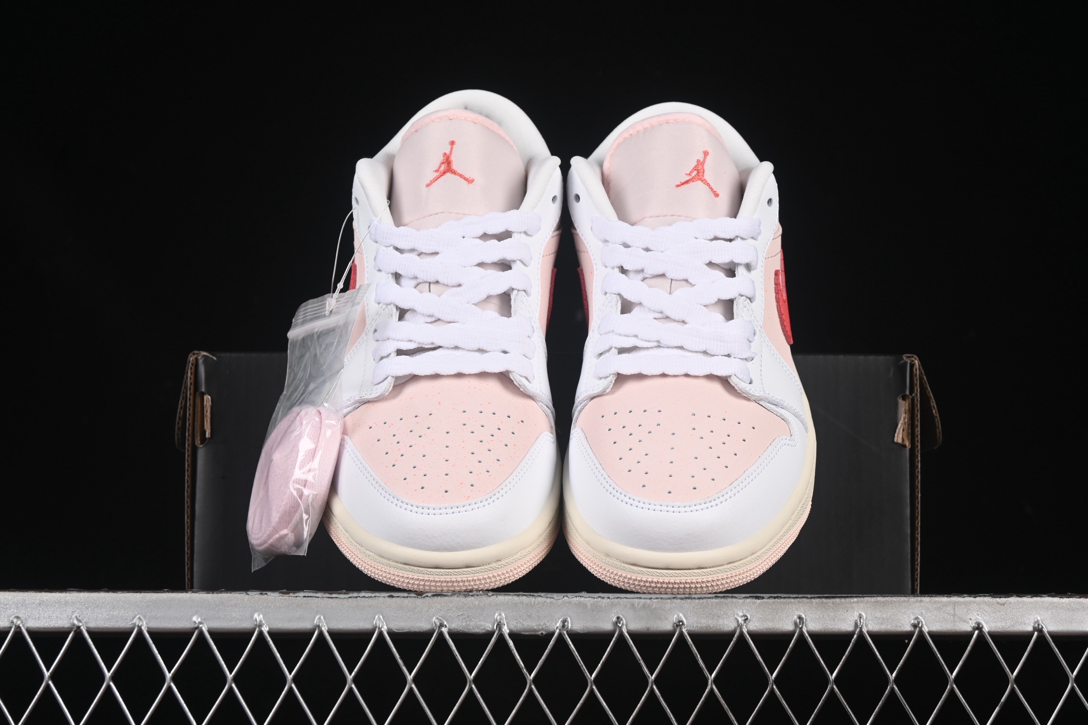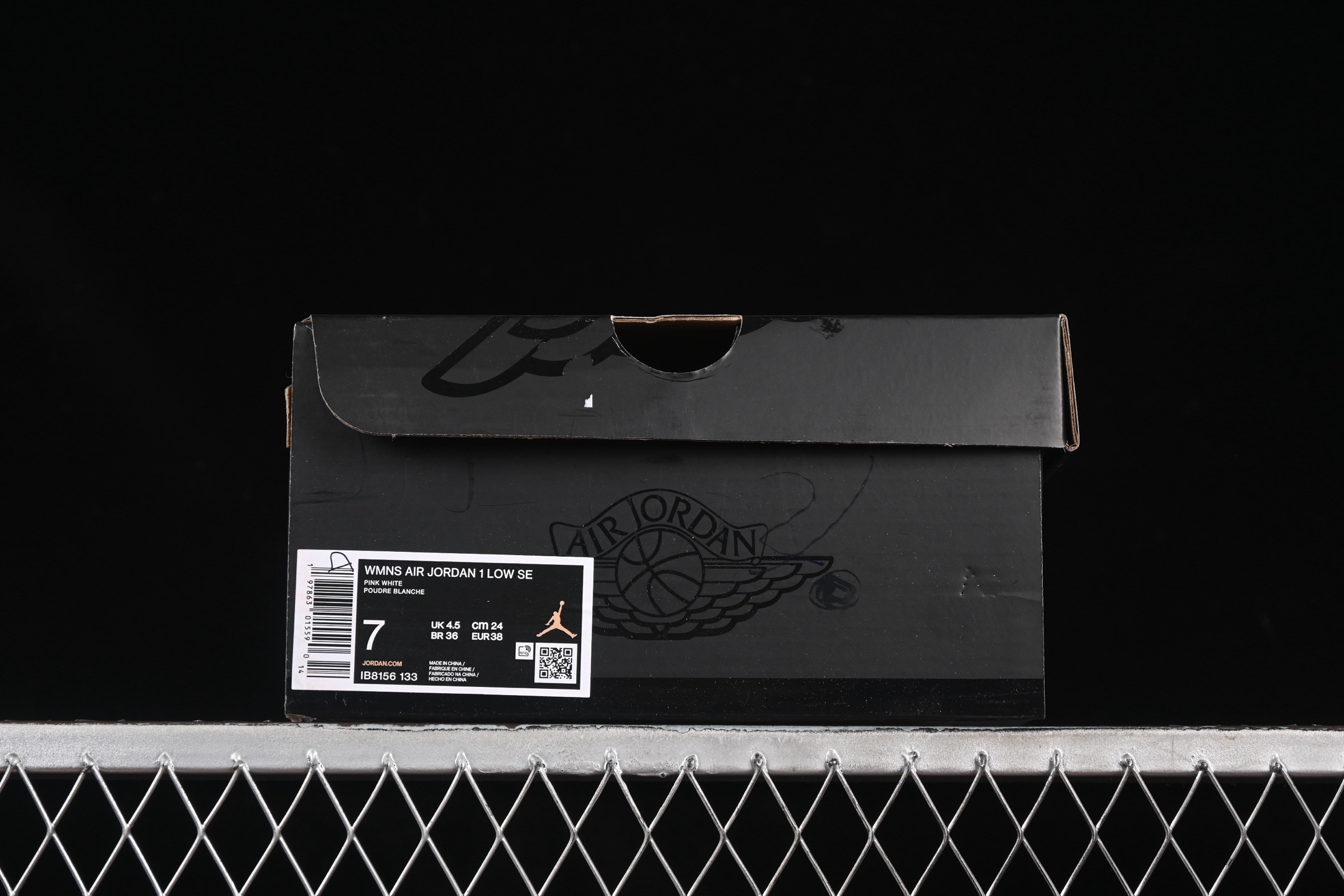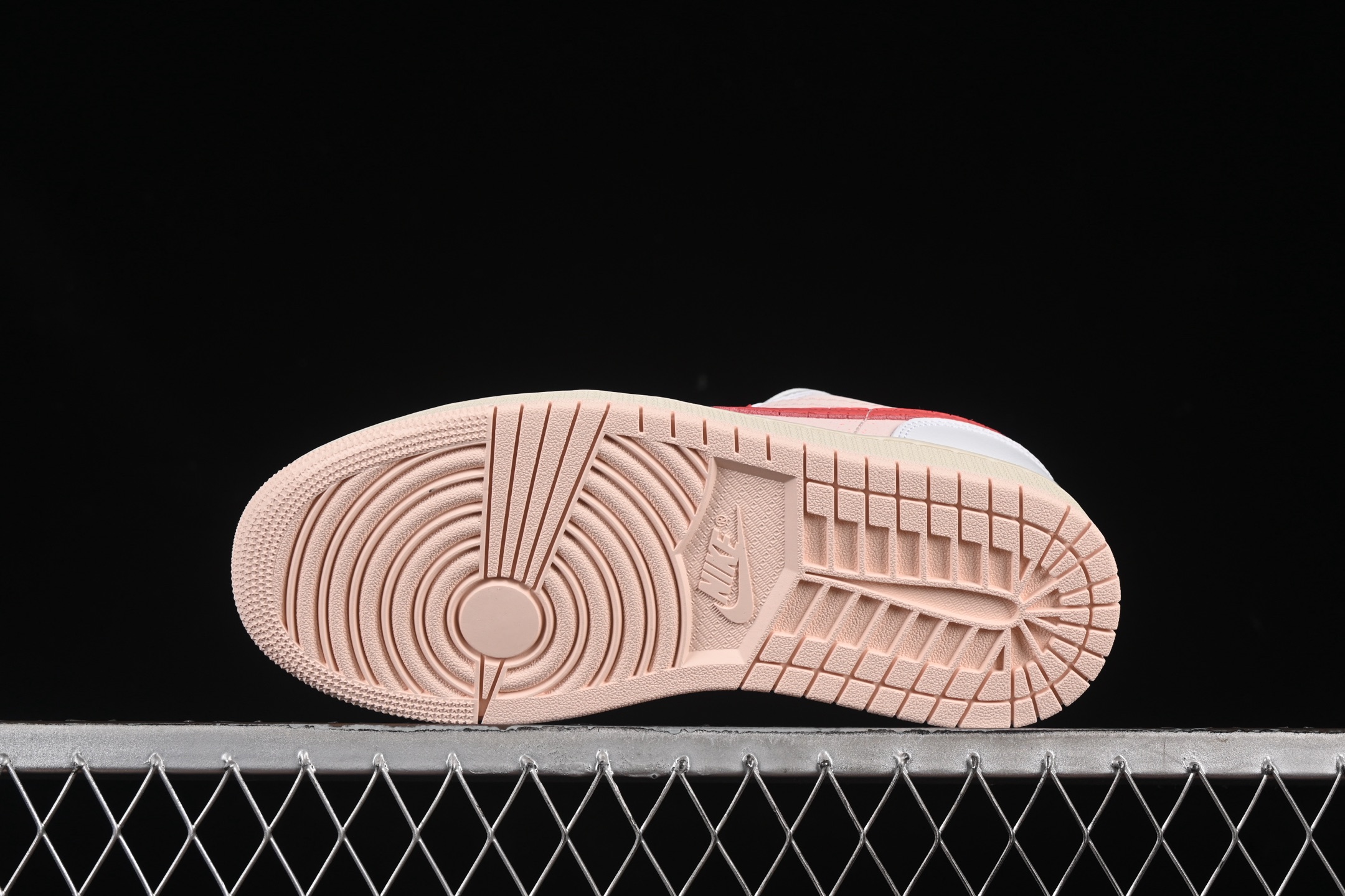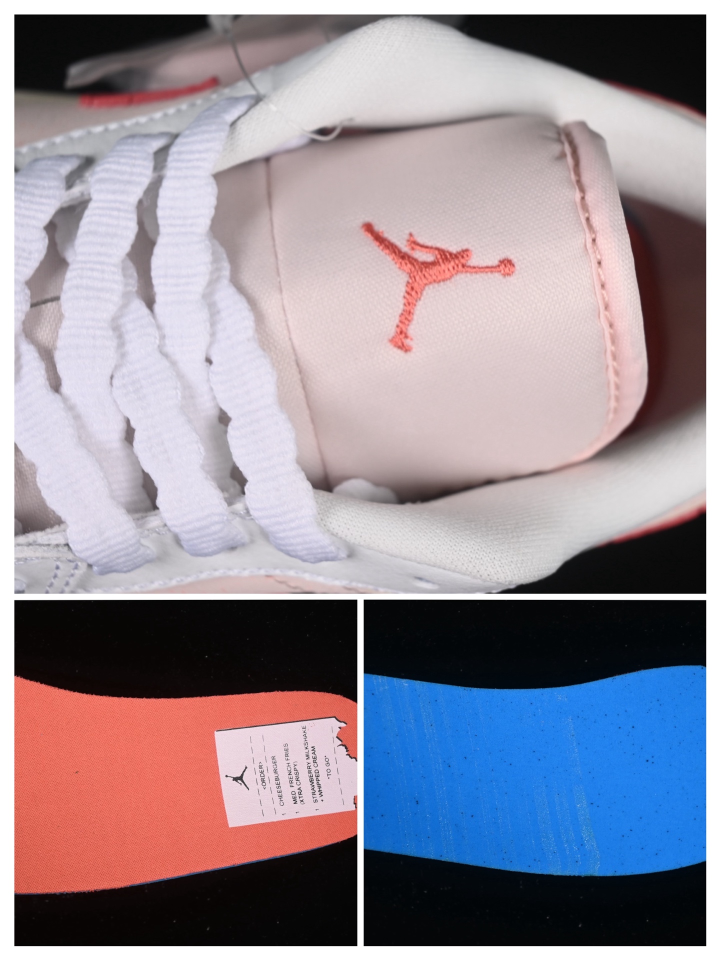 La semelle intermédiaire blanche contraste élégamment avec la semelle extérieure rose, qui assure une adhérence optimale grâce à son motif de traction bien conçu. Cette combinaison de couleurs et de matériaux fait de la Jordan 1 Low SE « Strawberry Milkshake » un choix parfait pour ceux qui recherchent à la fois style et confort.