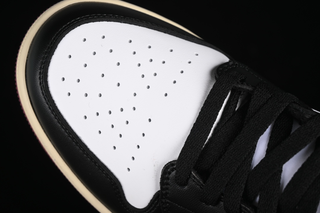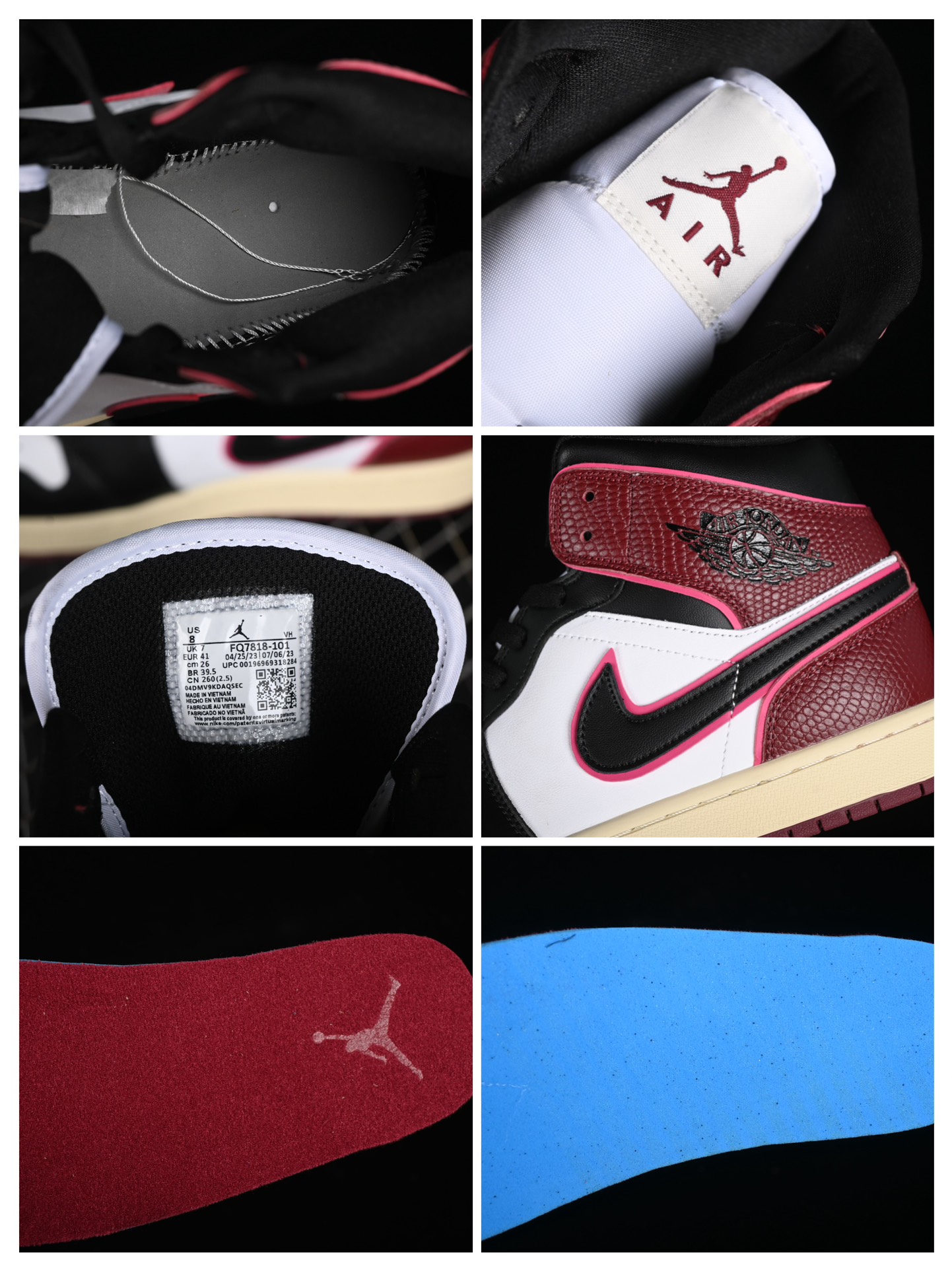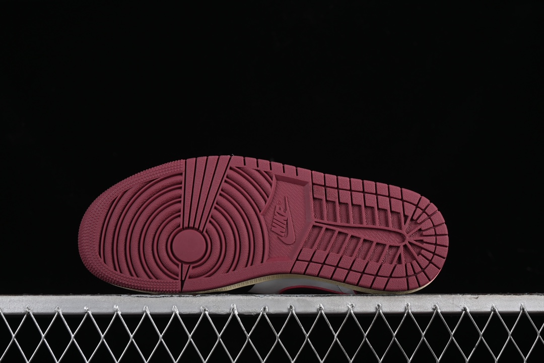 La tige est fabriquée principalement en cuir de haute qualité, offrant à la fois durabilité et confort. Le cuir bordeaux est utilisé sur les panneaux latéraux et autour de la cheville, tandis que le cuir blanc est appliqué sur la toe box, le milieu du pied et le talon. Des touches de noir sont également présentes, notamment sur le swoosh de Nike, le logo de la marque sur la languette et d’autres détails mineurs.