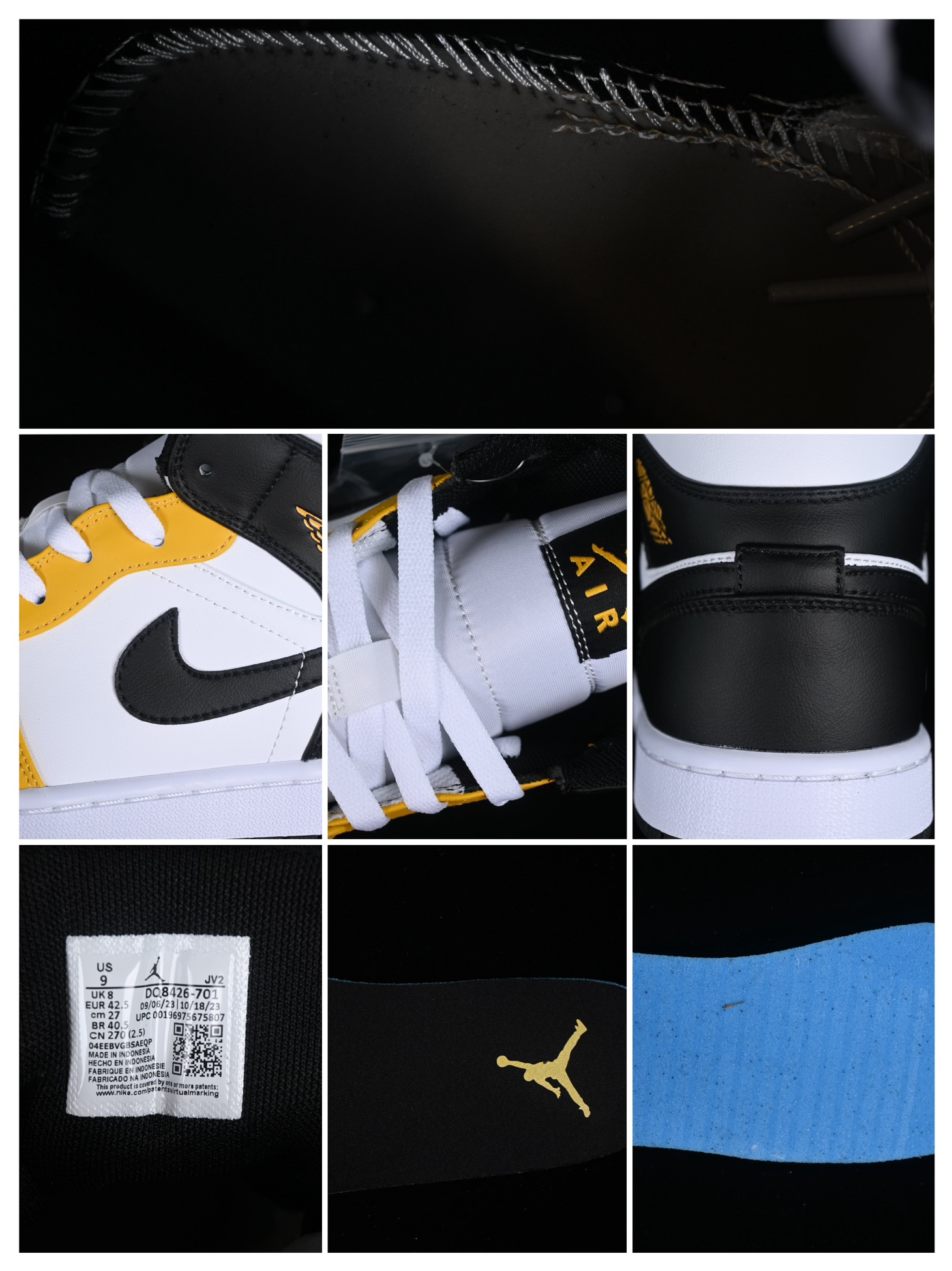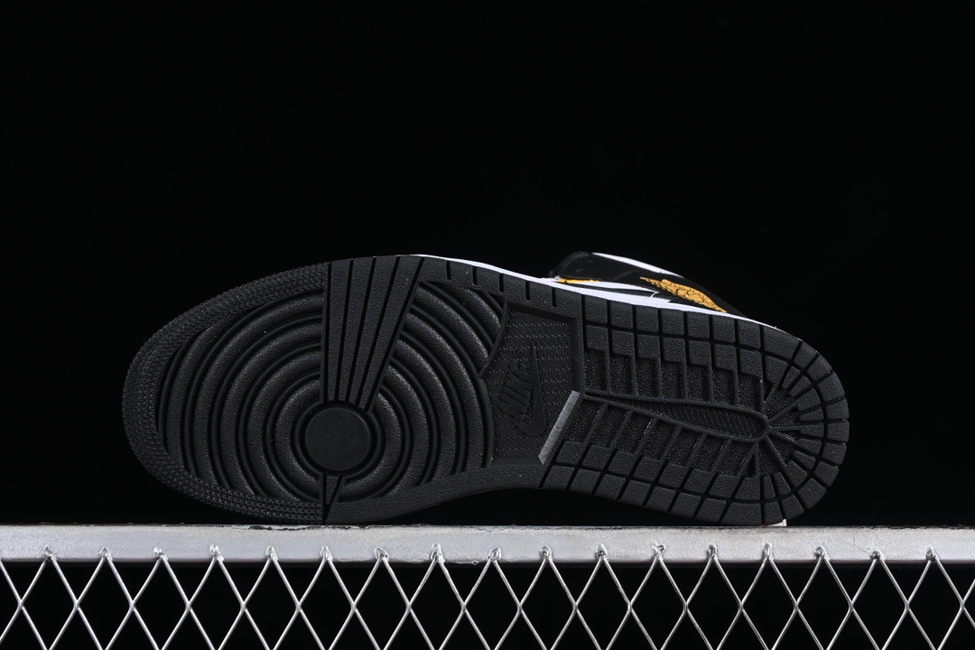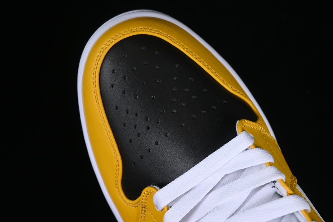 La partie supérieure de la chaussure est principalement en cuir jaune ocre, avec des inserts en cuir blanc sur les côtés et autour de la toe box. Le swoosh (logo Nike) est en cuir noir, contrastant avec le reste de la chaussure, et s’étend des côtés jusqu’à l’arrière de la sneaker. Le logo Air Jordan Wings est apposé sur le côté de la cheville, également en noir, pour un effet visuel cohérent.