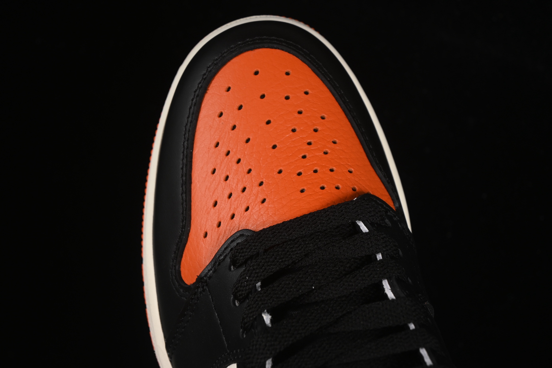 La chaussure arbore une palette de couleurs saisissante, mêlant des teintes de noir, d’orange et de blanc, qui rappellent les couleurs du maillot porté par Jordan lors de cet événement mémorable. La tige est confectionnée en cuir de haute qualité, offrant à la fois durabilité et confort. Les superpositions en cuir noir contrastent élégamment avec les panneaux orange, tandis que le logo emblématique « Swoosh » de Nike se détache sur les côtés.