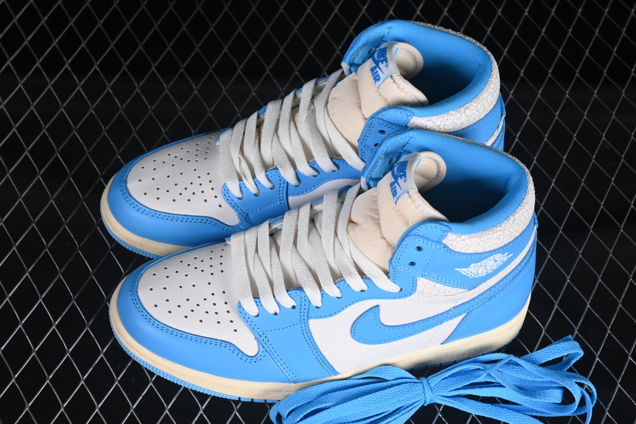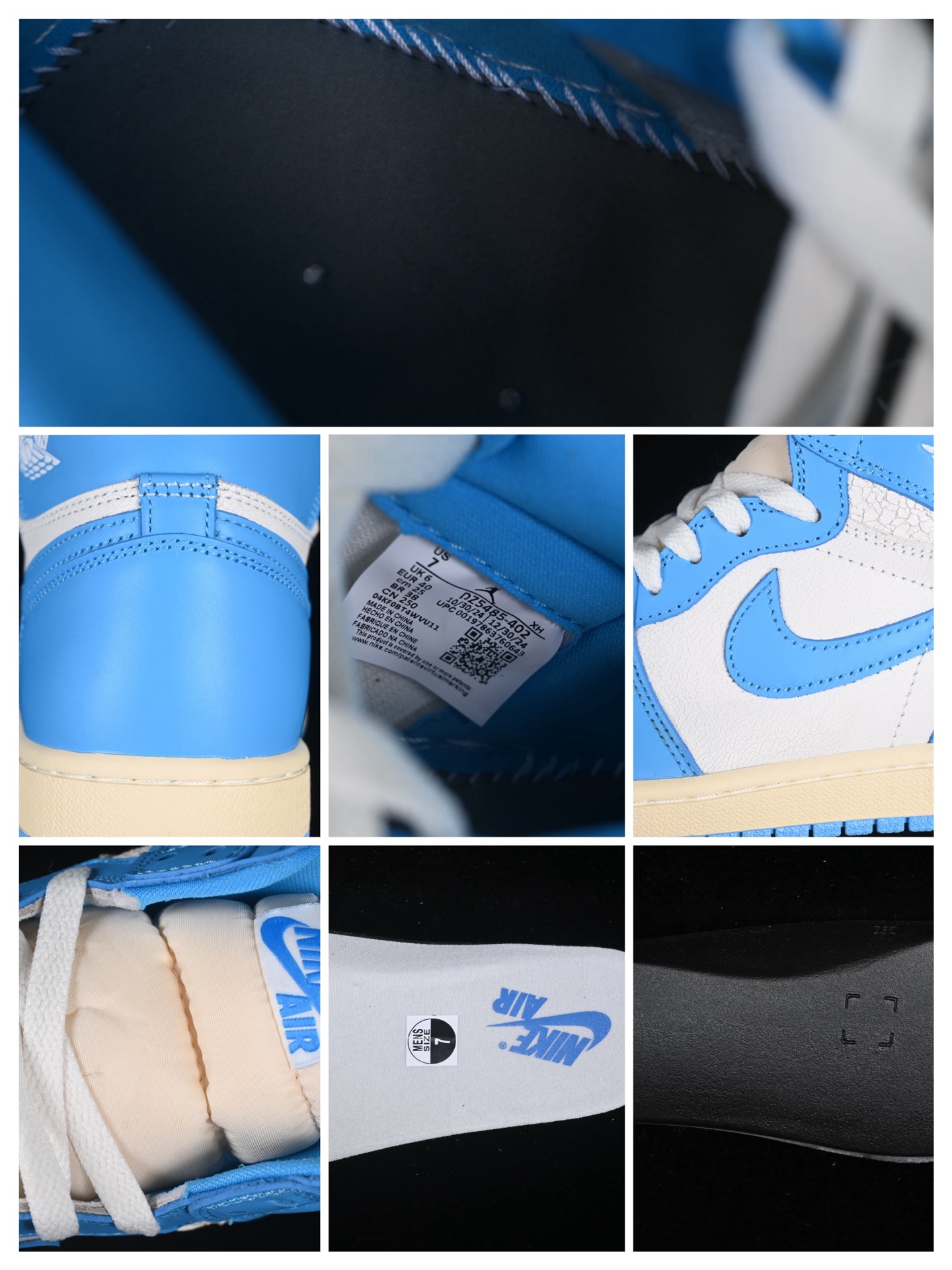 La tige de la chaussure est confectionnée en cuir de haute qualité, offrant une durabilité et un confort exceptionnels. Elle arbore une palette de couleurs inspirée des célèbres couleurs de l’équipe de l’UNC, avec des nuances de bleu ciel et de blanc qui rappellent les uniformes portés par Jordan pendant ses années universitaires. Les superpositions en cuir bleu ciel contrastent élégamment avec la base blanche, tandis que le logo emblématique « Swoosh » de Nike se détache sur les côtés.