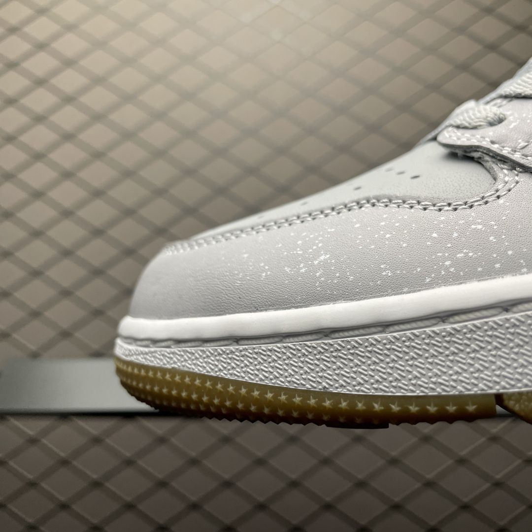 La tige est fabriquée en cuir de haute qualité, offrant à la fois durabilité et confort. Le gris « Wolf Grey » couvre la majorité de la chaussure, y compris les panneaux latéraux, la toe box, et le talon. Les swooshes sur les côtés sont également en gris, se fondant harmonieusement avec le reste de la chaussure.