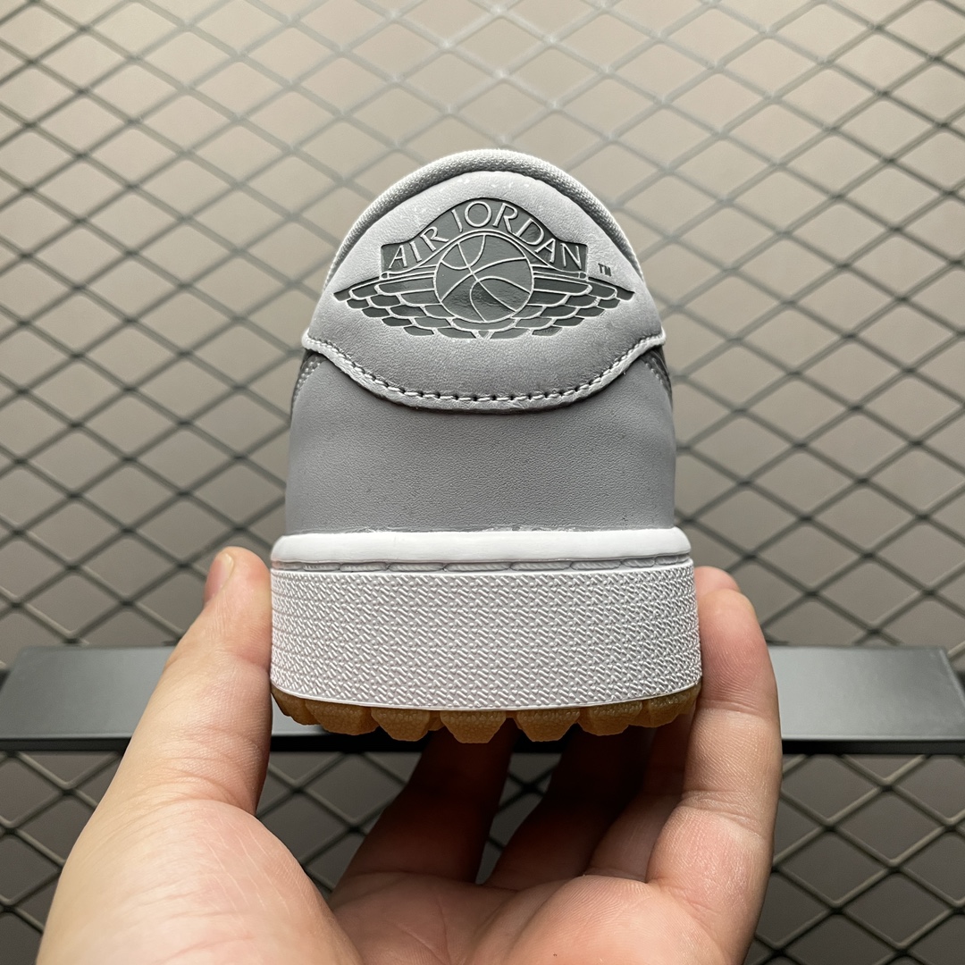 La semelle intermédiaire conserve la couleur blanche traditionnelle des Jordan 1, offrant un contraste net avec le gris de la tige. La semelle extérieure est en caoutchouc avec une finition en gomme, ce qui non seulement ajoute à l’esthétique générale, mais fournit également une traction et une stabilité accrues sur le terrain de golf.