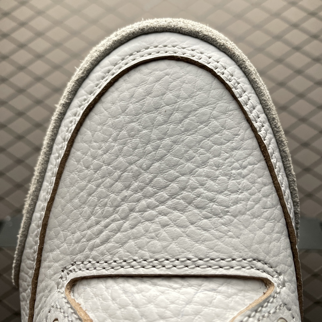 La chaussure arbore une palette de couleurs élégante, principalement composée de tons crème et blanc cassé, qui lui confère un aspect sophistiqué et intemporel. La tige est confectionnée en cuir de haute qualité, offrant à la fois durabilité et confort. Les perforations sur le dessus assurent une bonne respirabilité, tandis que les coutures soignées témoignent d’un savoir-faire artisanal.