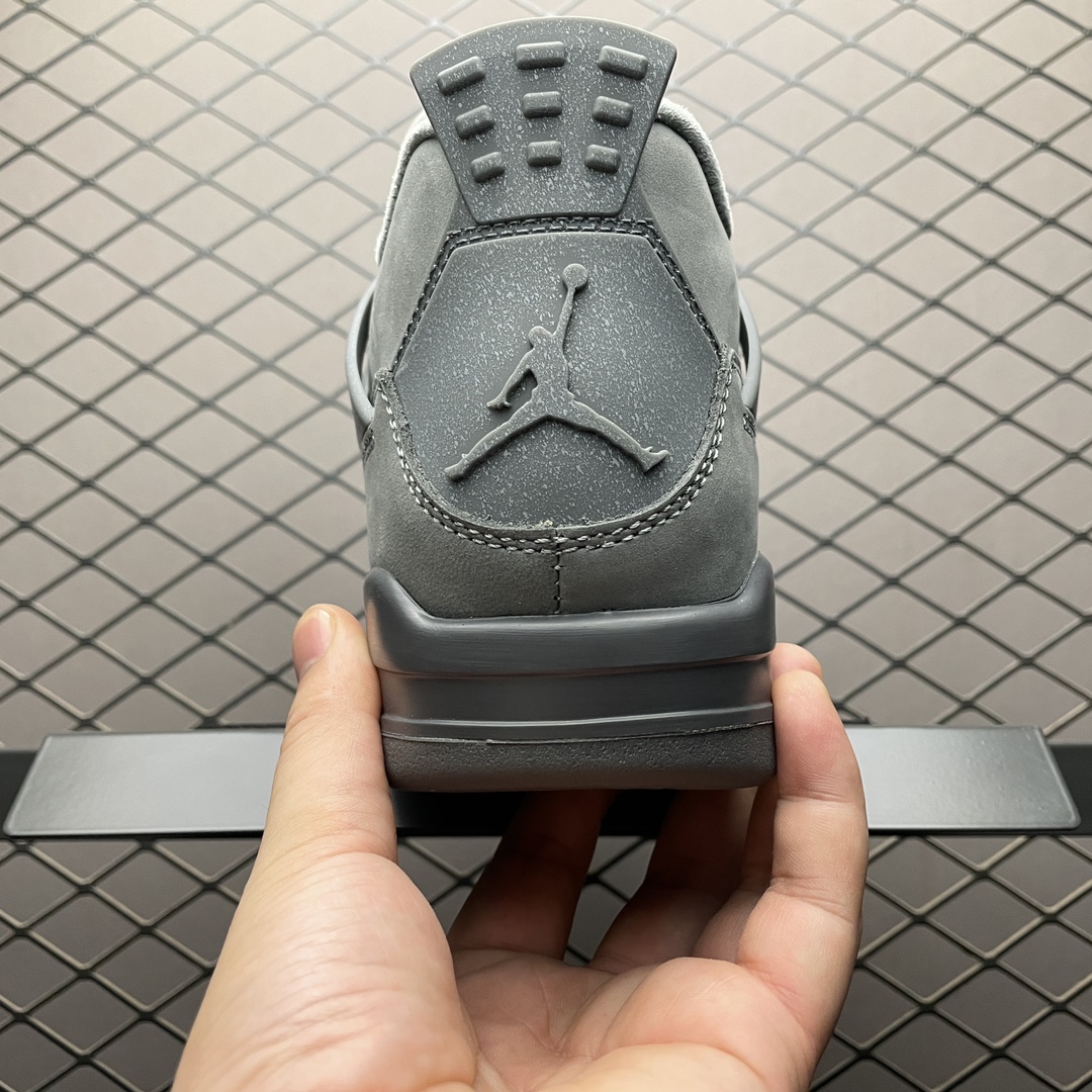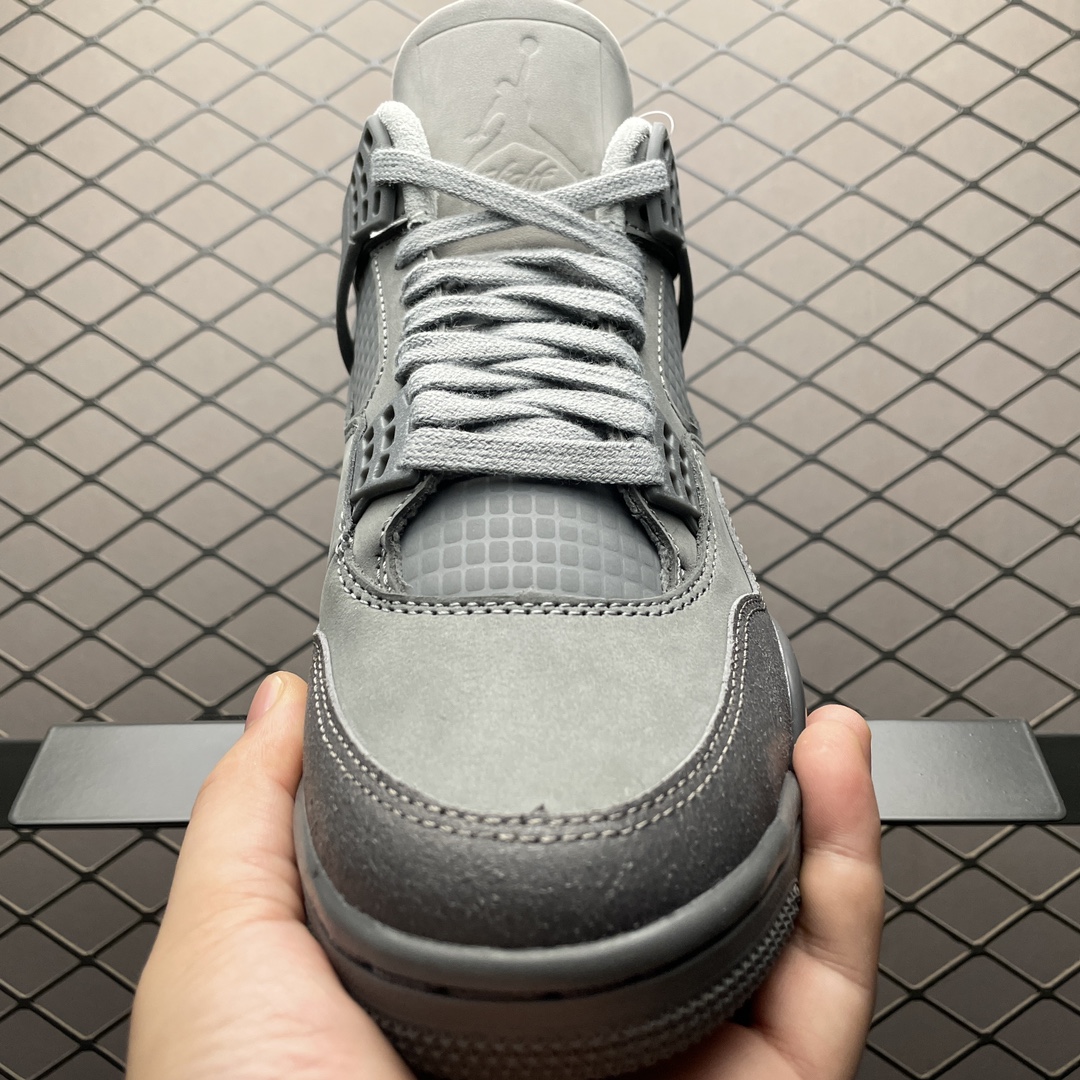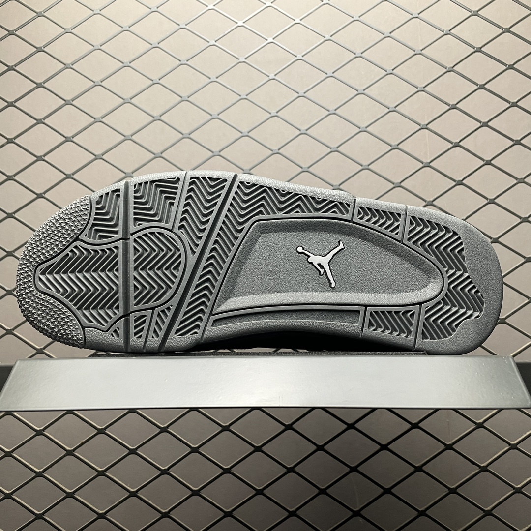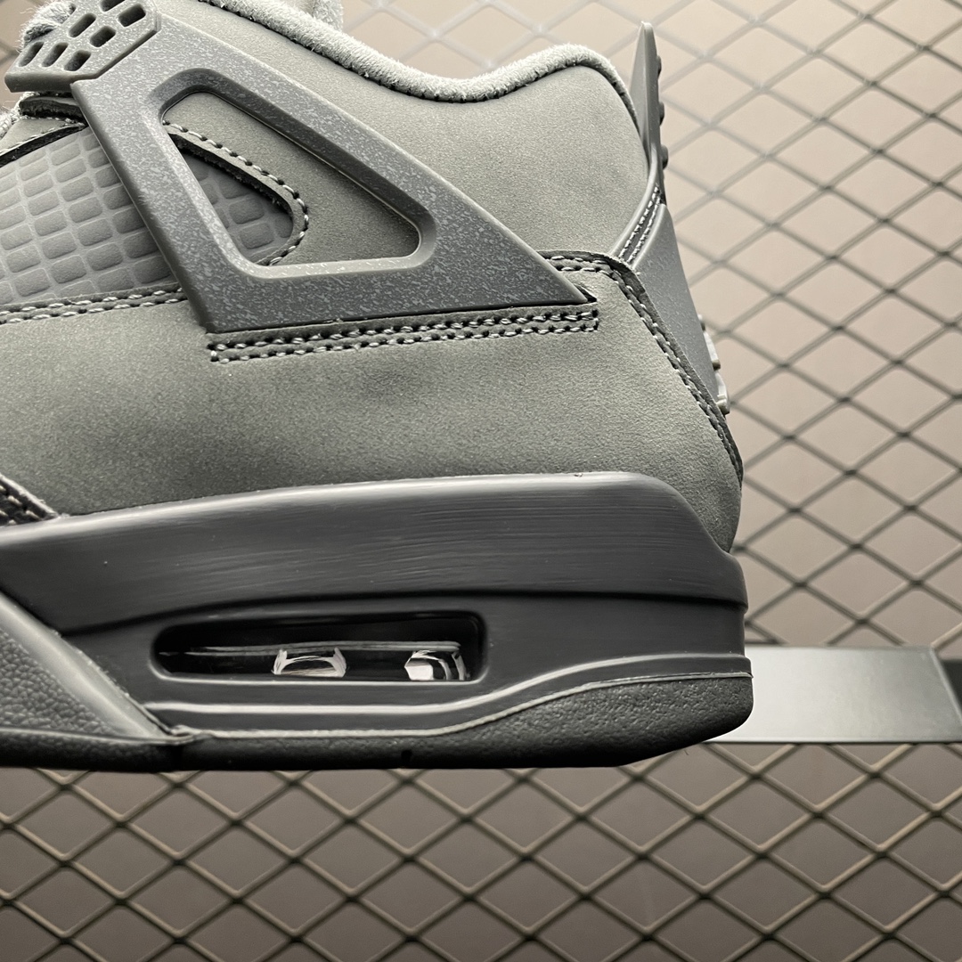 La chaussure est dotée d’une base en cuir de qualité supérieure, principalement de couleur noire, avec des accents qui peuvent varier en couleur pour ajouter un contraste dynamique. Les supports typiques en plastique des Jordan 4 se trouvent sur les côtés ainsi qu’au niveau du système de laçage, offrant à la fois un soutien structurel et un style distinctif.