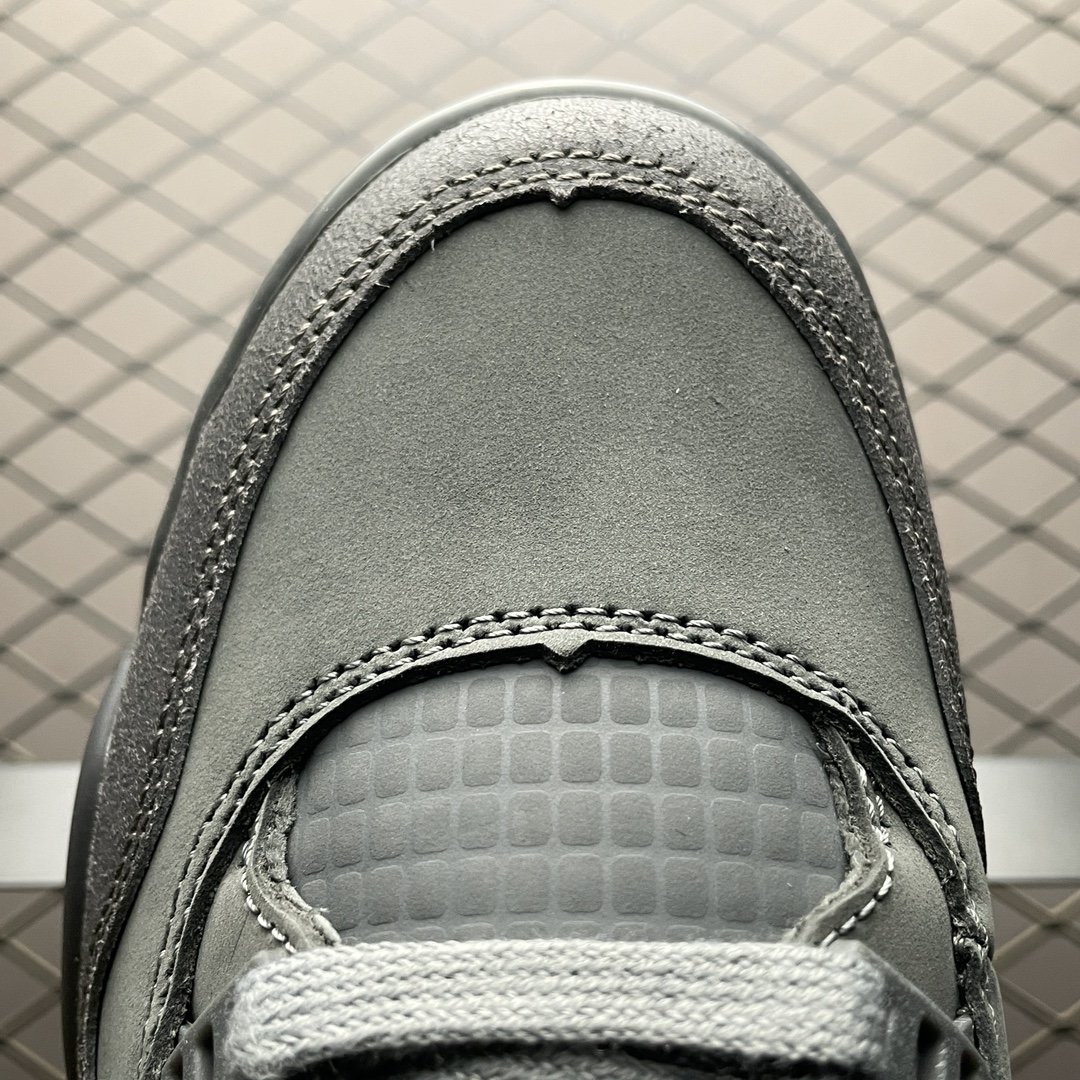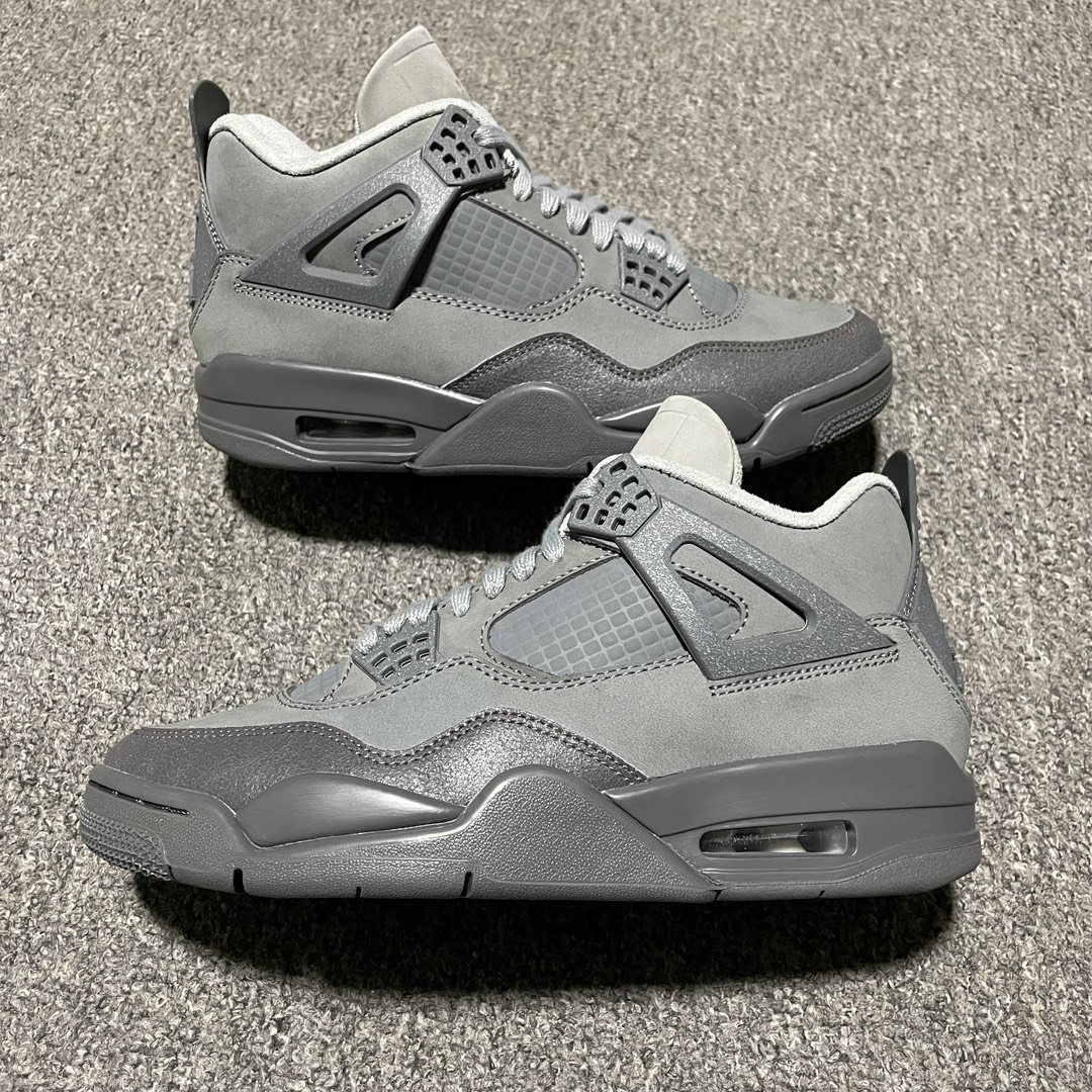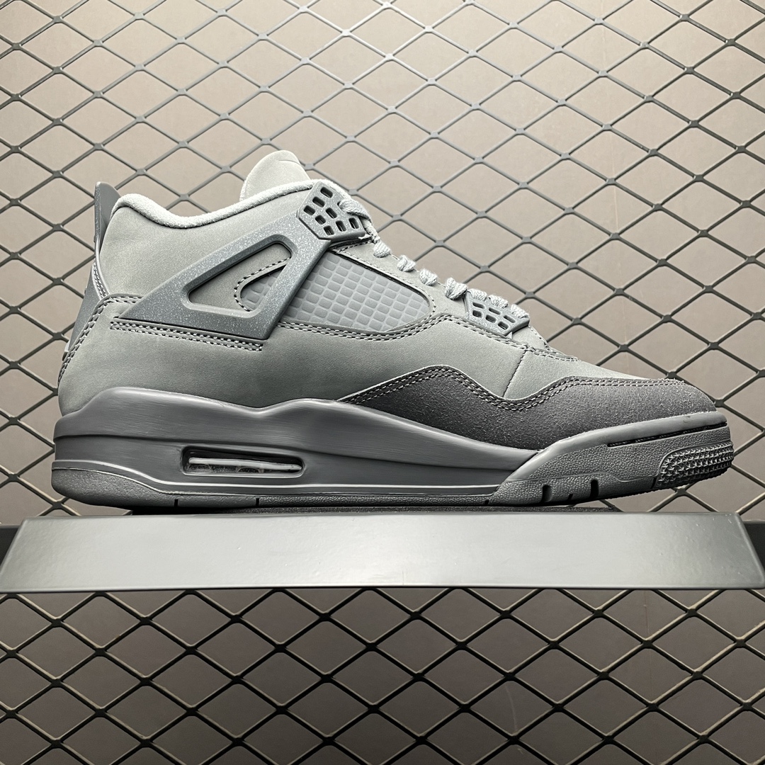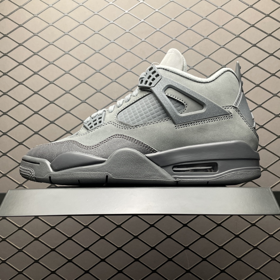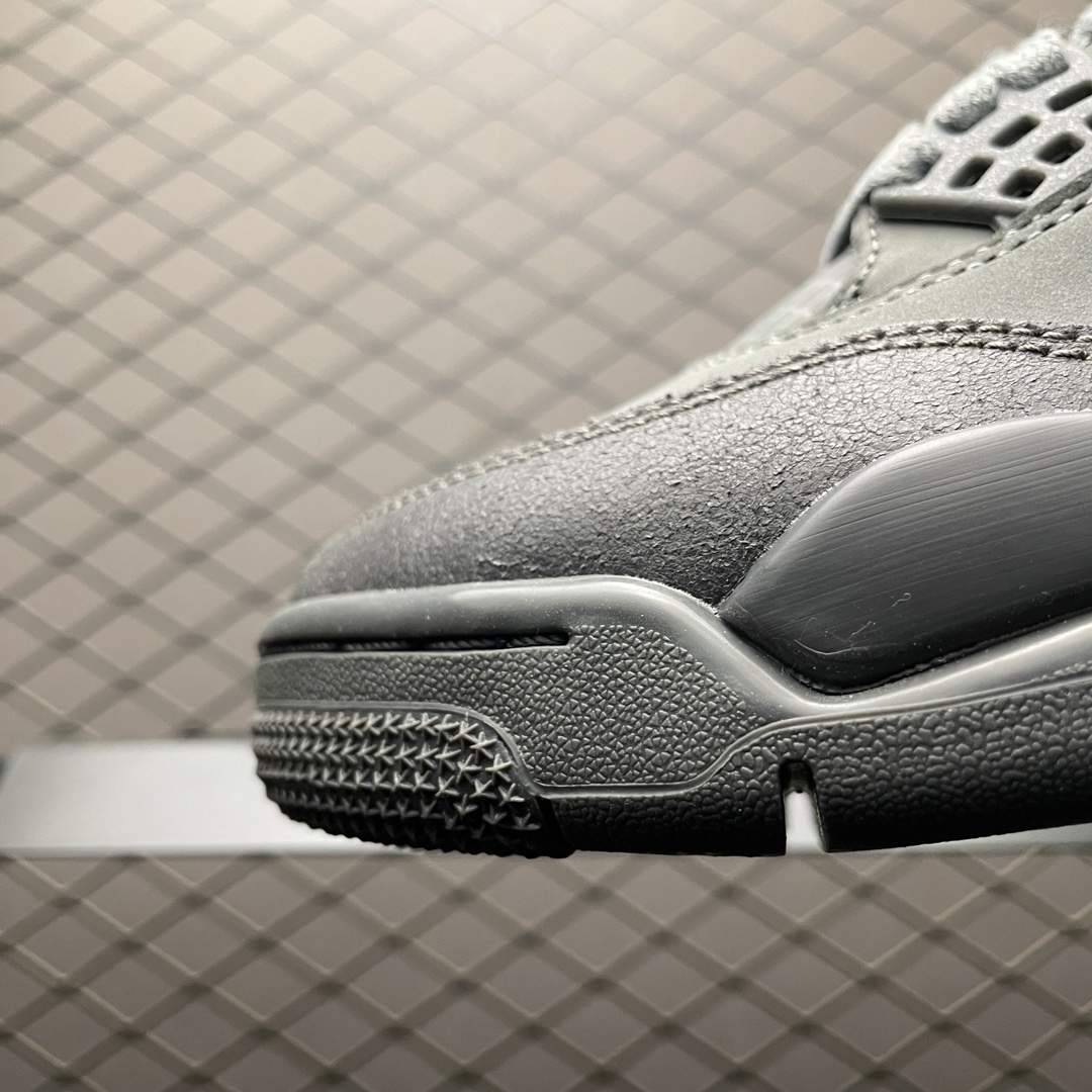La chaussure est dotée d’une base en cuir de qualité supérieure, principalement de couleur noire, avec des accents qui peuvent varier en couleur pour ajouter un contraste dynamique. Les supports typiques en plastique des Jordan 4 se trouvent sur les côtés ainsi qu’au niveau du système de laçage, offrant à la fois un soutien structurel et un style distinctif.