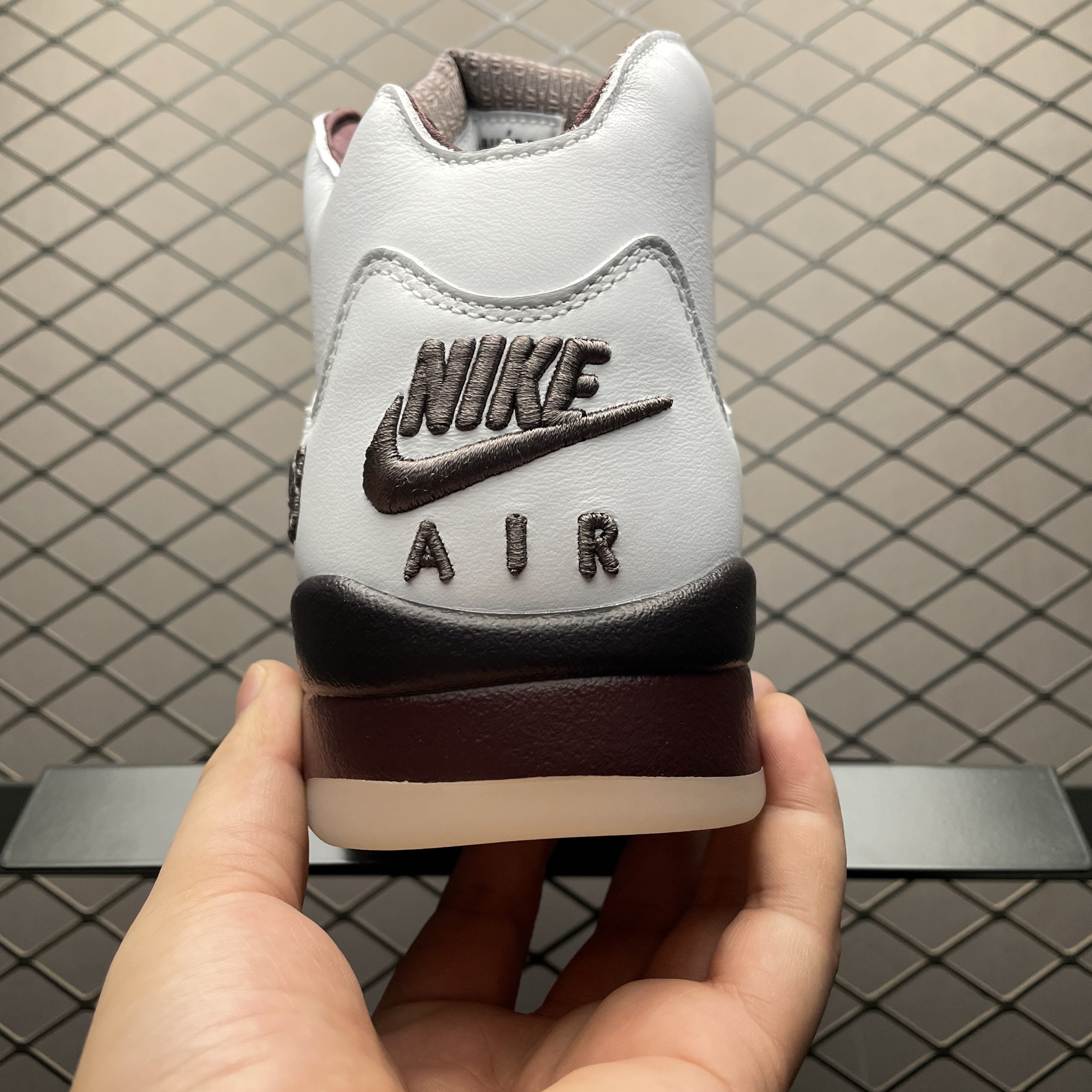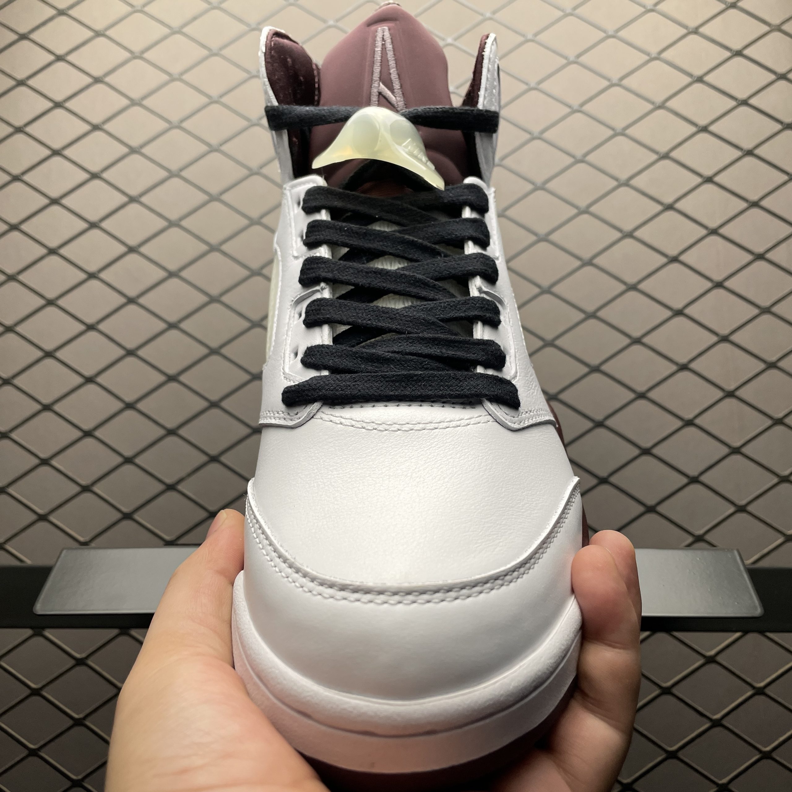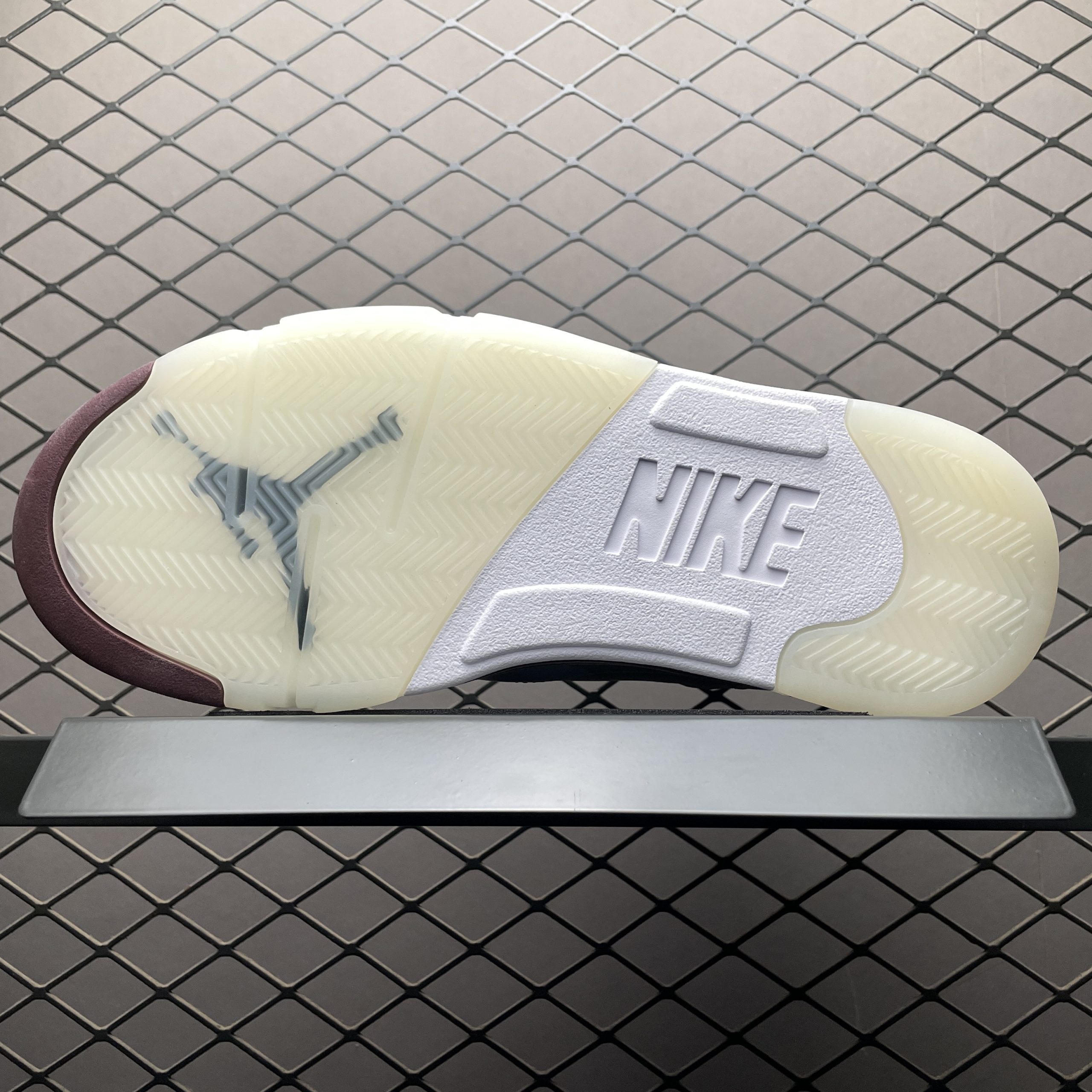 La tige de la chaussure est confectionnée en cuir de haute qualité, offrant à la fois durabilité et confort. Le cuir bordeaux est complété par des accents en daim, ajoutant une texture luxueuse et un contraste visuel intéressant. Les détails signature de la Jordan 5, tels que les œillets en plastique translucide et le filet latéral, sont présents, mais subtilement intégrés pour ne pas détourner l’attention de l’esthétique générale.